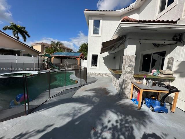 Completely renovated 4 Bedrooms and 2.5 Bathrooms plus office first floor. Gourmet kitchen with stainless-steel appliances and refrigerator- built in oven and microwave. beautiful island with seating area. Child protection fence around pool, 2 gazebos 10X10 and 16X12 and separate barbeque area. white fence around entire patio for privacy - pool equipment and a/c unit fenced for privacy. hurricane shutters and impact windows. Electrical vehicle connection inside the garage. newer A/C 5 Yrs, Renovated bathrooms and laundry area with linen closet. Low Maintenance fee includes Lawn service, cable, alarm monitoring and amenities: gated community, gym, community pool. EASY TO SHOW CONTACT LISTING AGENT. call listing agent.