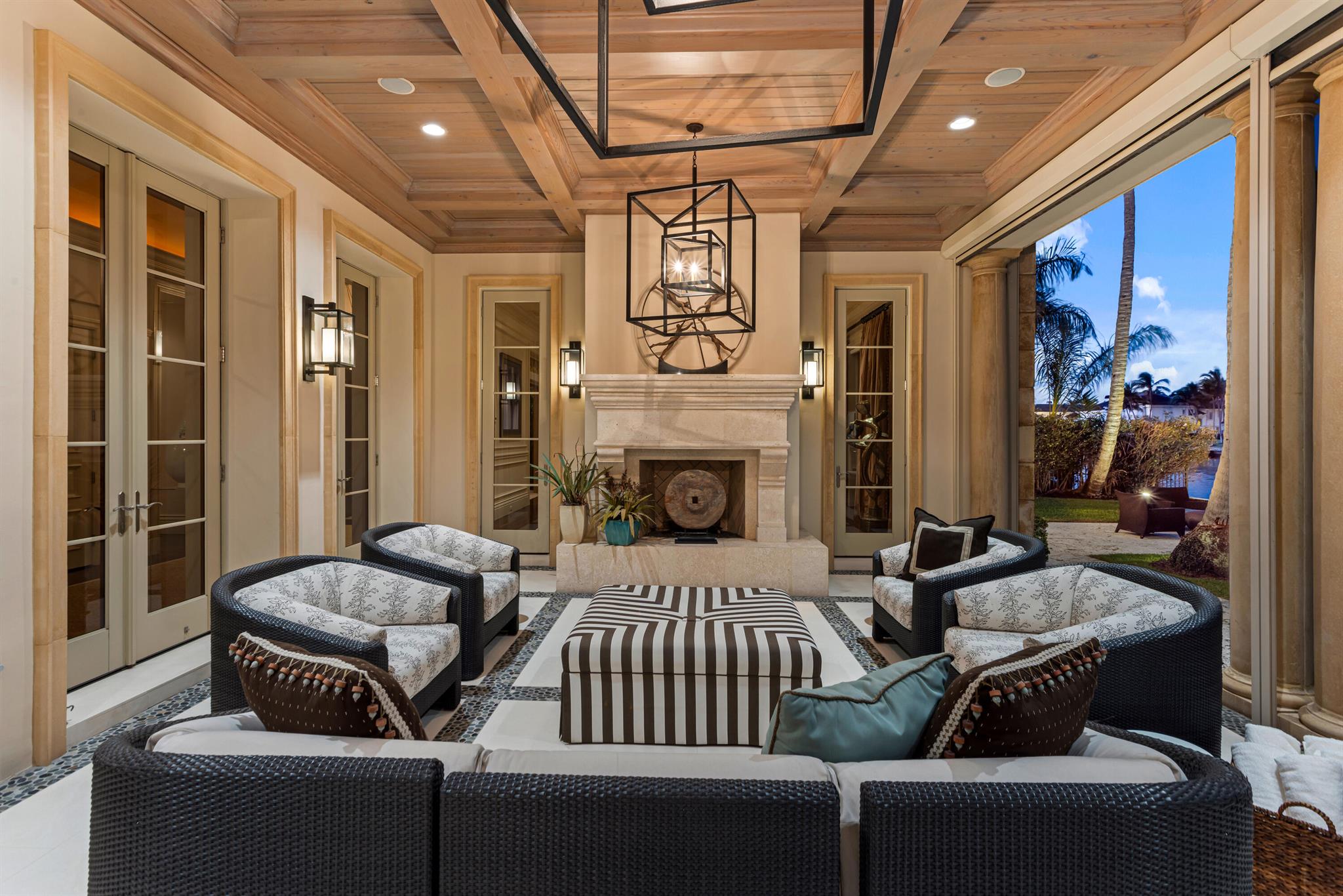 Gated Palm Beach-inspired Tropical Georgian sited on 123 +/- feet of Intracoastal with wide views overlooking Royal Palm's Grand Canal and originally built by acclaimed Frankel Estate Homes, Carlos Martin Architects, and interiors by Marc-Michaels. An elegant and graceful staircase with N/S Gallery sets the stage for this high- styled Intracoastal mansion with all public rooms facing the waterway. Grand salon with adjacent club room and pub. Modern gourmet kitchen opens to a breakfast and family room. Luxurious Primary suite features a lounge/retreat with fireplace, dual spa-like baths, walk in closets and two balconies. Outdoor entertaining is enjoyed at the elegant pool/patio, grand lanai with fireplace, separate pavilion with summer kitchen for alfresco dining. Shown by appt only