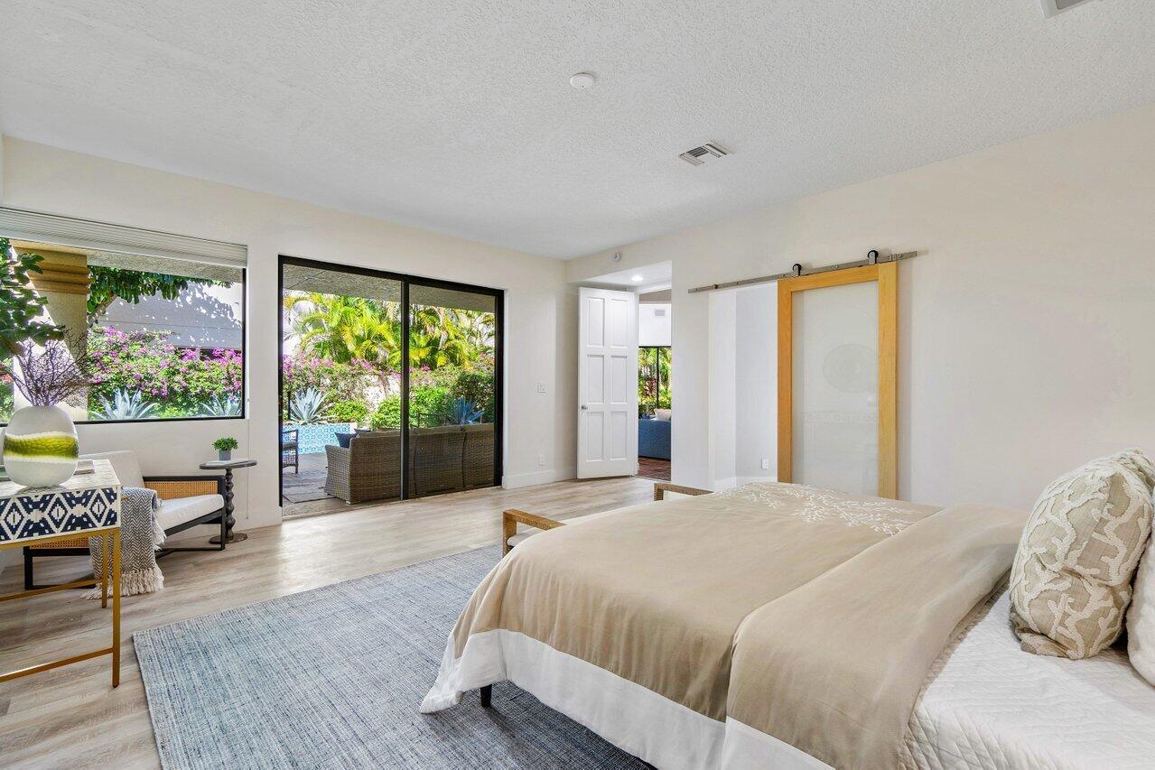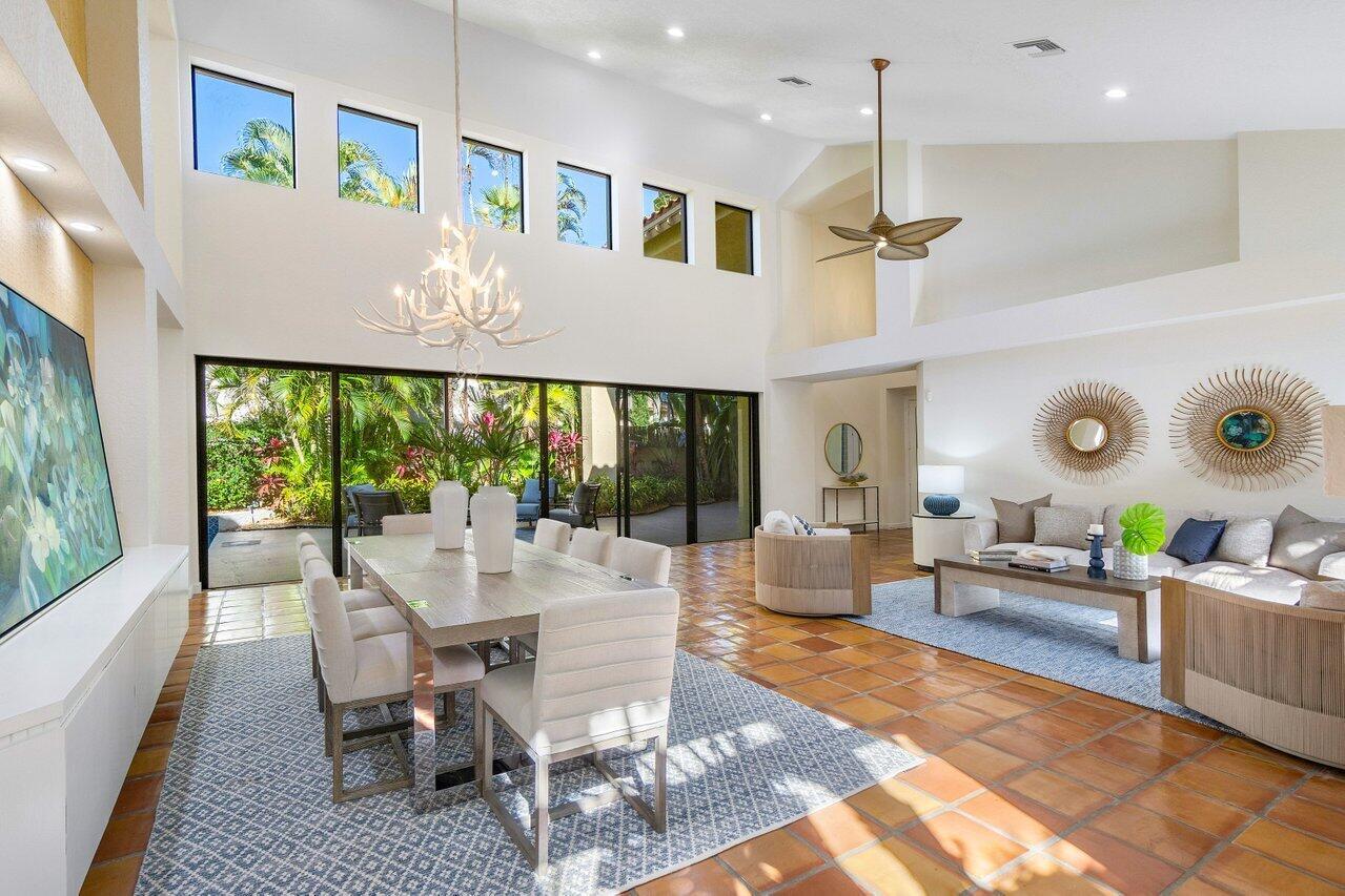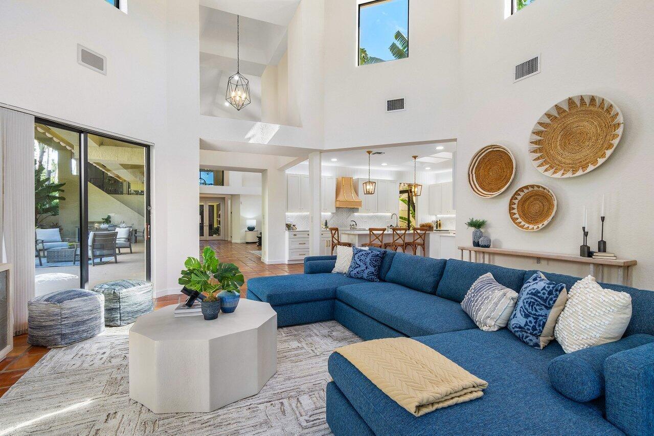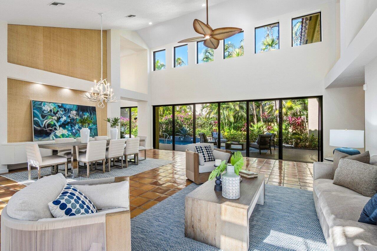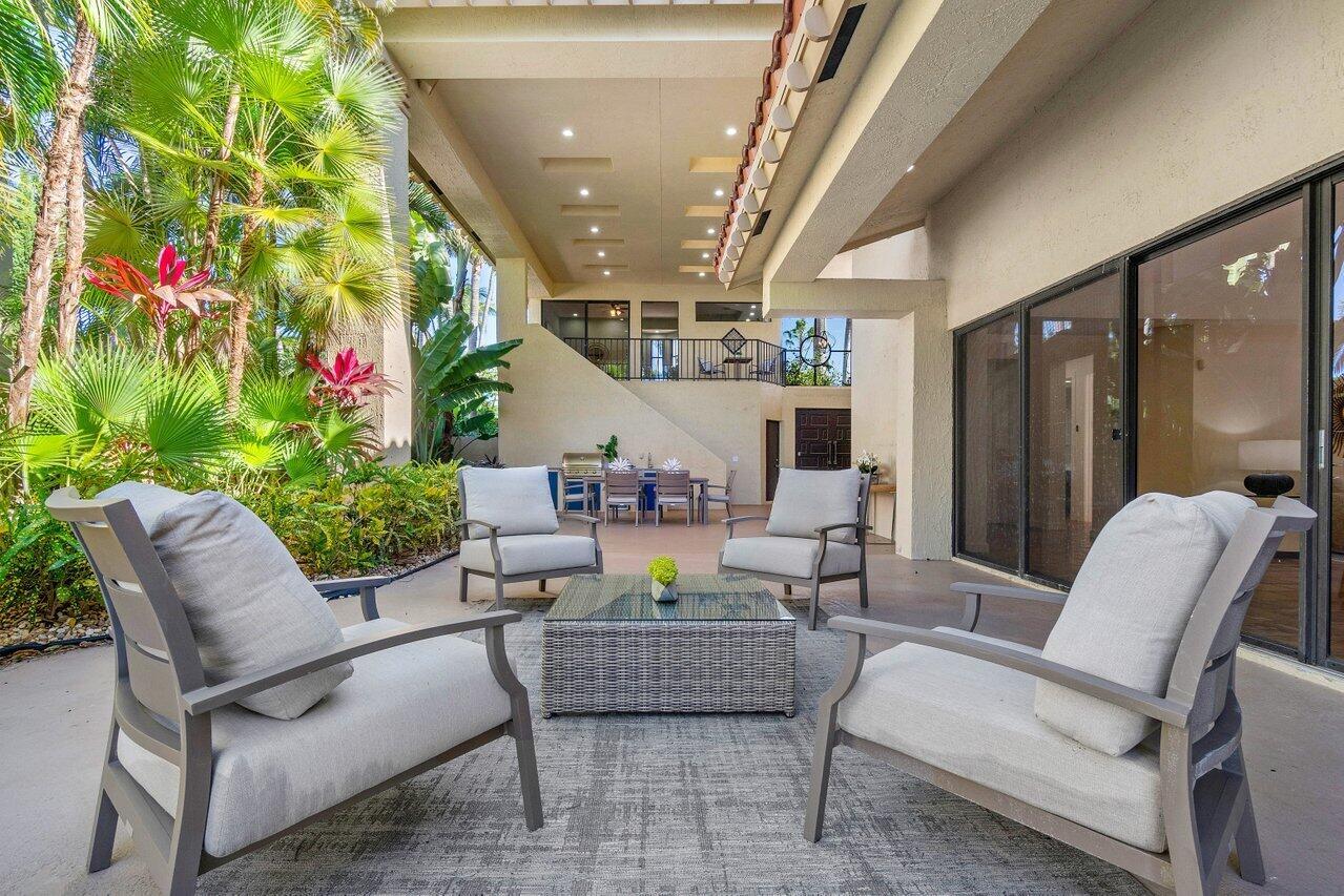 Welcome to your secluded haven! As you open the grand double doors, you're greeted by a private courtyard with an immense patio space that feels like your own outdoor living room. It boasts an outdoor grill area, a long spa-like lap pool and an oversized hot tub against the backdrop of captivating golf course views. The courtyard also features a convenient cabana bathroom with exterior shower and a private guest bedroom with a balcony to appreciate the serene views. The interior of the home reveals voluminous ceilings and an abundance of natural light in the living and dining areas with tropical landscaping that is evident from the wall of sliding glass doors. The kitchen, brand new and fully renovated in 2023, seamlessly integrates with an attached laundry room offering ample storage.