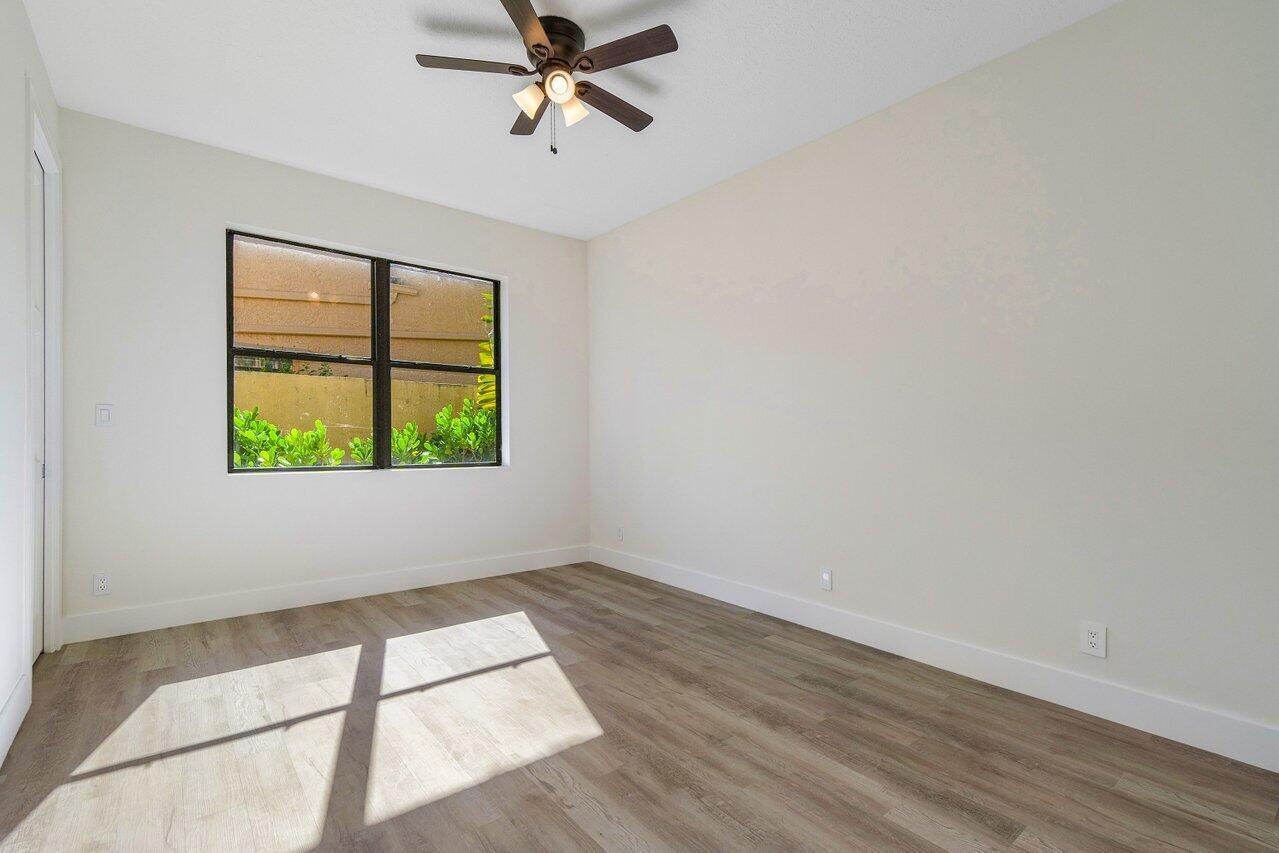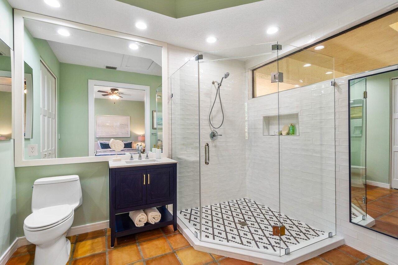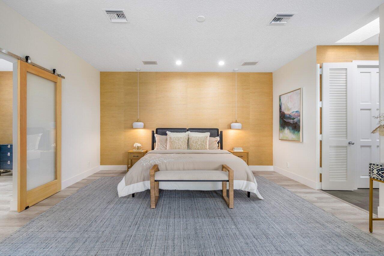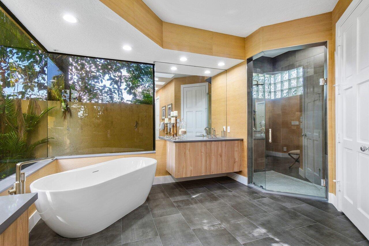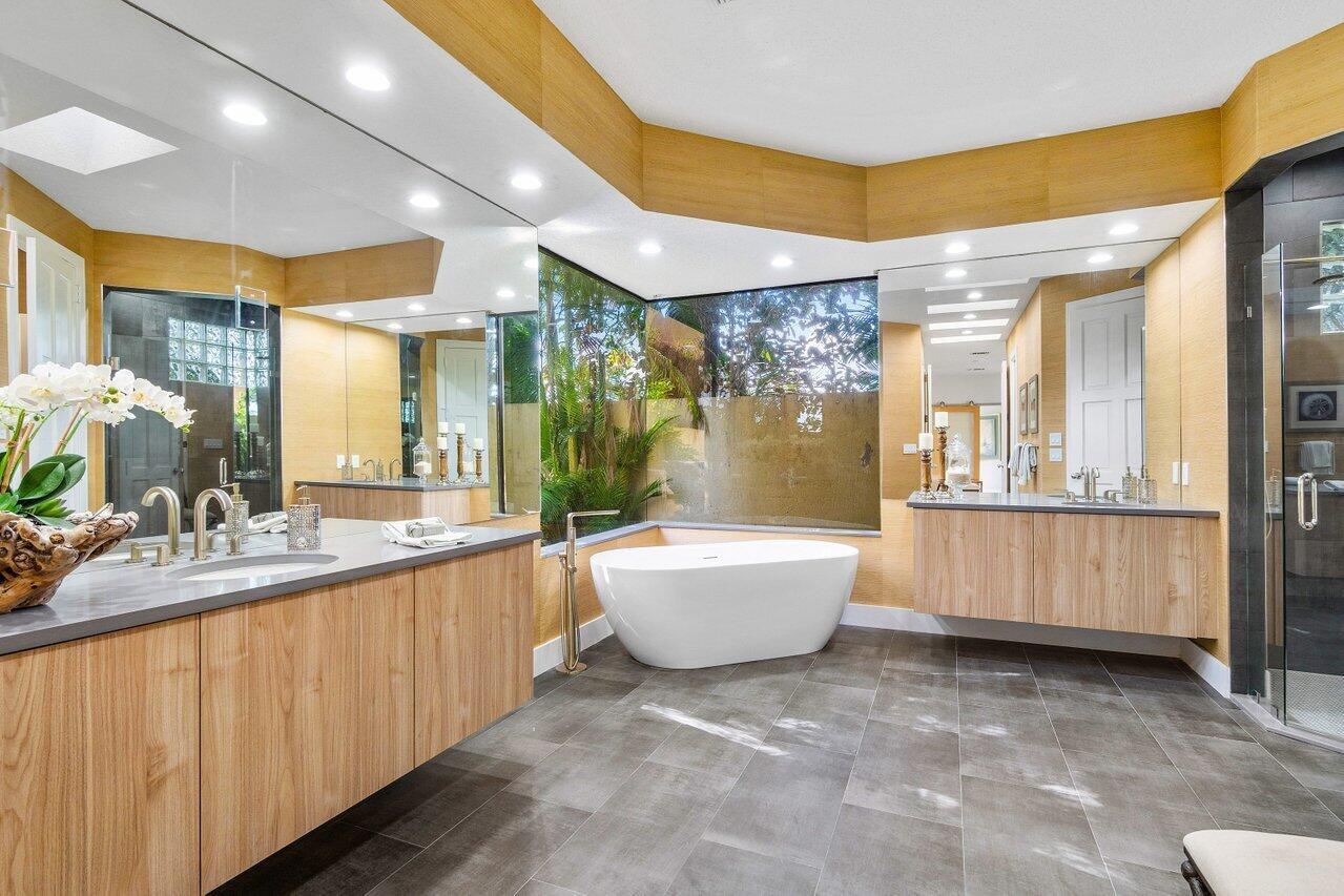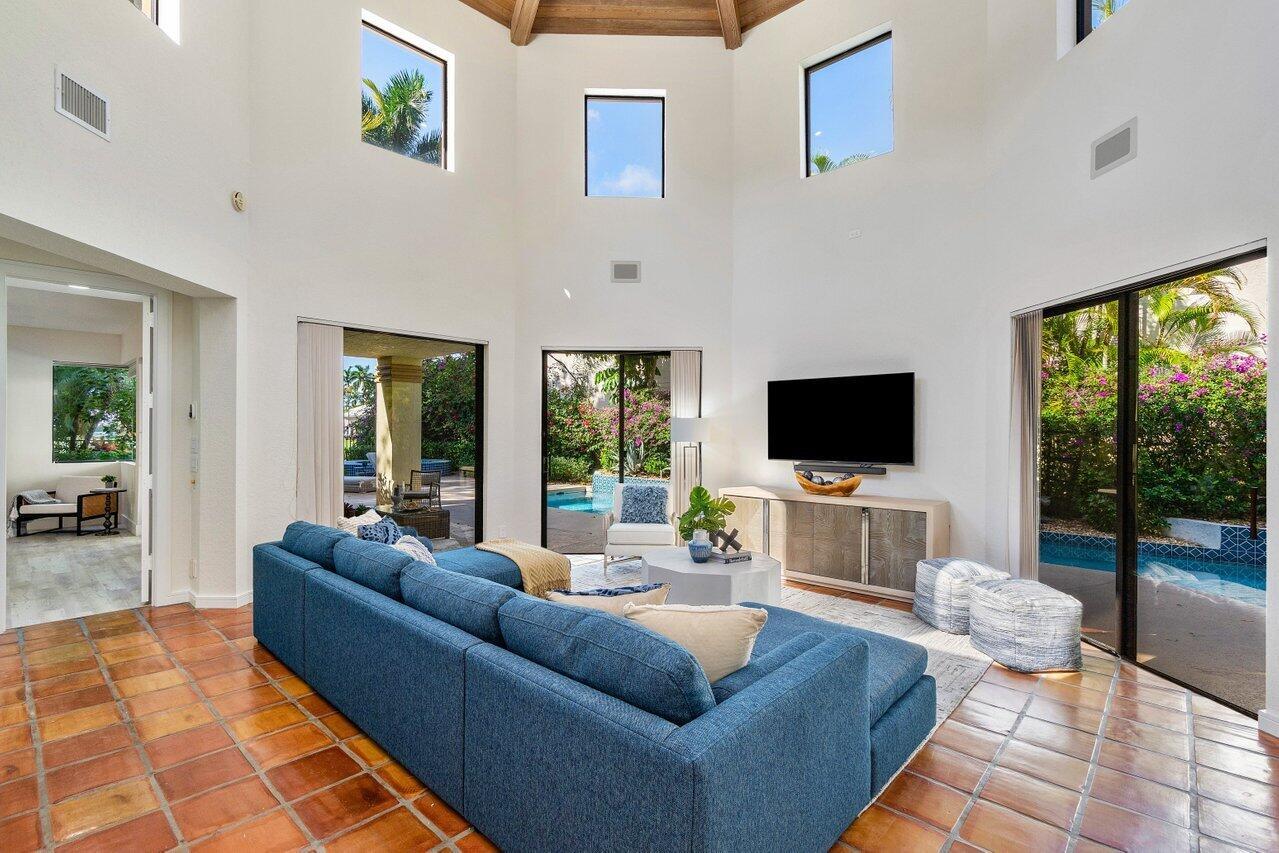 Welcome to your secluded haven! As you open the grand double doors, you're greeted by a private courtyard with an immense patio space that feels like your own outdoor living room. It boasts an outdoor grill area, a long spa-like lap pool and an oversized hot tub against the backdrop of captivating golf course views. The courtyard also features a convenient cabana bathroom with exterior shower and a private guest bedroom with a balcony to appreciate the serene views. The interior of the home reveals voluminous ceilings and an abundance of natural light in the living and dining areas with tropical landscaping that is evident from the wall of sliding glass doors. The kitchen, brand new and fully renovated in 2023, seamlessly integrates with an attached laundry room offering ample storage.