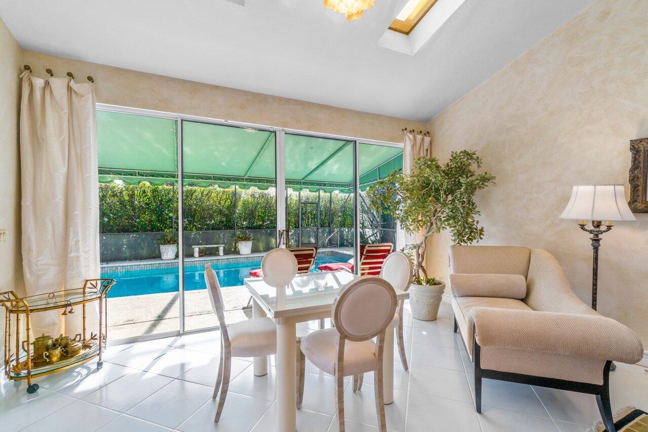 This charming home is situated in the highly desired section of Steeplechase, with great walkability to The Polo Club Clubhouse. Upon entering through the double-door entrance you are impressed by the sun-drenched soaring ceiling heights. The open concept of the living and dining room offers a perfect entertaining space that includes a seated wet bar for gathering. Discover the spacious eat-in kitchen overlooking the serene back patio and pool area. The primary bedroom suite is a retreat on its own, featuring two bathrooms, one with a separate tub and dual sinks and the other also offering the added benefit as a cabana bath. Leading down the hall past the open den area, you discover an oversized en-suite guest bedroom. Outdoors is a sunny private patio with a nice sized pool for relaxatio