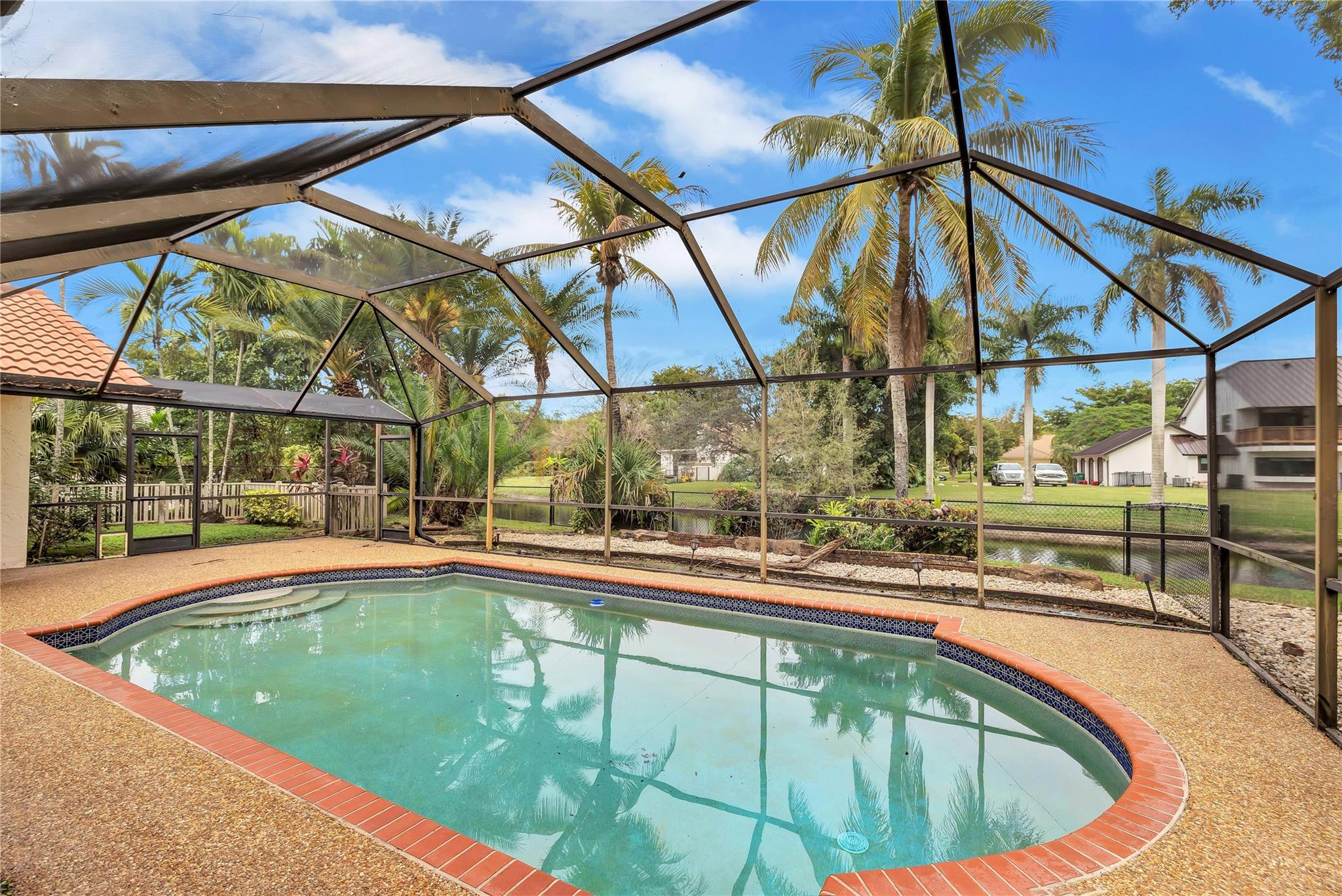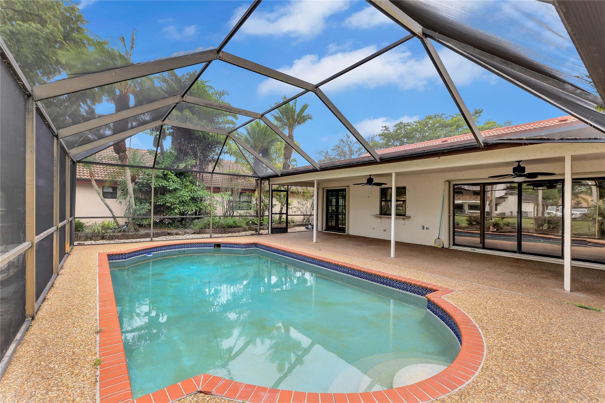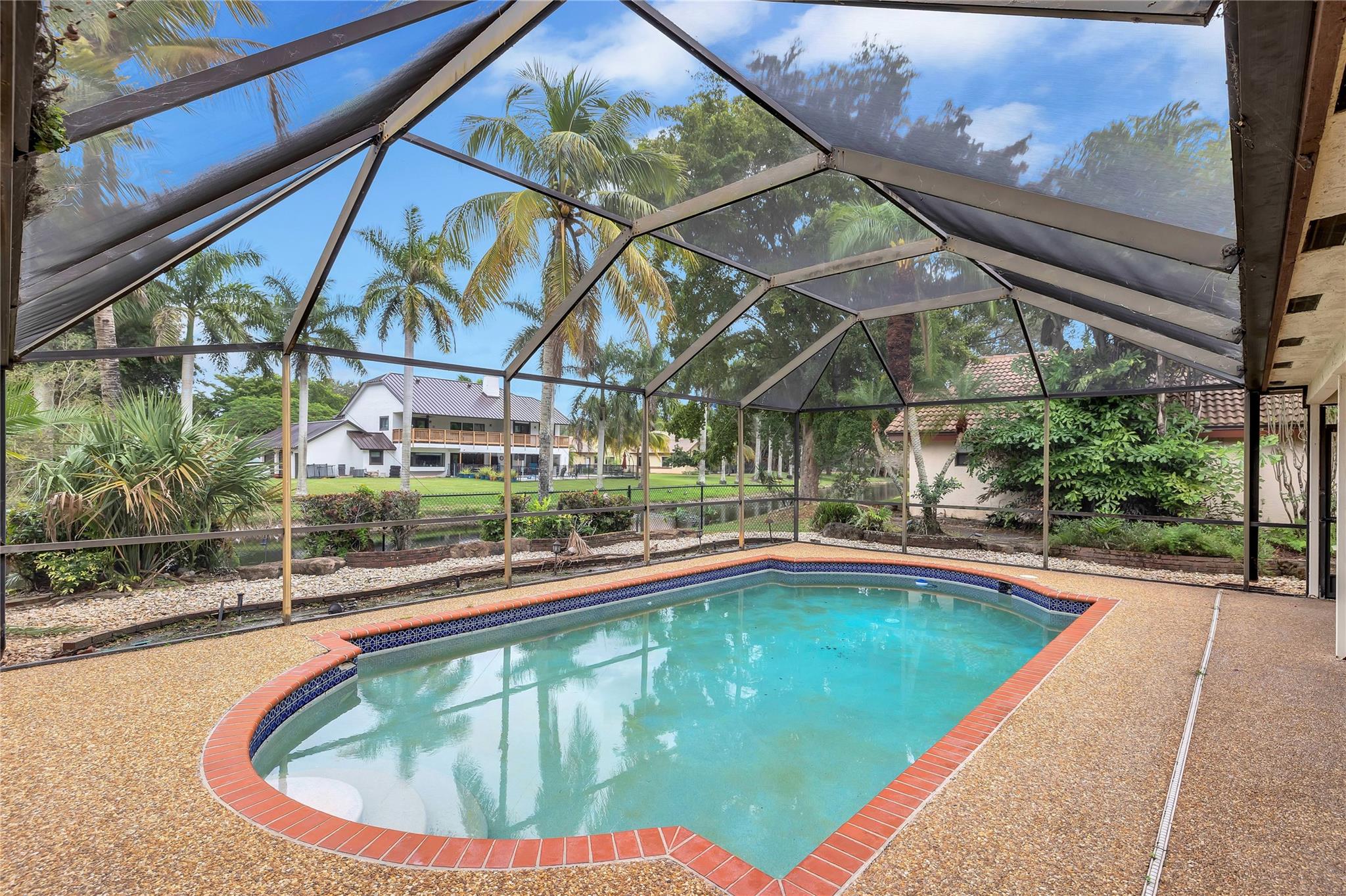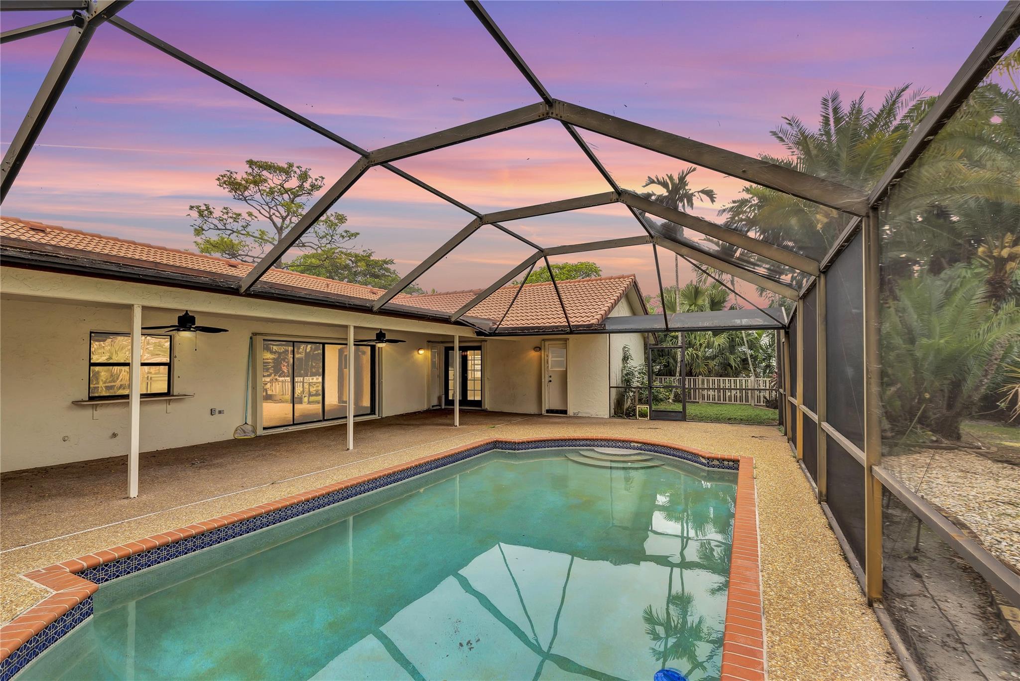 Best deal in town with adjusted price! Tucked away on a peaceful, tree-filled street, this residence is a haven for family living & relaxation. It features impact windows at the front & accordion shutters at the rear, ensuring both safety & privacy. The house boasts a fully screened-in pool & patio, alongside a secluded backyard, creating an idyllic park-like atmosphere. At its core is an open-plan kitchen & living space, perfect for hosting gatherings and spending quality time with family. The A/C 2-car garage offers versatile use, either as additional flexible space or as a conventional garage. Conveniently located near top-rated schools, parks, and dining, this splendid family home epitomizes the finest in suburban living.