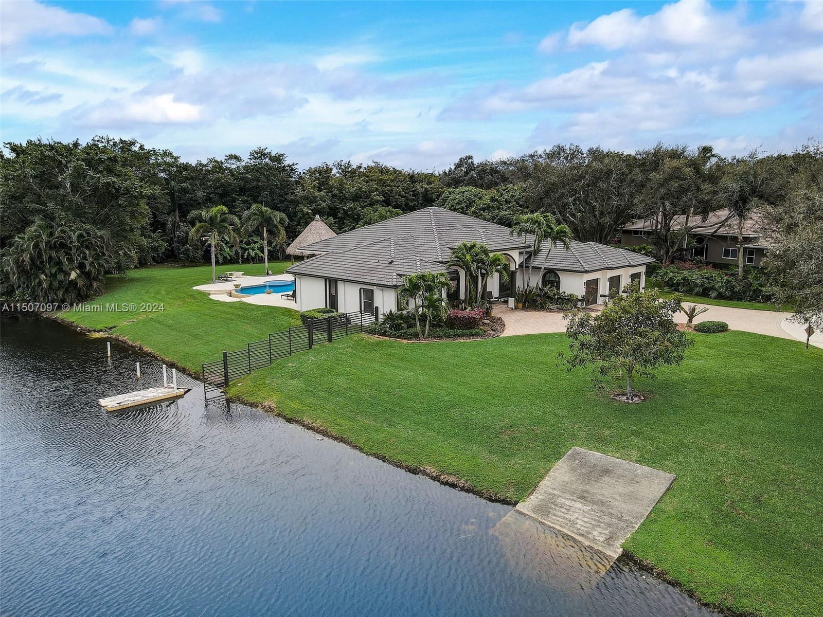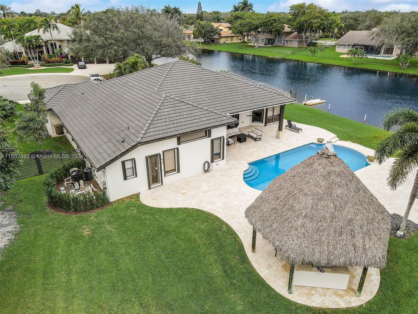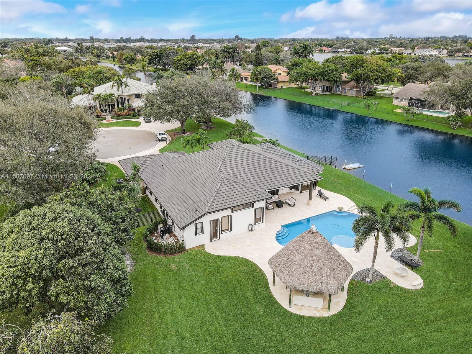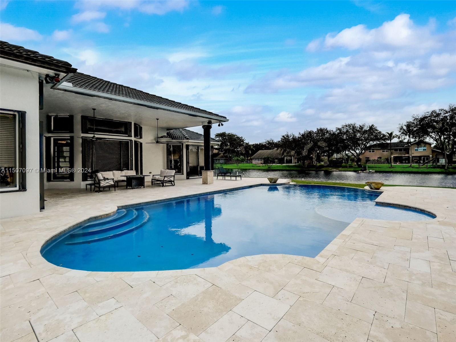 Welcome to Westridge in Davie! This 5 bed/3 bath lakefront home is a haven of sophistication and privacy, perfectly situated on a cul-de-sac.The upgraded kitchen boasts granite countertops, white cabinetry, and top-notch stainless steel appliances.The master retreat features auto remote-controlled blackout shades, walk-in closets, bamboo hardwood floors, and a dedicated water heater.Outside, an oversized patio with a covered seating area leads to the infinity-edge pool surrounded by travertine marble, fire accents and a Tiki Hut with a concrete/marble bar, brand new built-in BBQ, and 2 mini-bar refrigerators.Entertainment abounds with surround sound, a jet ski dock, and a boat ramp. Enjoy lake activities like jet-skiing or fishing in your backyard. Your Private haven awaits!