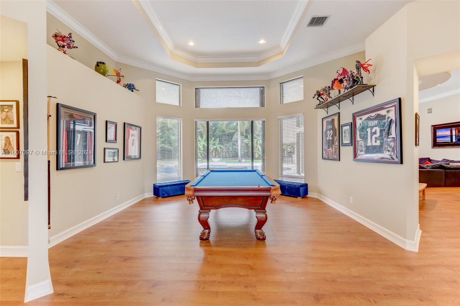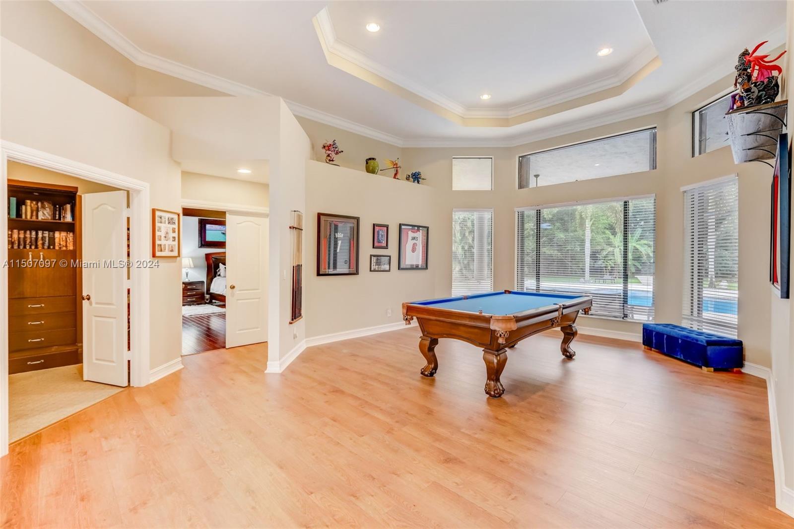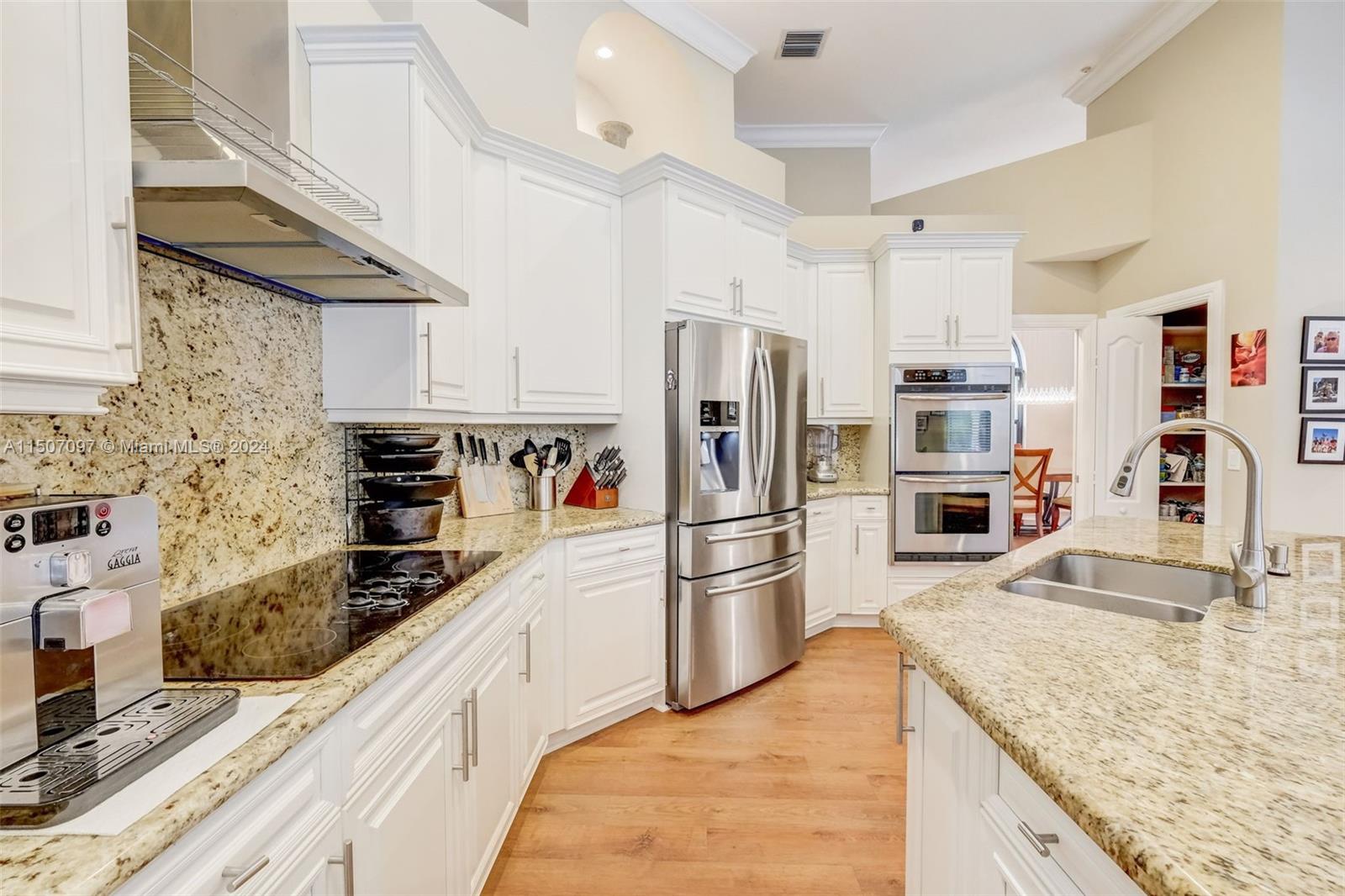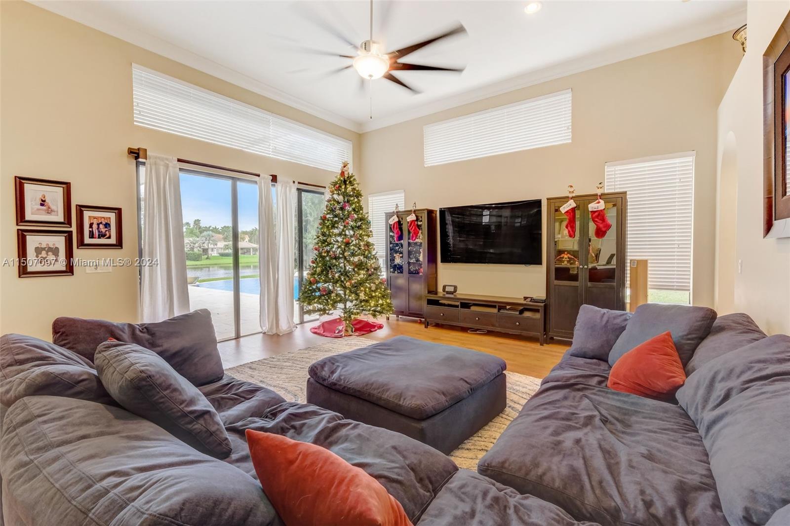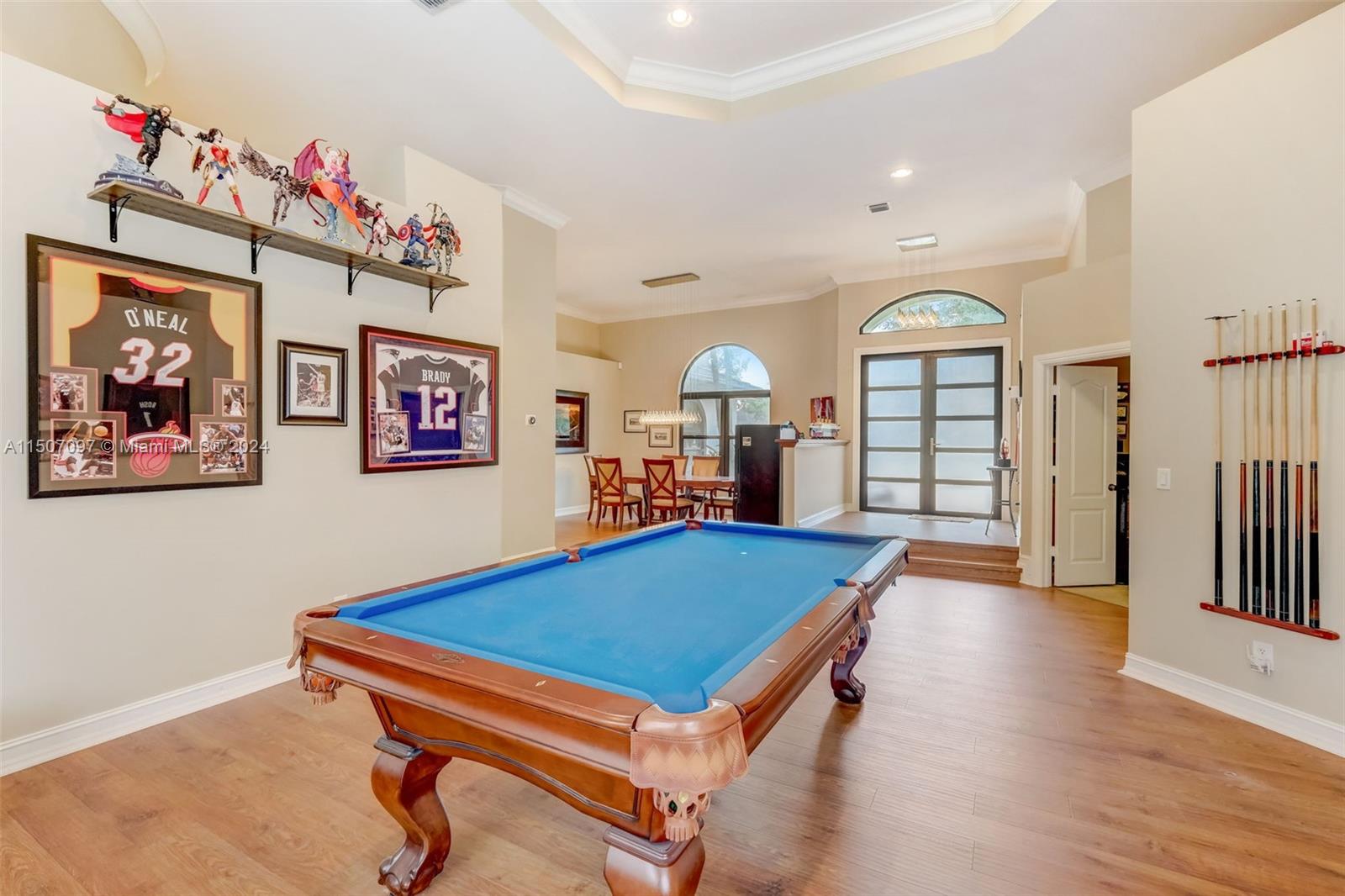 Welcome to Westridge in Davie! This 5 bed/3 bath lakefront home is a haven of sophistication and privacy, perfectly situated on a cul-de-sac.The upgraded kitchen boasts granite countertops, white cabinetry, and top-notch stainless steel appliances.The master retreat features auto remote-controlled blackout shades, walk-in closets, bamboo hardwood floors, and a dedicated water heater.Outside, an oversized patio with a covered seating area leads to the infinity-edge pool surrounded by travertine marble, fire accents and a Tiki Hut with a concrete/marble bar, brand new built-in BBQ, and 2 mini-bar refrigerators.Entertainment abounds with surround sound, a jet ski dock, and a boat ramp. Enjoy lake activities like jet-skiing or fishing in your backyard. Your Private haven awaits!