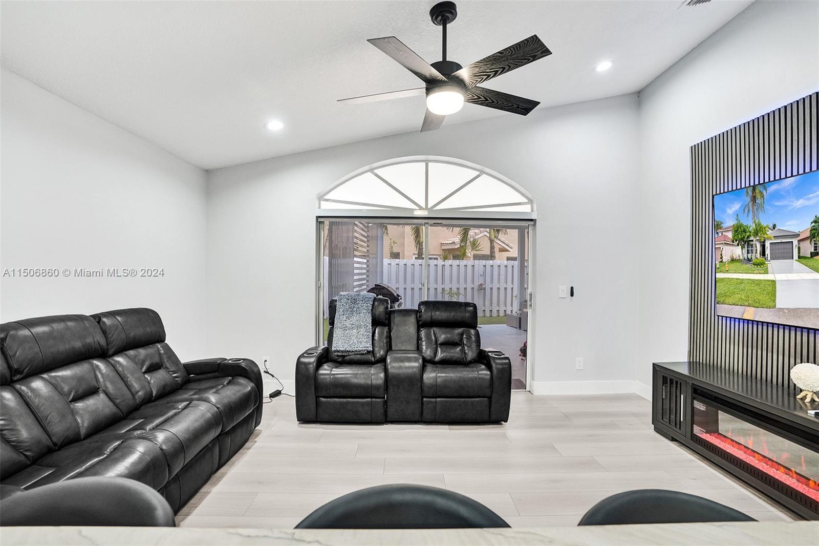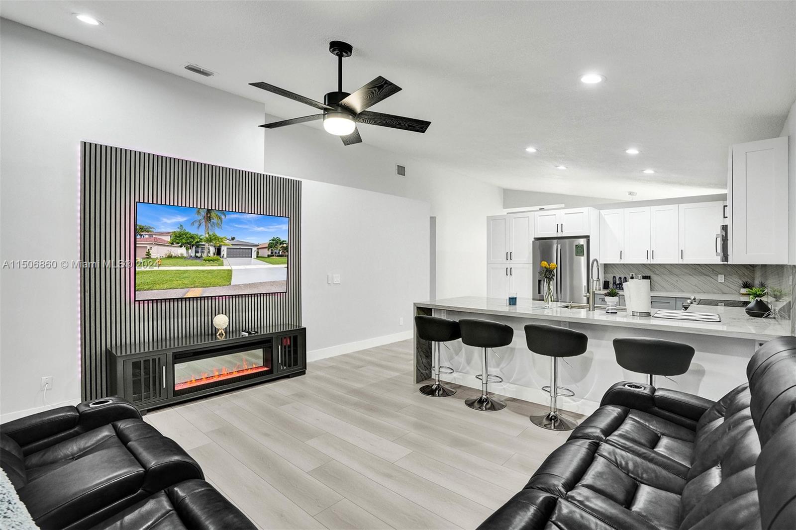 This single story house is COMPLETELY renovated and offers luxuries comparable to new construction homes. Interior upgrades include a modern kitchen with Quartzite countertops and new GE appliances, renovated bathrooms, commercial grade LVP floors, new baseboards, plantation shutters, wood slat decor, LED lights, and a popcorn-free ceilings. The entire home boasts fresh paint (interior, exterior, ceiling, driveway, fence, and roof), new doors (interior/exterior), and custom closet buildouts. Outdoors features a freshly sealed roof, BRAND NEW covered terrace with custom metal privacy slats, LED lighting, and ceiling, new accordion shutters, new sprinkler pump, and upgraded landscaping. The A/C condenser is 5 years old. Central A/C in the garage, can easily be converted to a 4th room.