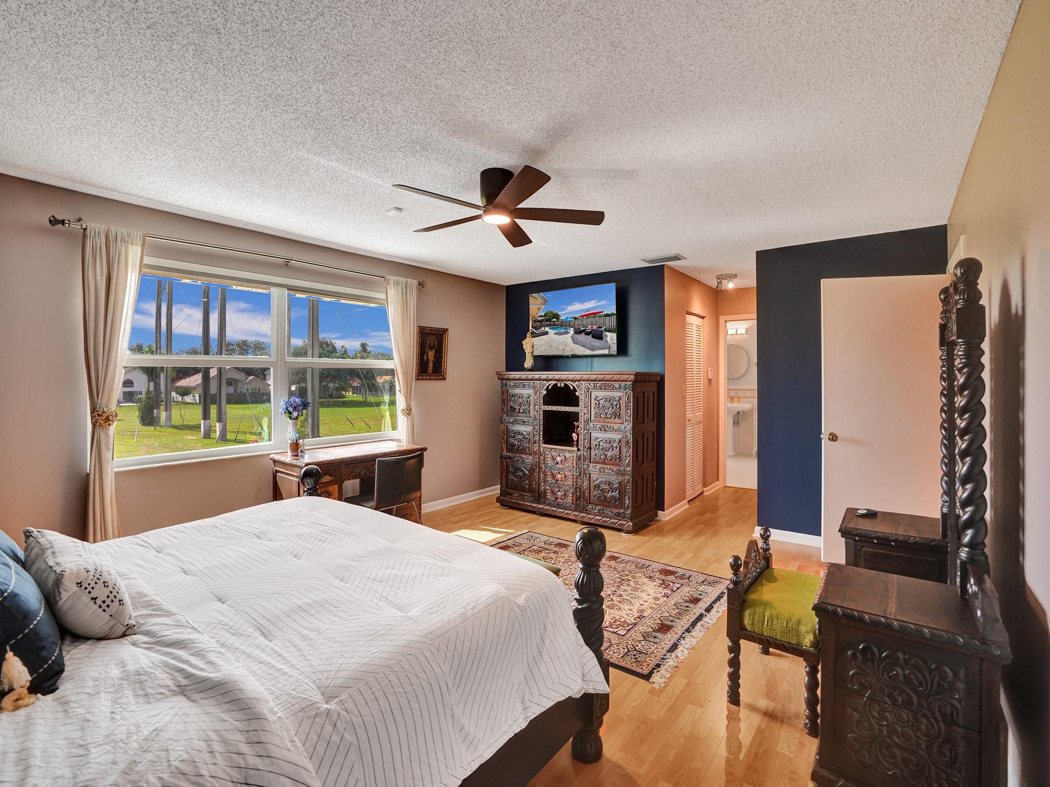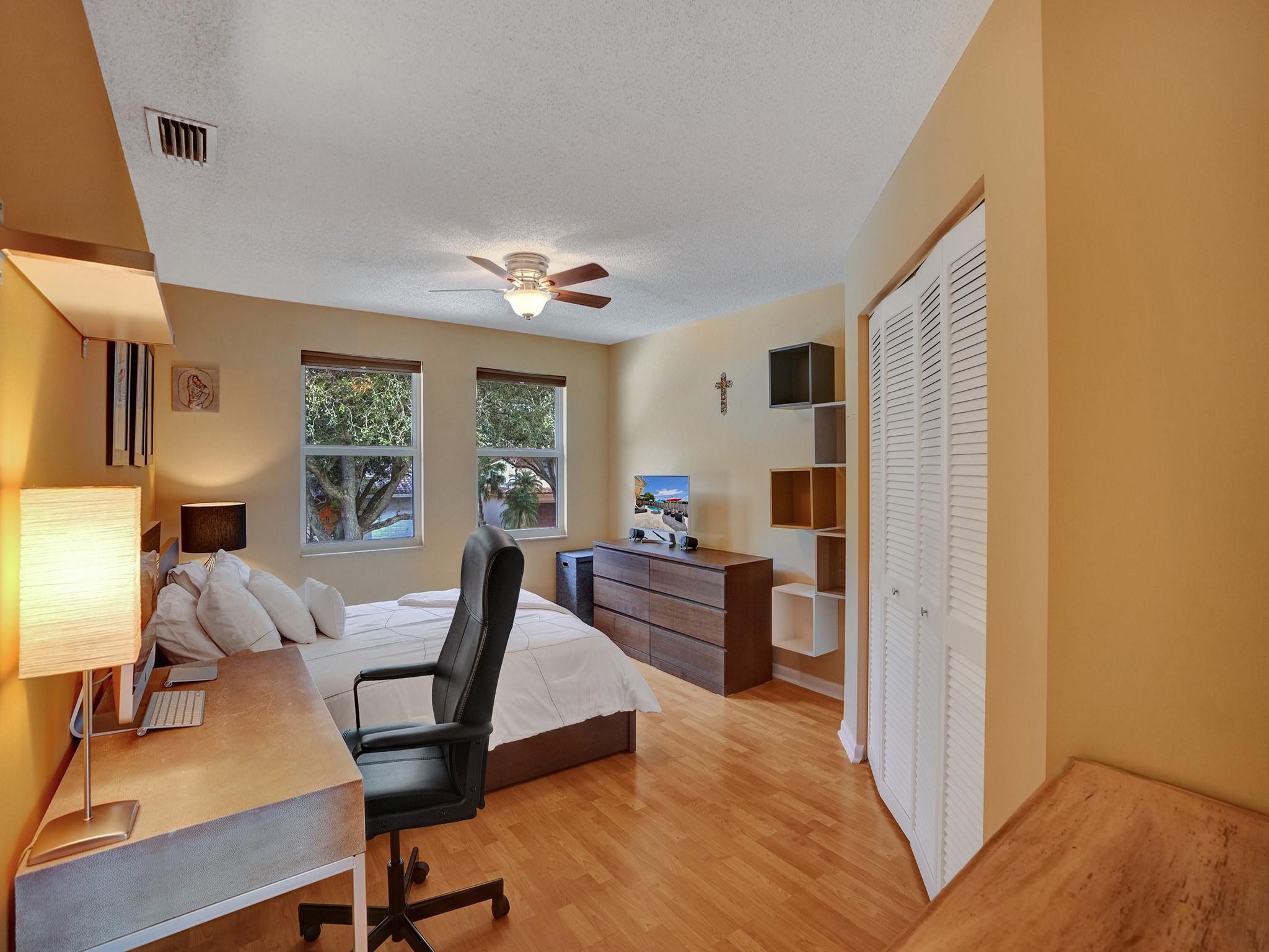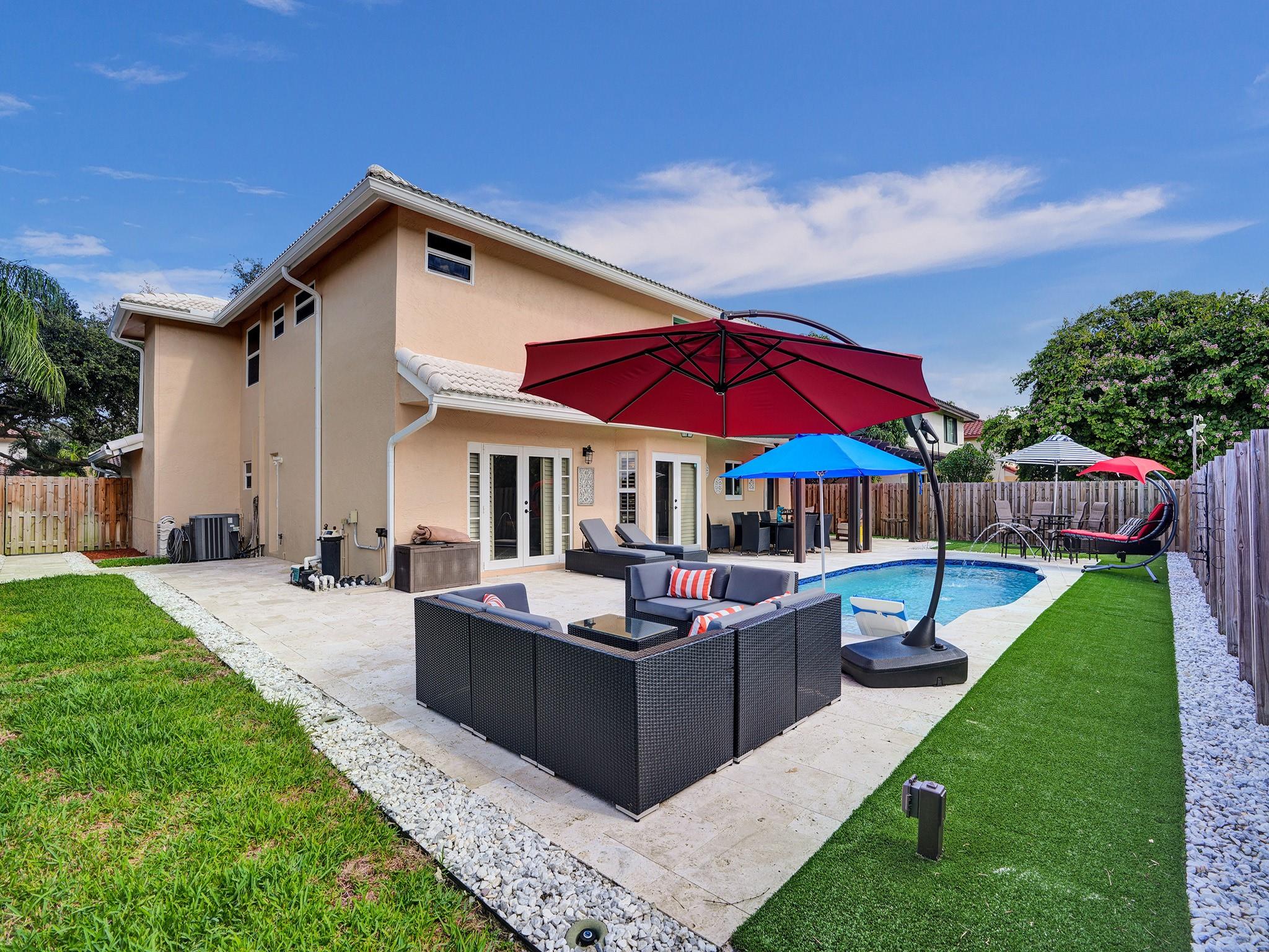 Discover luxury in Embassy Lakes, with the lowest HOA fees. This 3,198 sq ft two-story home features no back neighbors, hurricane-impact windows/doors, a new deck and beautiful pool combined with vast entertaining space and covered seating area. Inside, enjoy a renovated kitchen, spacious living areas with high ceilings, a bedroom and a full bath on the first floor (a big plus for guests), on the second floor a huge master bedroom, 2 bedrooms and a full bathroom. The 2-car garage adds convenience and storage room. Located in Cooper City, home to "A-rated" schools, within walking distance to worship places. Benefits include 24/7 guarded gates, sports courts, a fitness center, clubhouse, and pool, promising a blend of comfort, convenience. Just waiting for you to start making your memories!