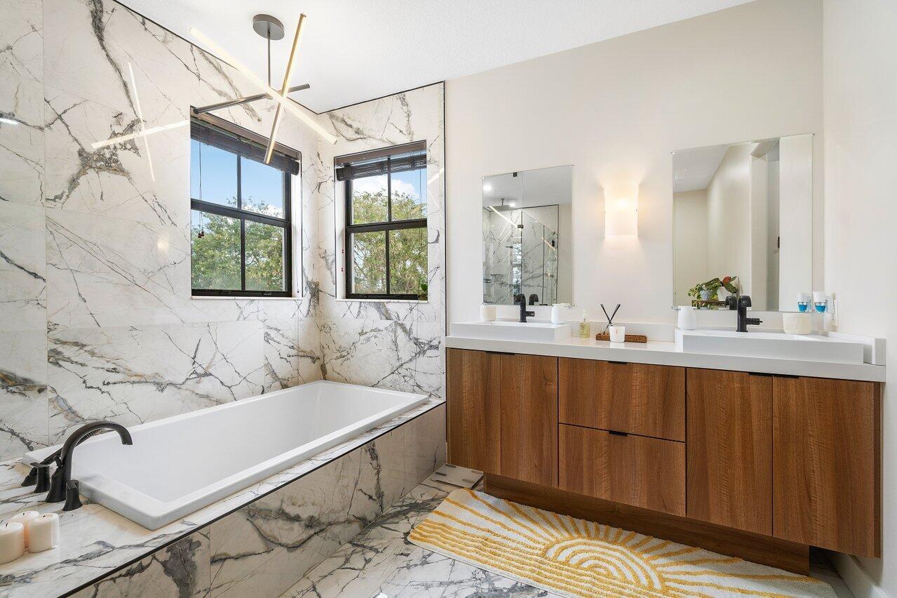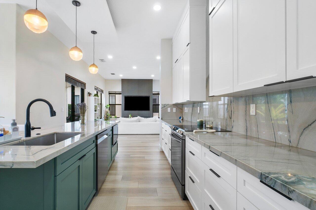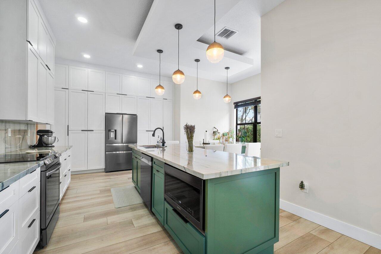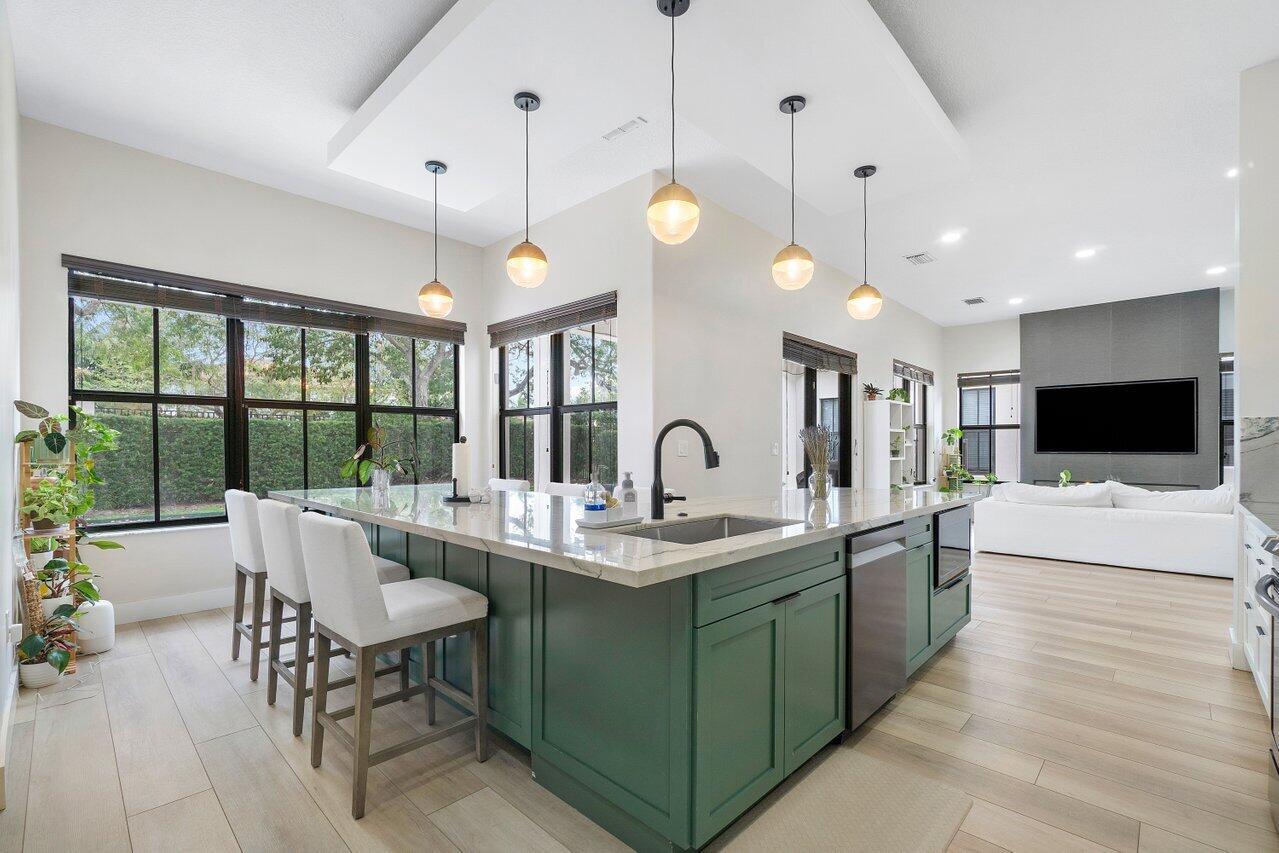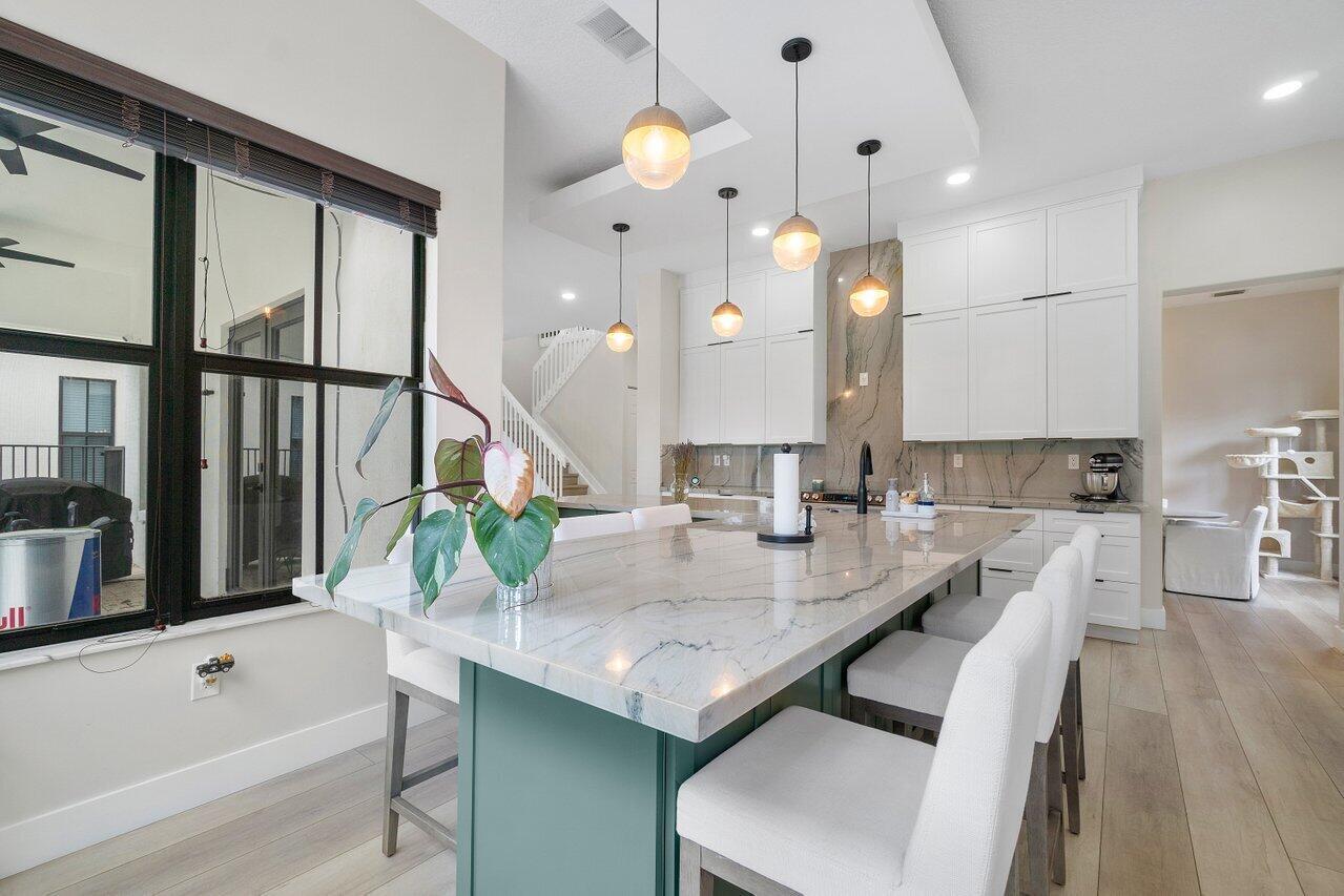Discover luxury living in the heart of Monterra with this breathtaking 4-bed, 3-bath single-family home. Immerse yourself in the allure of its fully remodeled interior, boasting a guest room downstairs with a stunning bathroom featuring black cabinets, quartz countertops, a frameless shower, and a single mosaic tile floor. The custom-built bar adjacent to the formal dining room sets the stage for the true masterpiece - the kitchen. Revel in the beauty of floor-to-ceiling wood cabinets, a sprawling 19+ feet island, Tuscan SS appliances, a floating ceiling, and Quartzite counters. Natural light floods through impact windows, offering picturesque views of the heated, saltwater pool. Upstairs, a loft and a thoughtfully designed split layout of three bedrooms, along with custom shoe and master