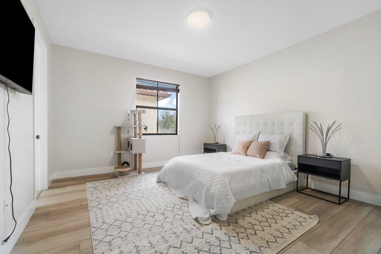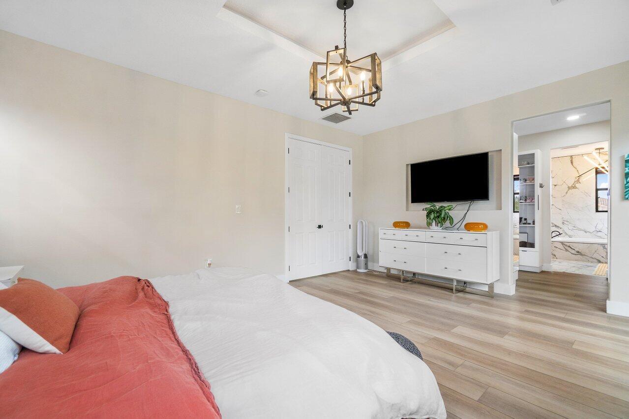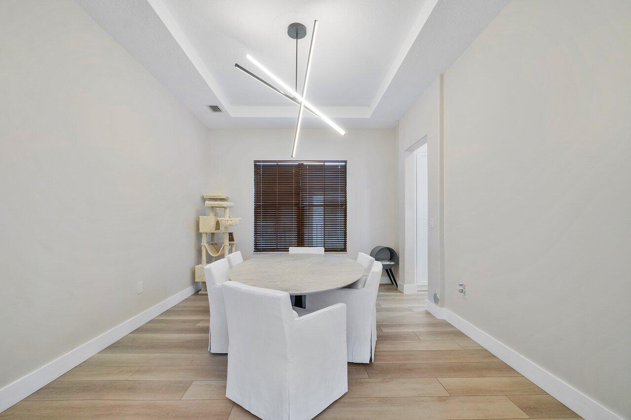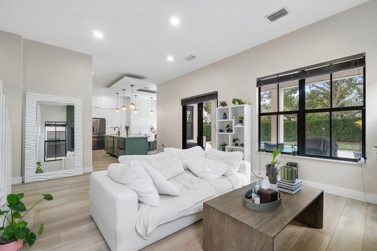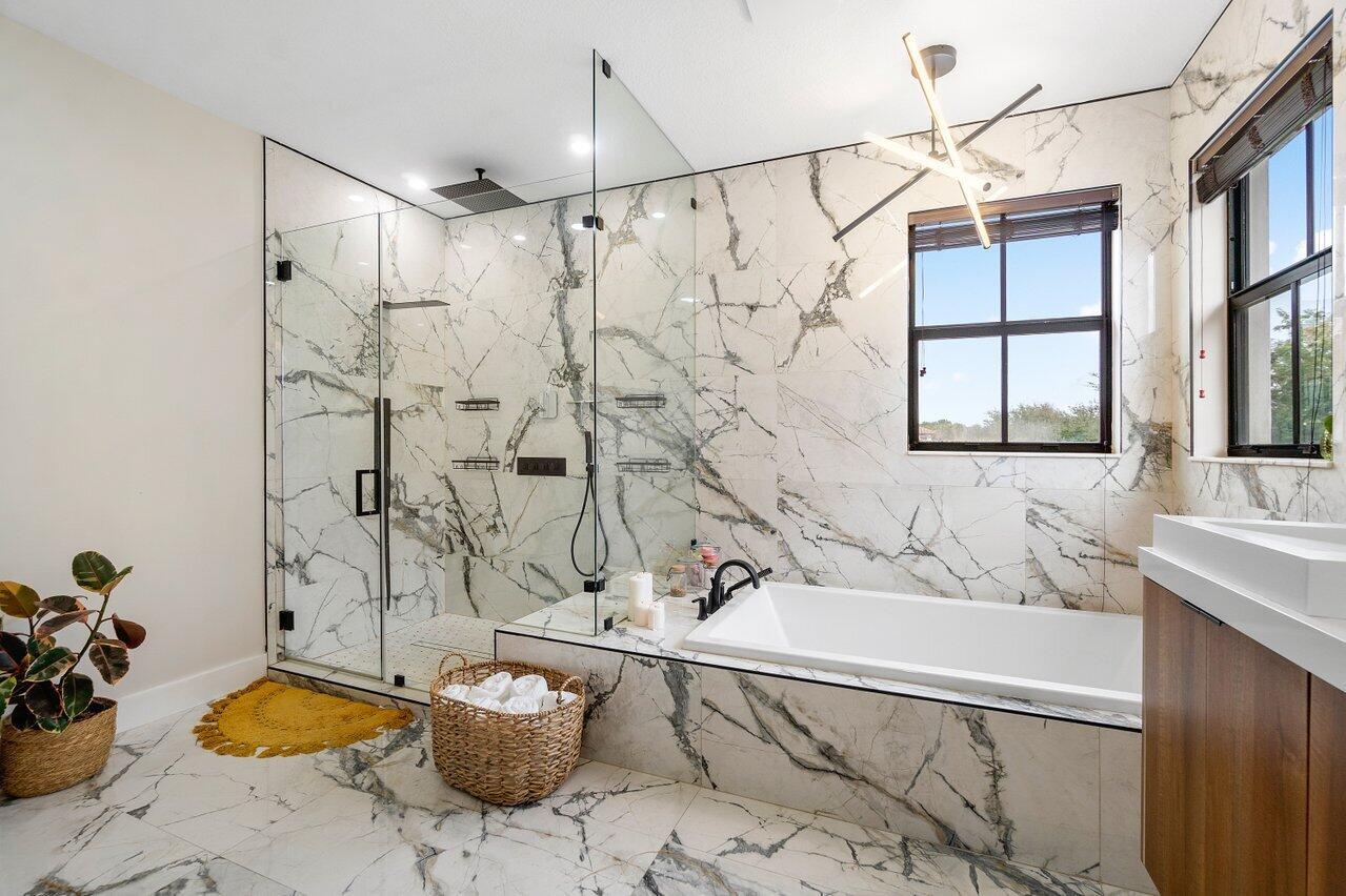 Discover luxury living in the heart of Monterra with this breathtaking 4-bed, 3-bath single-family home. Immerse yourself in the allure of its fully remodeled interior, boasting a guest room downstairs with a stunning bathroom featuring black cabinets, quartz countertops, a frameless shower, and a single mosaic tile floor. The custom-built bar adjacent to the formal dining room sets the stage for the true masterpiece - the kitchen. Revel in the beauty of floor-to-ceiling wood cabinets, a sprawling 19+ feet island, Tuscan SS appliances, a floating ceiling, and Quartzite counters. Natural light floods through impact windows, offering picturesque views of the heated, saltwater pool. Upstairs, a loft and a thoughtfully designed split layout of three bedrooms, along with custom shoe and master