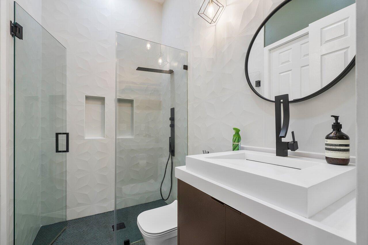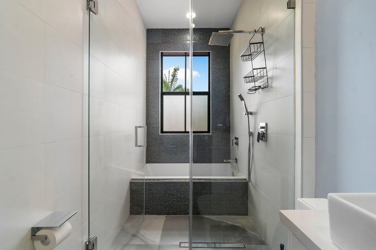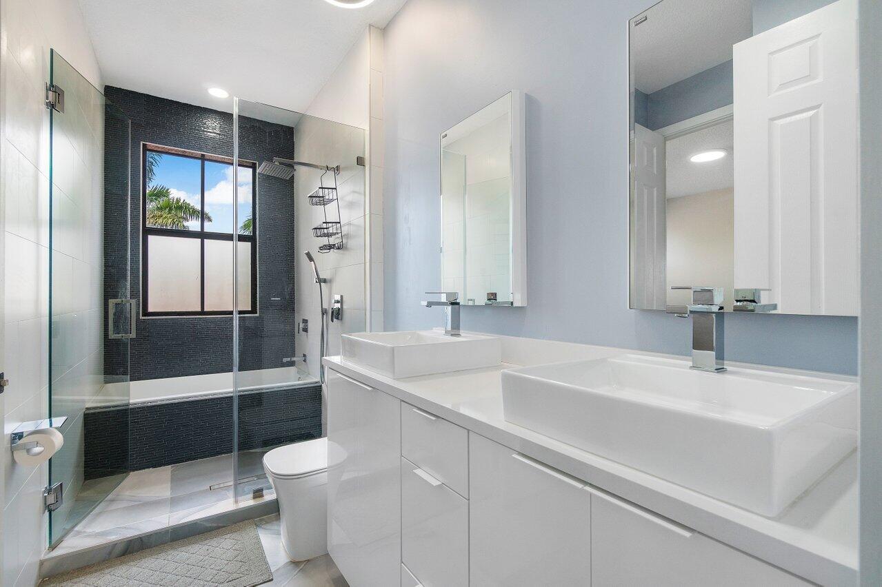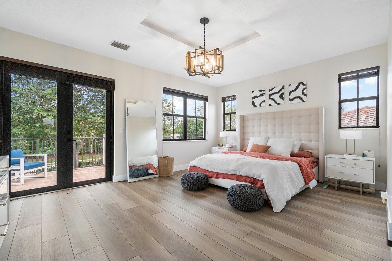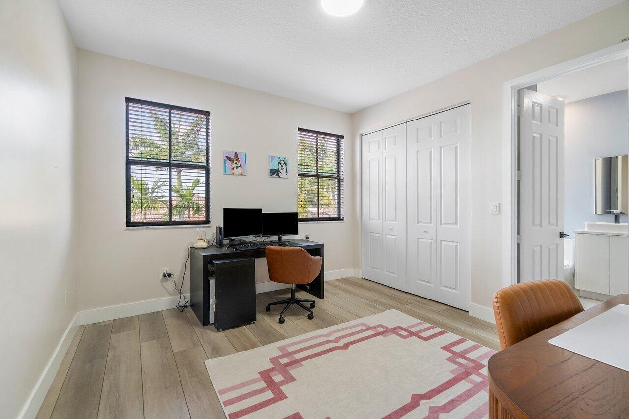 Discover luxury living in the heart of Monterra with this breathtaking 4-bed, 3-bath single-family home. Immerse yourself in the allure of its fully remodeled interior, boasting a guest room downstairs with a stunning bathroom featuring black cabinets, quartz countertops, a frameless shower, and a single mosaic tile floor. The custom-built bar adjacent to the formal dining room sets the stage for the true masterpiece - the kitchen. Revel in the beauty of floor-to-ceiling wood cabinets, a sprawling 19+ feet island, Tuscan SS appliances, a floating ceiling, and Quartzite counters. Natural light floods through impact windows, offering picturesque views of the heated, saltwater pool. Upstairs, a loft and a thoughtfully designed split layout of three bedrooms, along with custom shoe and master
