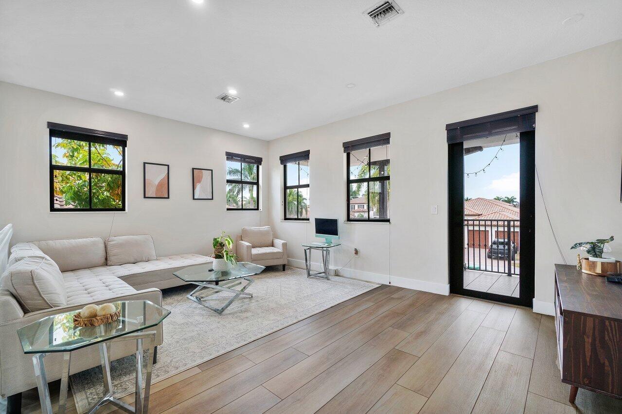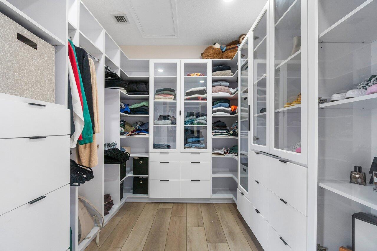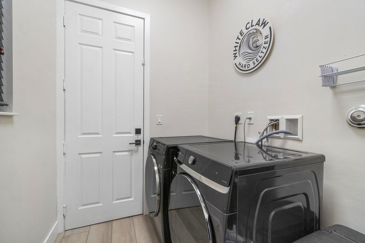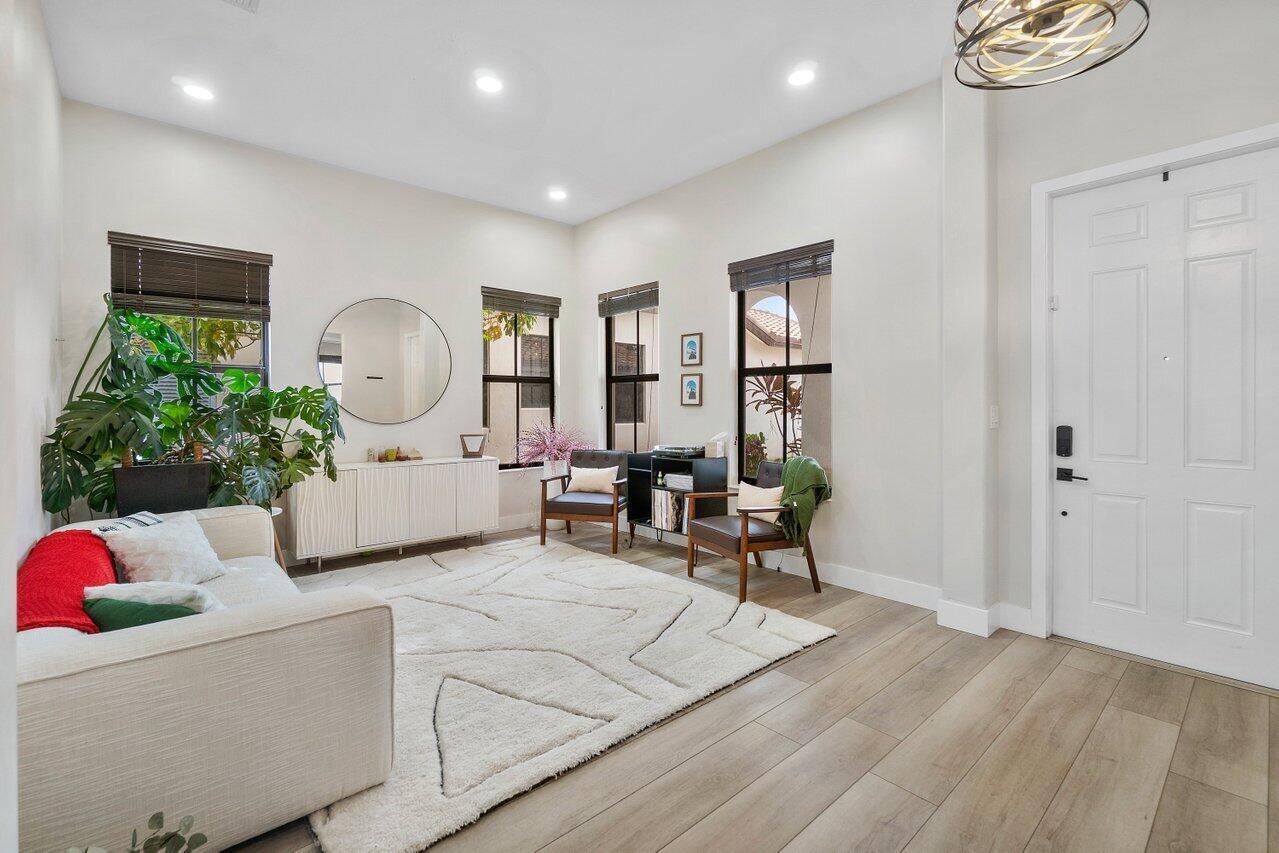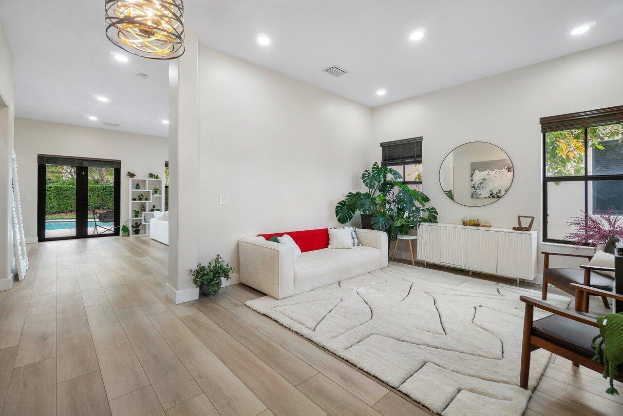 Discover luxury living in the heart of Monterra with this breathtaking 4-bed, 3-bath single-family home. Immerse yourself in the allure of its fully remodeled interior, boasting a guest room downstairs with a stunning bathroom featuring black cabinets, quartz countertops, a frameless shower, and a single mosaic tile floor. The custom-built bar adjacent to the formal dining room sets the stage for the true masterpiece - the kitchen. Revel in the beauty of floor-to-ceiling wood cabinets, a sprawling 19+ feet island, Tuscan SS appliances, a floating ceiling, and Quartzite counters. Natural light floods through impact windows, offering picturesque views of the heated, saltwater pool. Upstairs, a loft and a thoughtfully designed split layout of three bedrooms, along with custom shoe and master