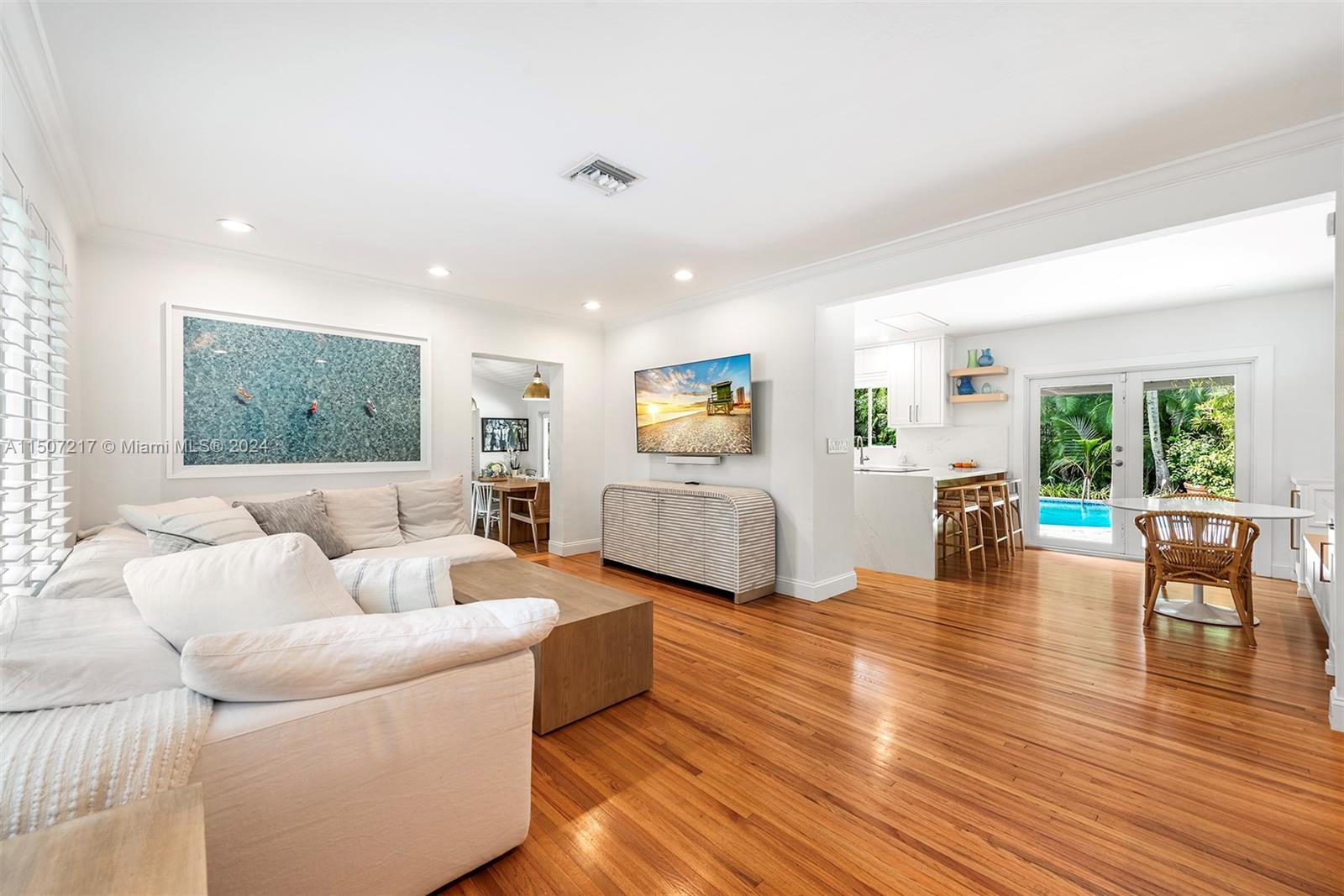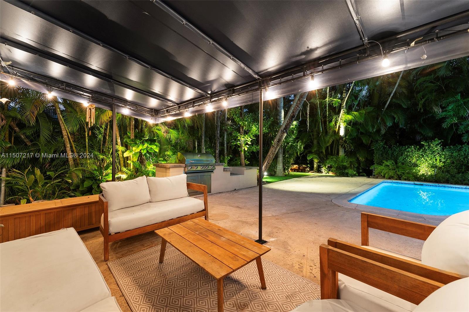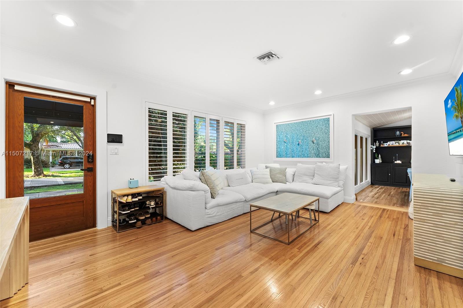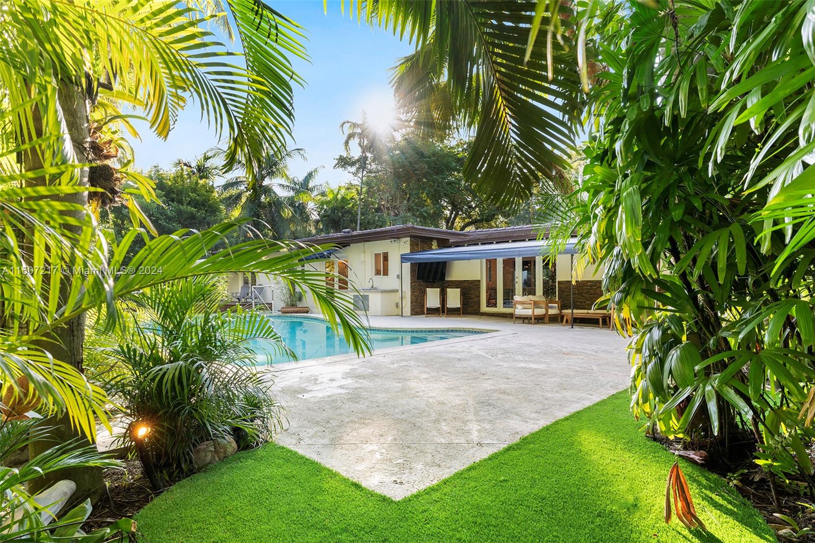 Brand new roof, awnings, gutters, and impact doors! Stunning residence in the heart of Coral Gables set just 1 block from the Gables Youth Center and Library. This timeless Gables residence is gracefully positioned on a generous 10,000 sqft lot with impact windows, new kitchen and brand-new roof, awnings, and gutters. Entering from tree-lined Aledo Ave, the light and bright living room with original hardwood floors leads to an expansive dining area, custom kitchen, large office/den, and captivating pool views from every angle. Lushly landscaped grounds extend a warm invitation to your own secluded pool sanctuary. Outdoor living spaces include covered terrace, outdoor kitchen, and deck off the primary suite offering ample opportunities to entertain and unwind poolside.