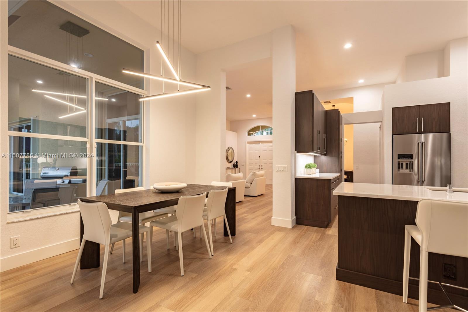 Stunning, renovated (2021) single story residence boasts five generously sized bedrooms, three beautifully updated bathrooms, and a 3 car garage offered by original owner in Weston Hills Country Club's newest enclave, Victoria. Professional interior design exudes a casual sophistication showcasing a contemporary kitchen adorned with white quartz countertops, contrasting espresso cabinetry, stainless appliances, and modern range hood. Exquisite lighting and custom white drapery amplify the high ceilings and open floor plan. A 36 x 22 renovated (2020) sparkling blue freeform swimming pool with spillover spa charm in the fully fenced backyard tropically landscaped for privacy. Zoned for Weston's A+ rated schools, shows like a model exemplifying true pride in ownership.