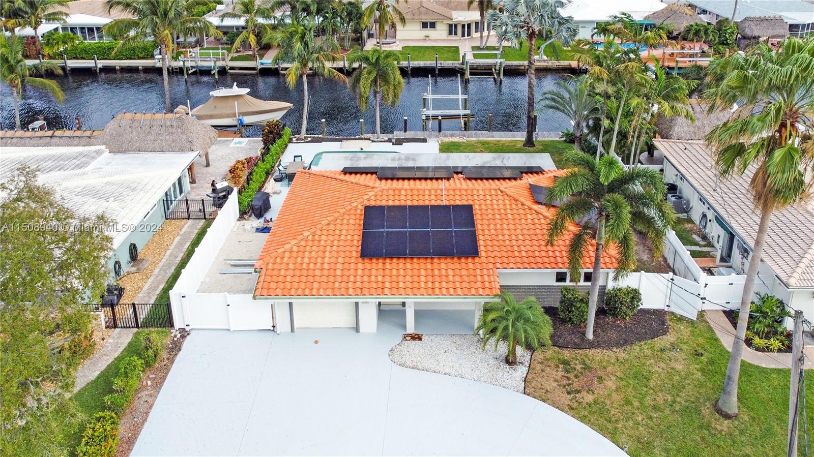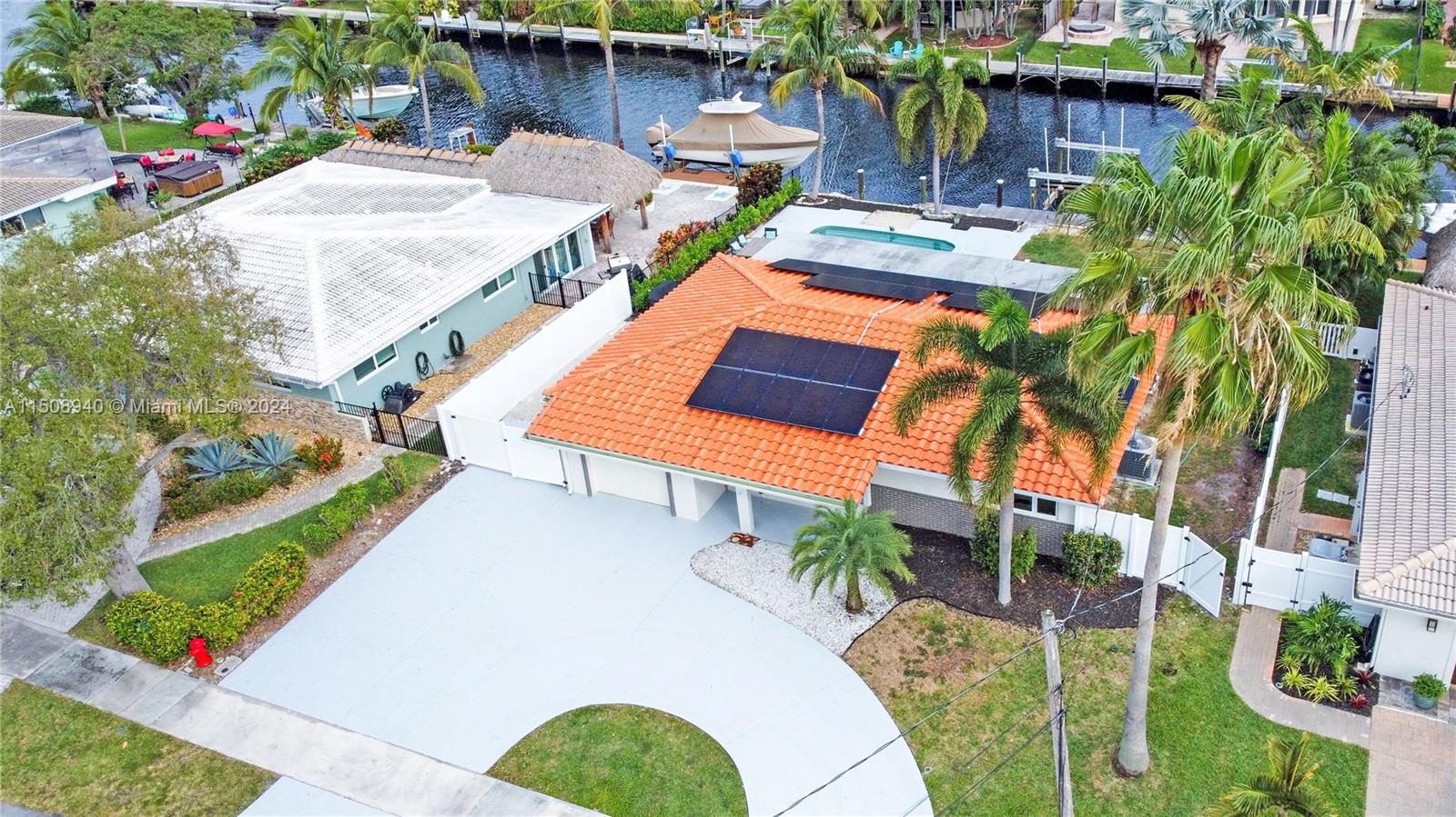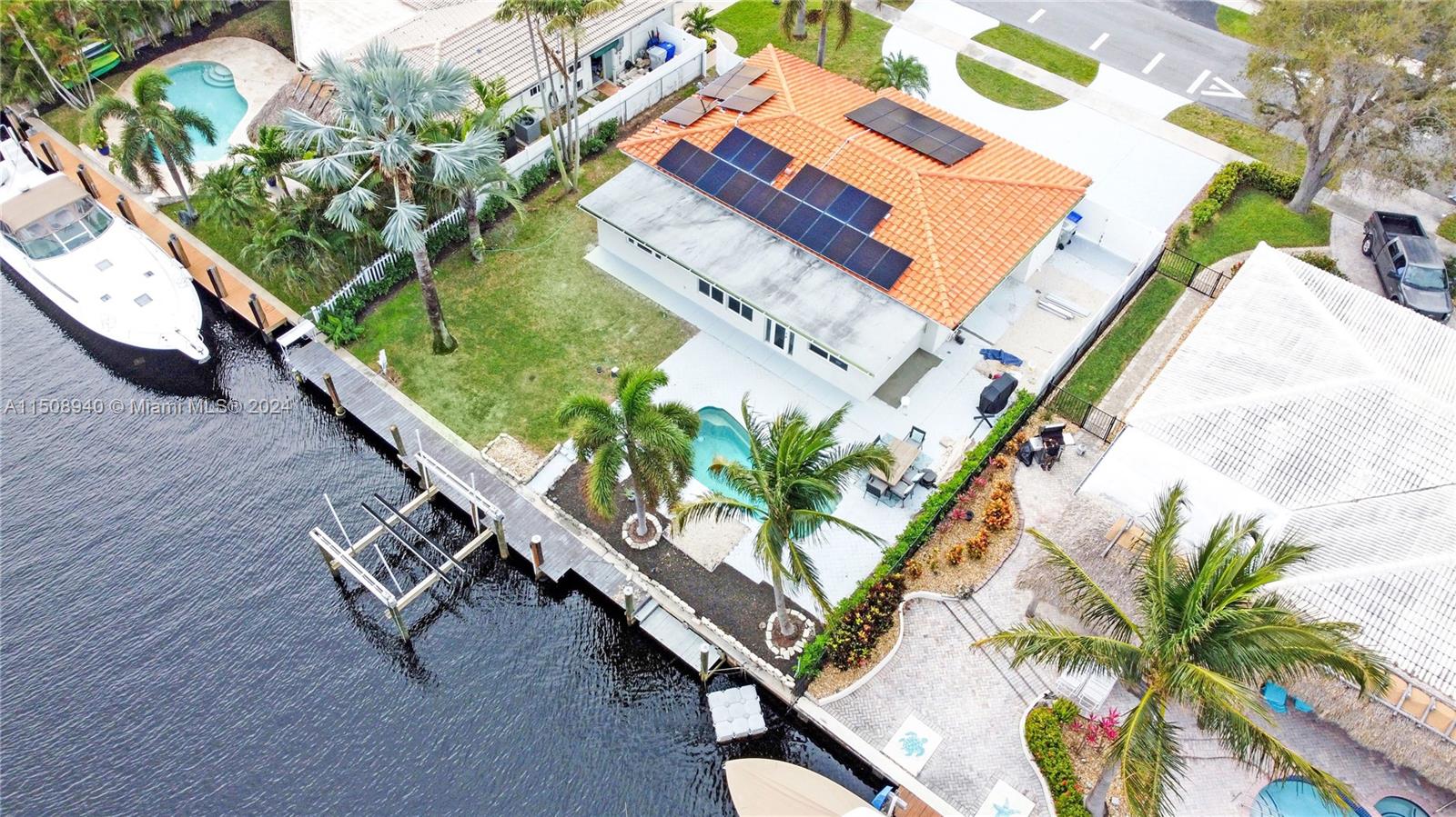 TOTALLY REMODELED OCEAN ACCESS WATERFRONT MASTERPIECE! 10 mins to the intercoastal on your large boat! This spectacular home features 4 BDRMS, 2 BATH, garage, pool and 70 ft of waterfront with ocean access. Solar panels, brand new boat lift for up to 16K lbs,. New impact windows, new ceilings with beautiful lighting, new pvc flooring, & new paint job in interior & exterior. Remodeled baths with designer touches. Kitchen boasts quartz counters, wood cabinets and even a large commercial refrigerator & freezer. New electric window treatments and spectacular view of the pool and water from the dining area. Updated circular driveway, with pvc fencing throughout. Plenty of space for parking additional toys. Pool has salt chlorinator. 1 fixed bridge with space for larger vessels. NO HOA