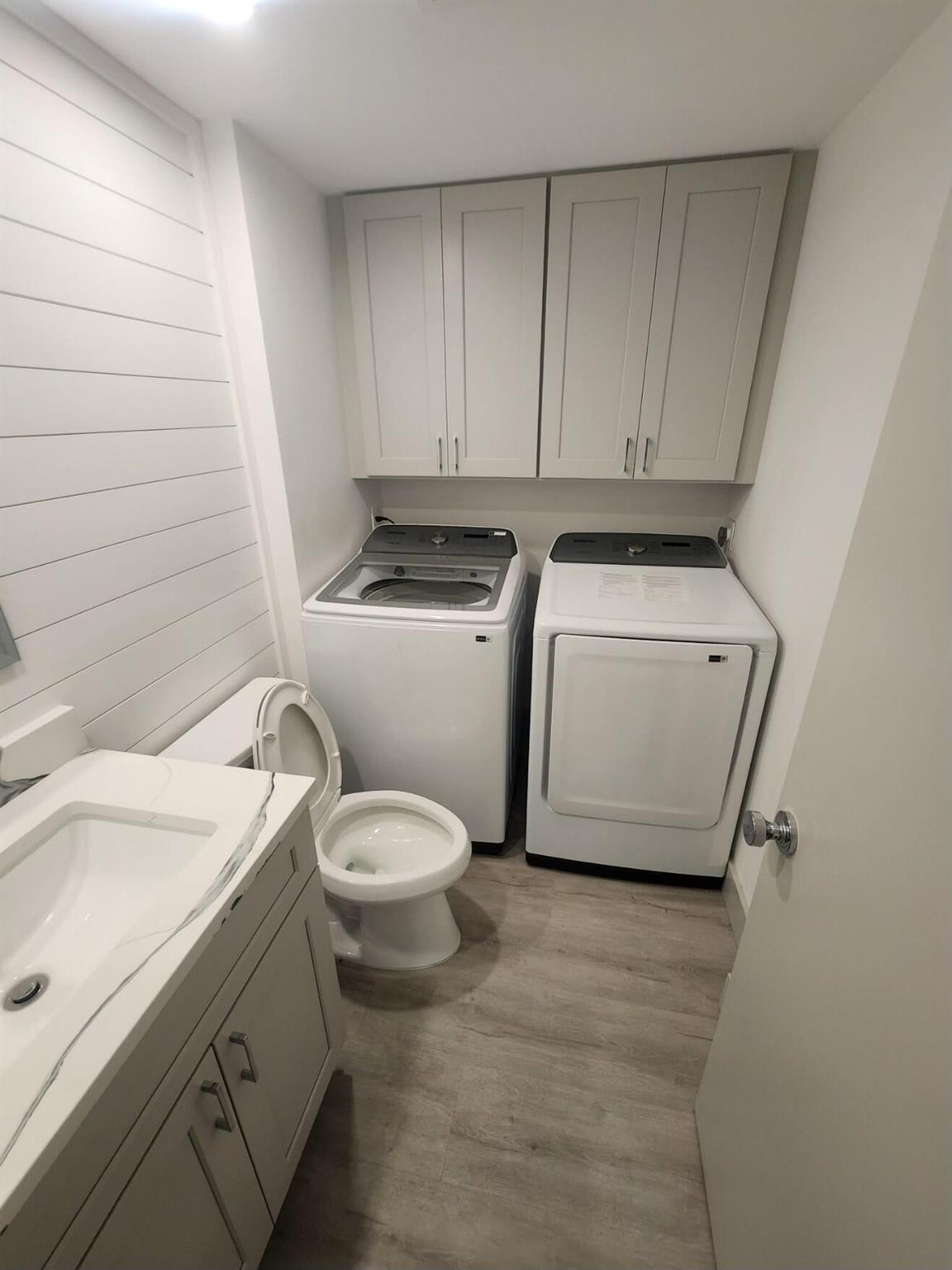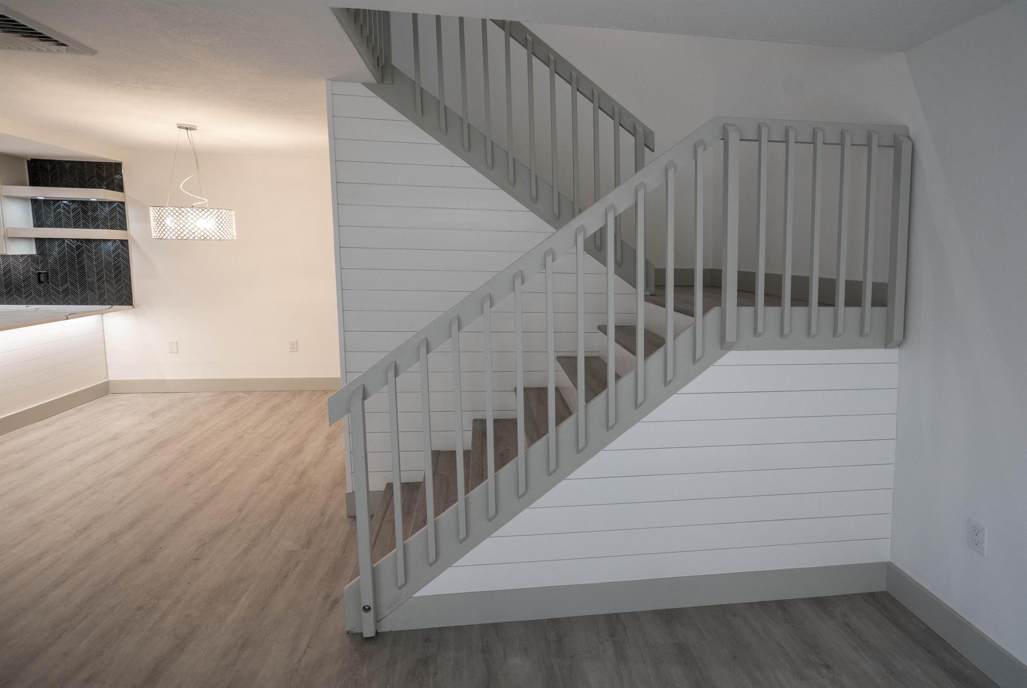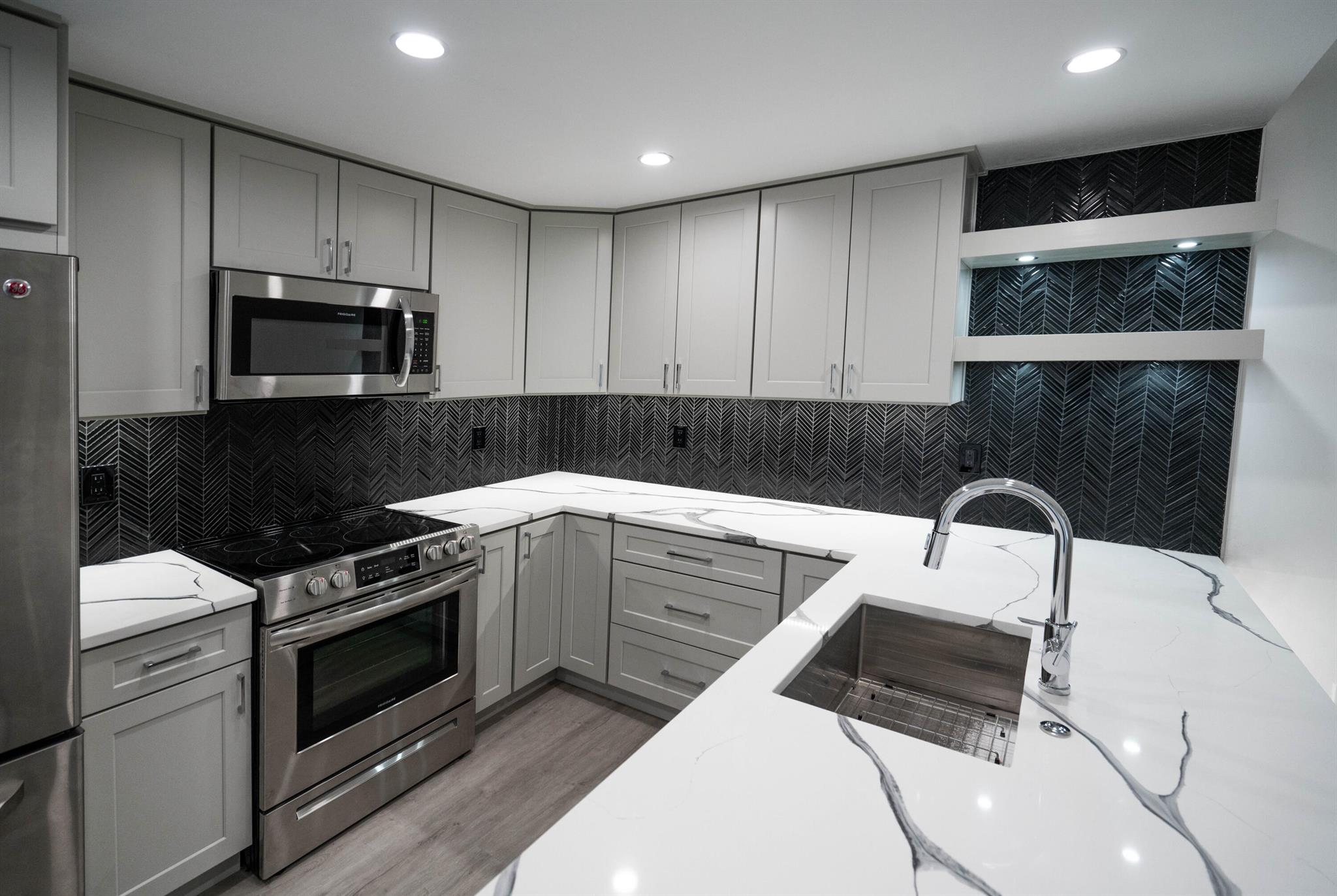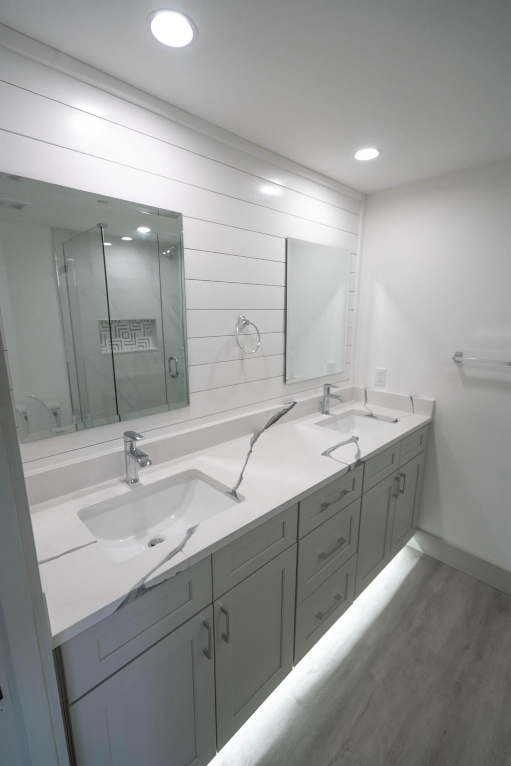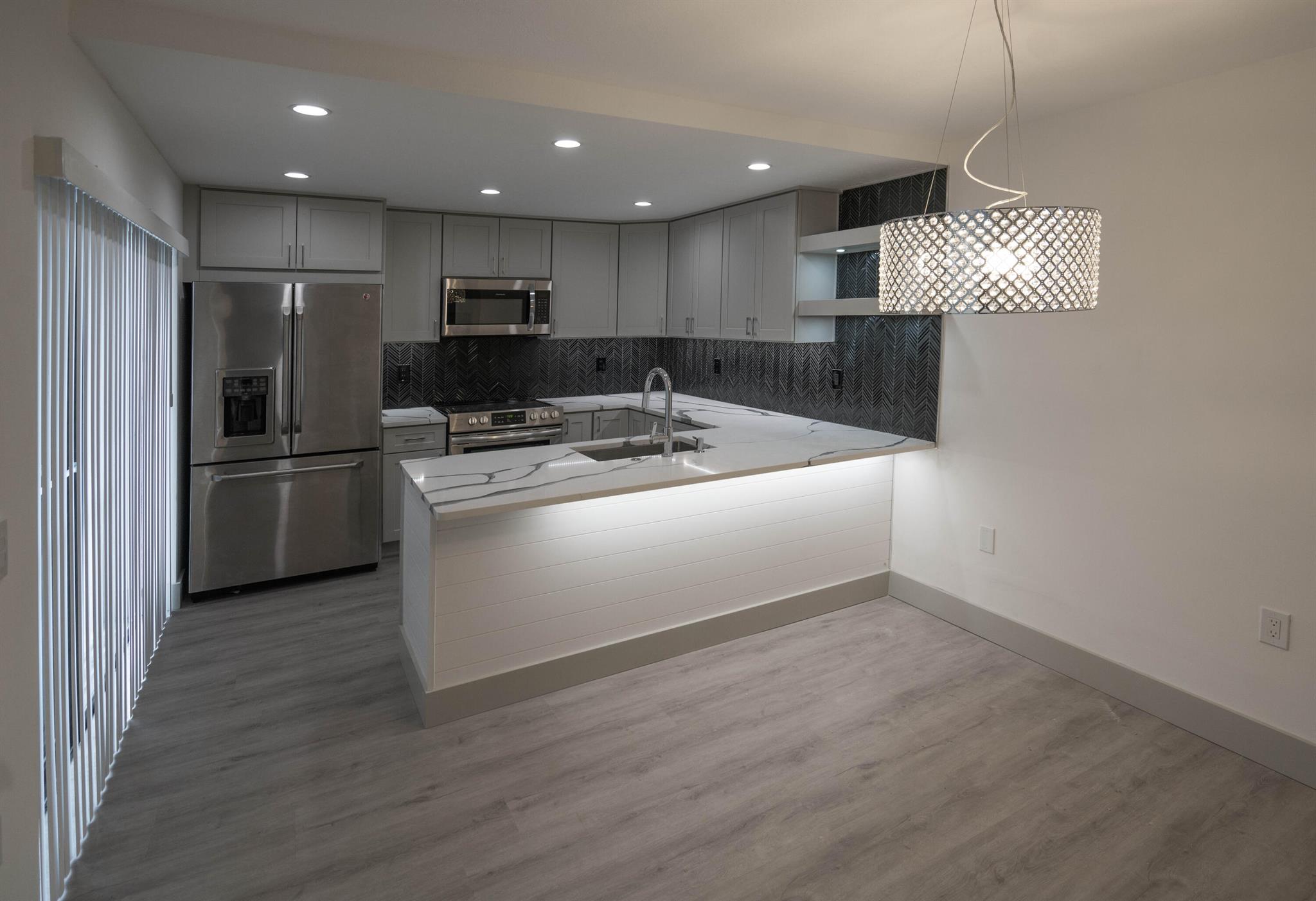 Stunning townhome completely renovated to perfection! Beautiful vinyl plank flooring throughout! Spacious living room with built-in cabinets and lighting. Spectacular kitchen with gray shaker cabinets, sparkling Quartz counters, elegant tile backsplash and GE stainless steel appliances. Downstairs powder room/laundry room elegantly redone. Upstairs boasts generous master suite with huge walk-in closet. Master bath remodeled with dual sinks and mirrors and amazing decorative tile throughout custom shower. Guest bedroom and bath also renovated with new closet doors, LED lights and subway tiled combo tub/shower. Both bedrooms have their own private balconies.