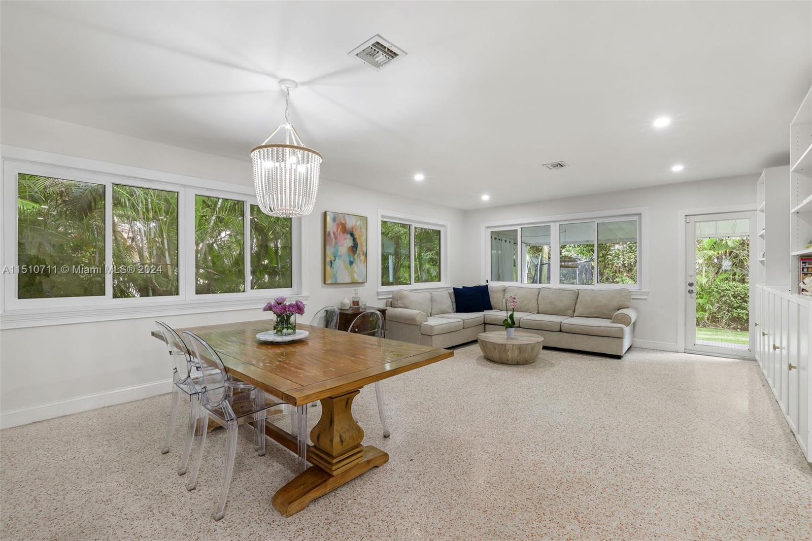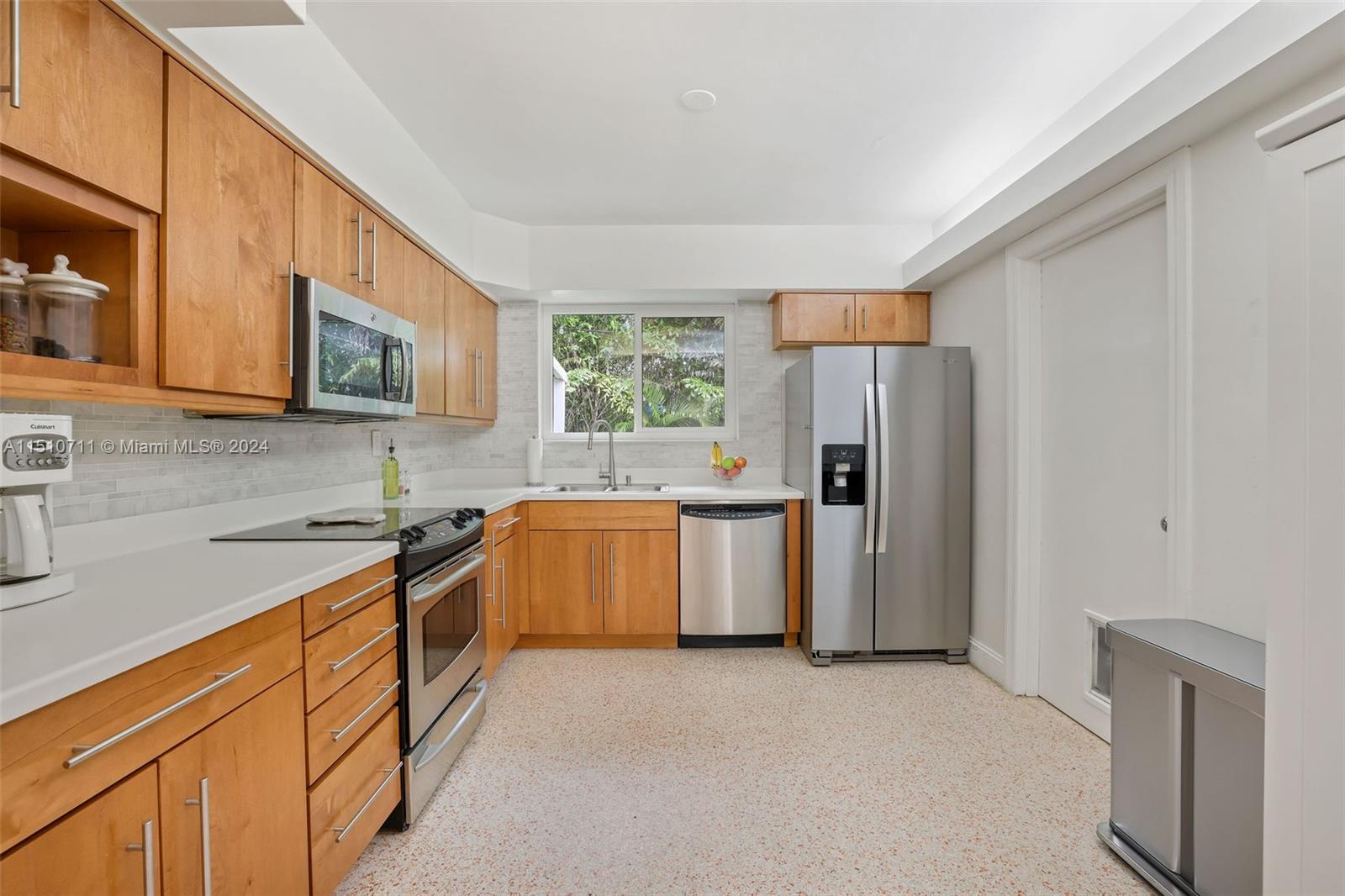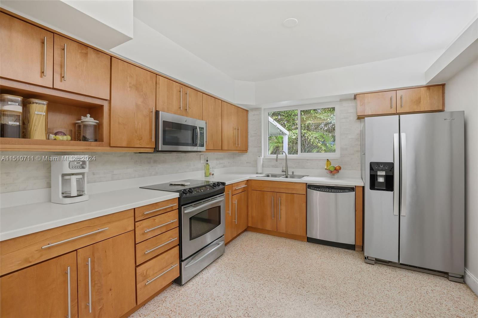 Pride of ownership! Cherished home in north Coral Gables on a no-through street. This home is quiet, well maintained, and substantially updated, with impact glass windows and remodeled bathrooms. The previously renovated spacious kitchen is modern with real wood cabinetry. It's in fabulous condition! There's terrazzo flooring throughout, displaying the home's original flair. Decorative features, including the modern wood wall covering installations and recessed lighting, give the home a vibrant and youthful energy. There's good closet and storage space. Ample fenced yard with privacy hedge has adorable deck - seating area. Come, see, and make this wonderful home your own!