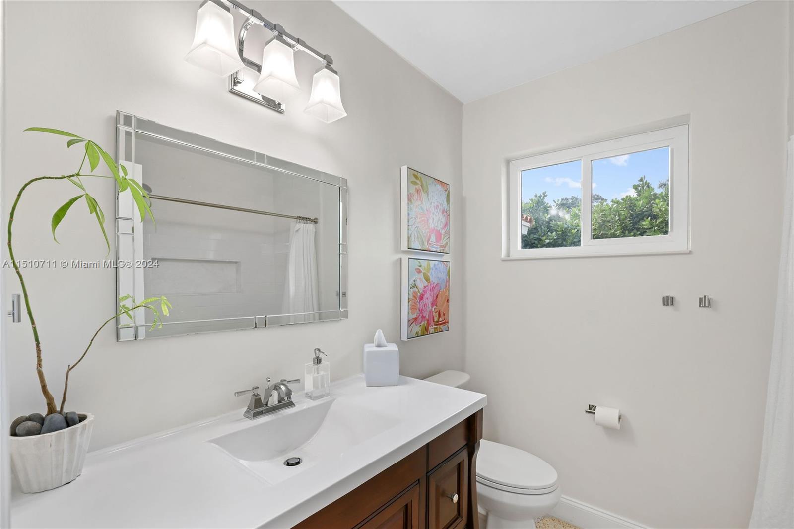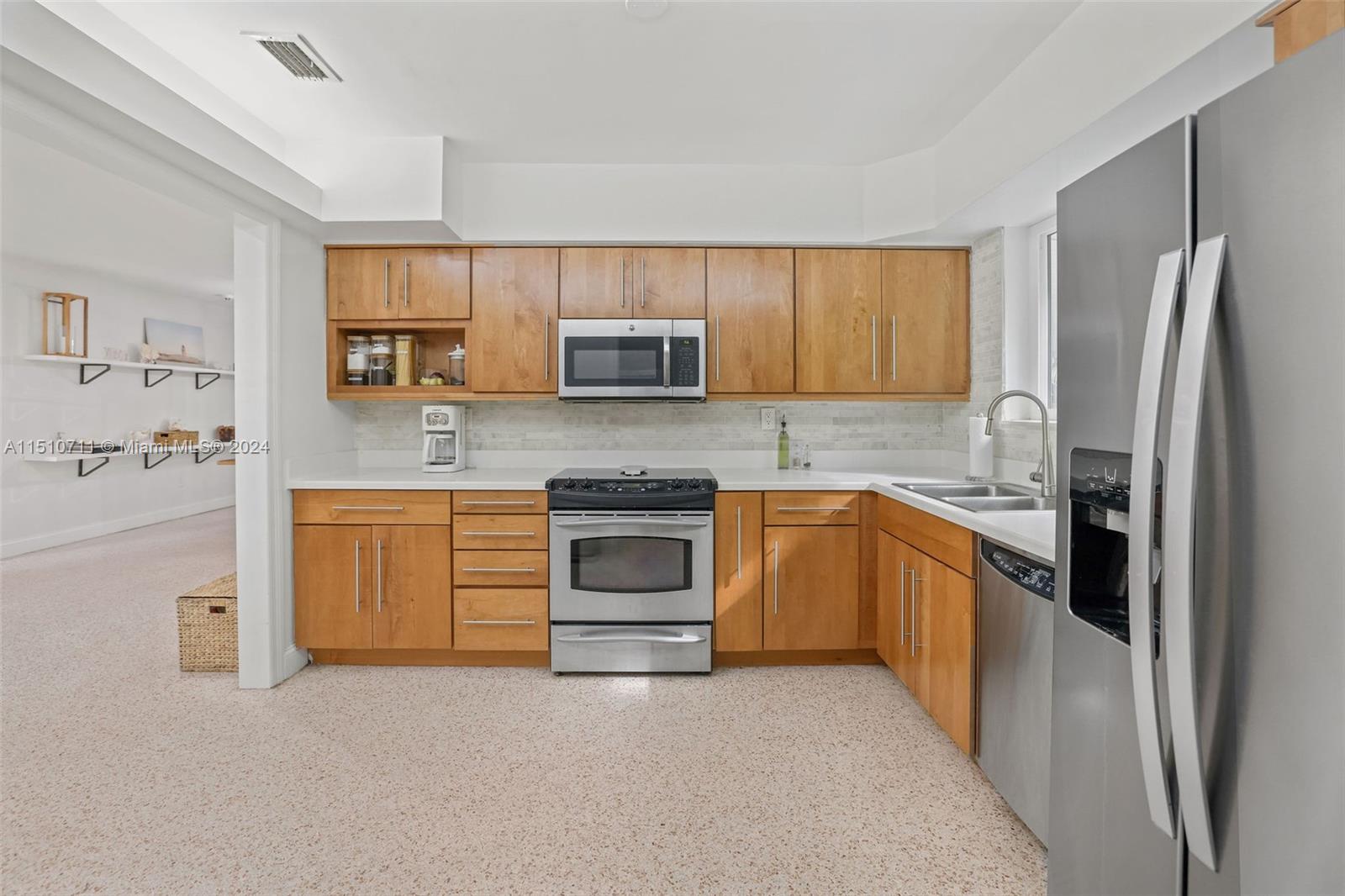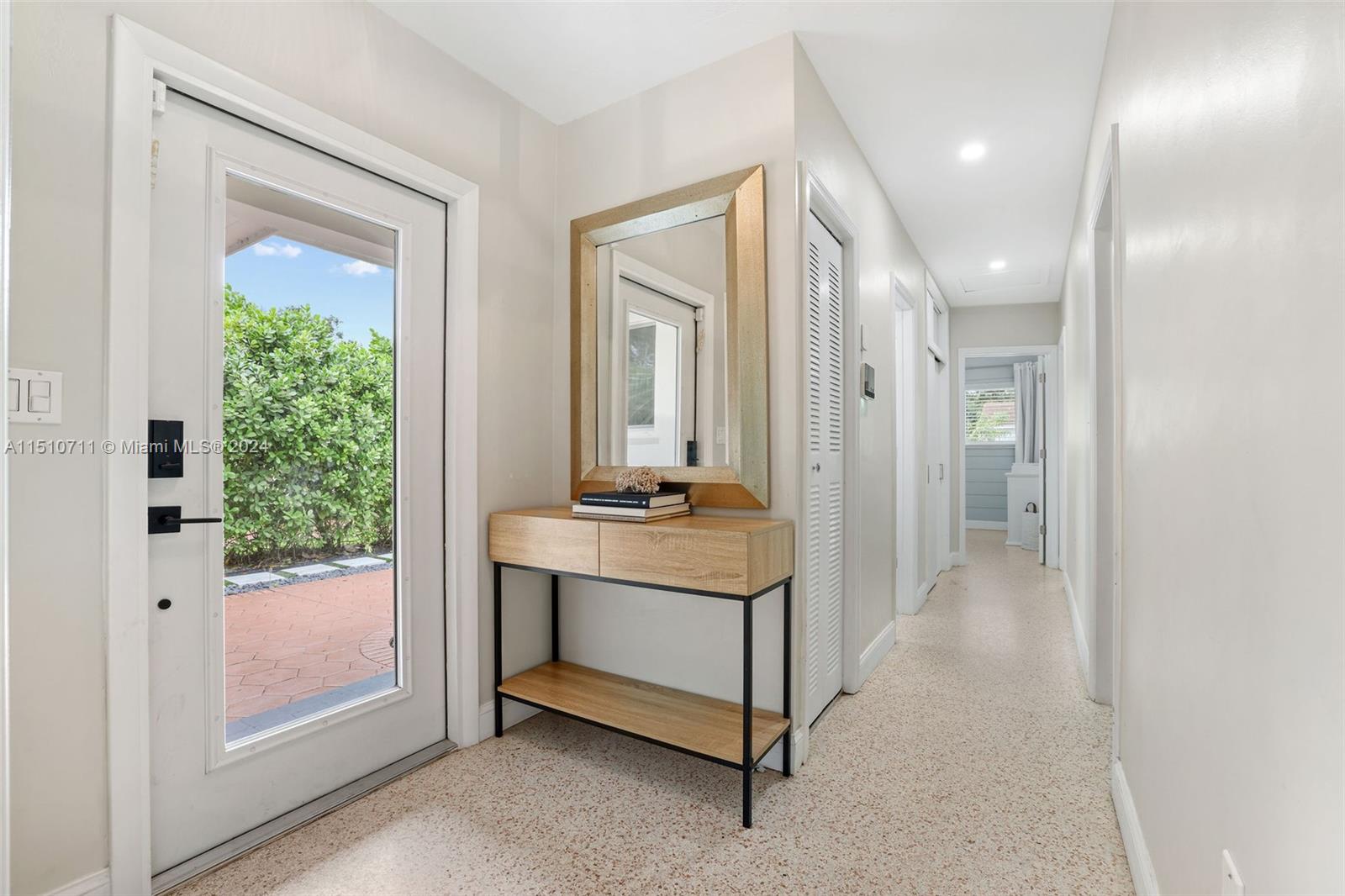 Pride of ownership! Cherished home in north Coral Gables on a no-through street. This home is quiet, well maintained, and substantially updated, with impact glass windows and remodeled bathrooms. The previously renovated spacious kitchen is modern with real wood cabinetry. It's in fabulous condition! There's terrazzo flooring throughout, displaying the home's original flair. Decorative features, including the modern wood wall covering installations and recessed lighting, give the home a vibrant and youthful energy. There's good closet and storage space. Ample fenced yard with privacy hedge has adorable deck - seating area. Come, see, and make this wonderful home your own!