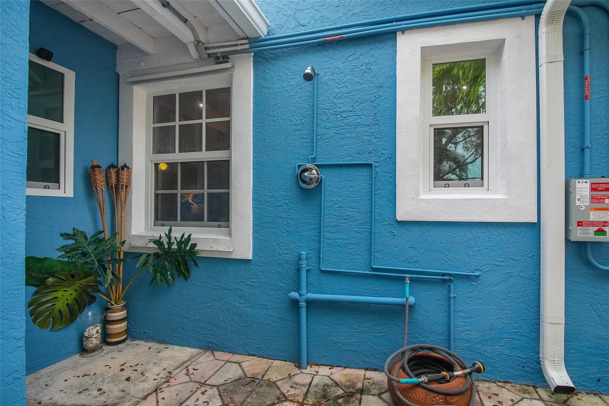 • Exterior Feature:EnclosedPorch, Fence, FruitTrees, SecurityHighImpactDoors, Lighting, OutdoorShower, Shed