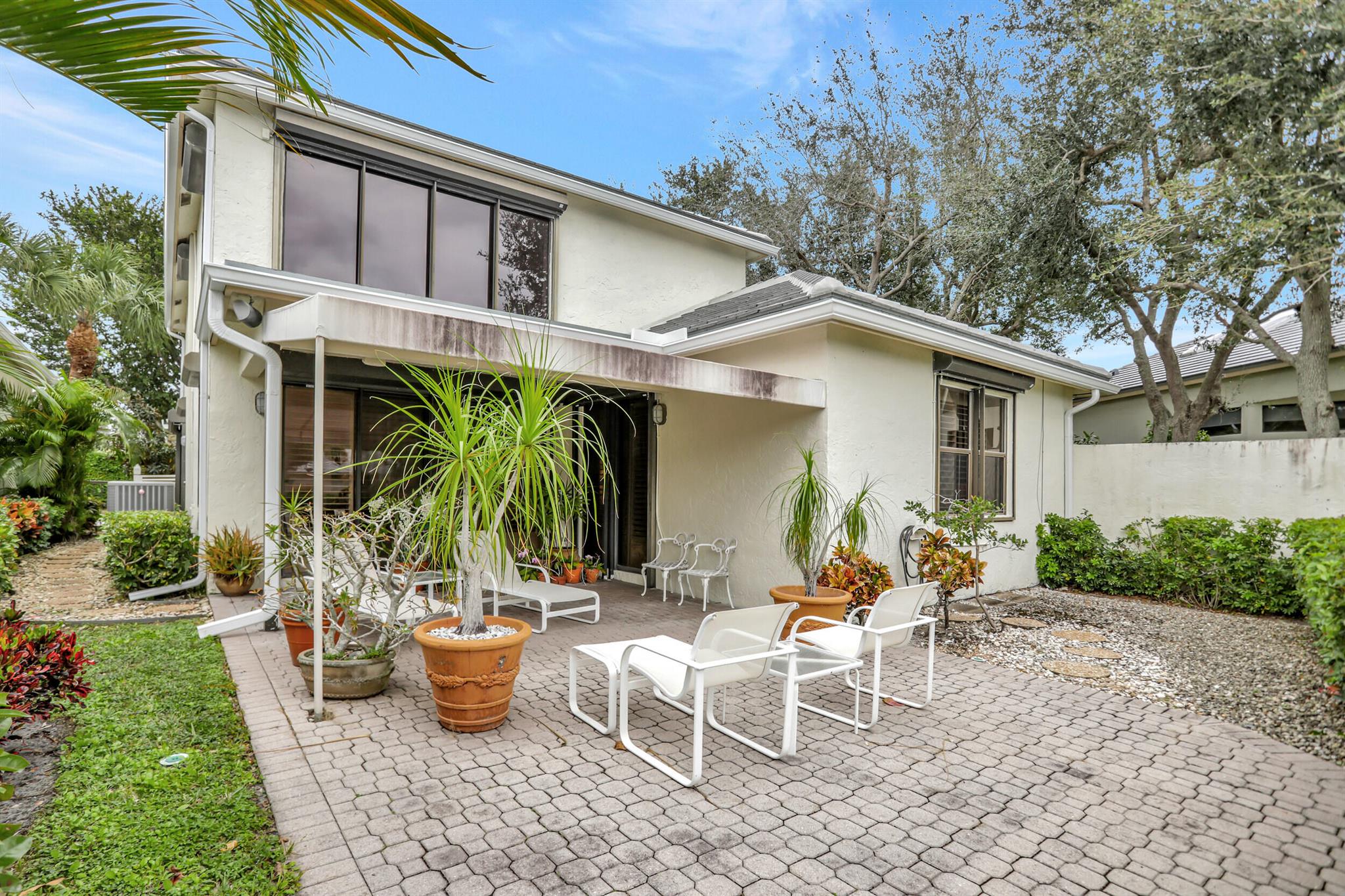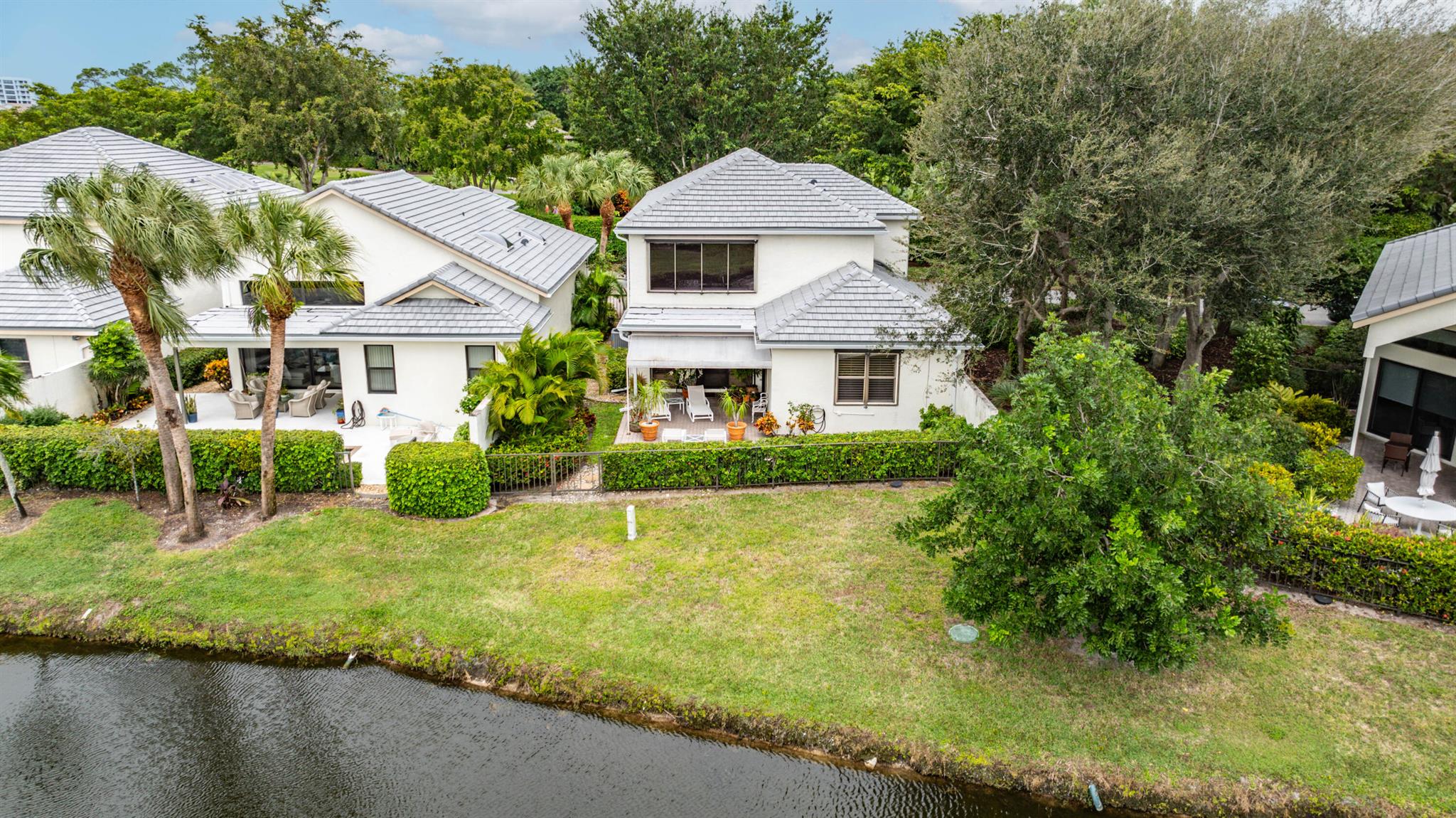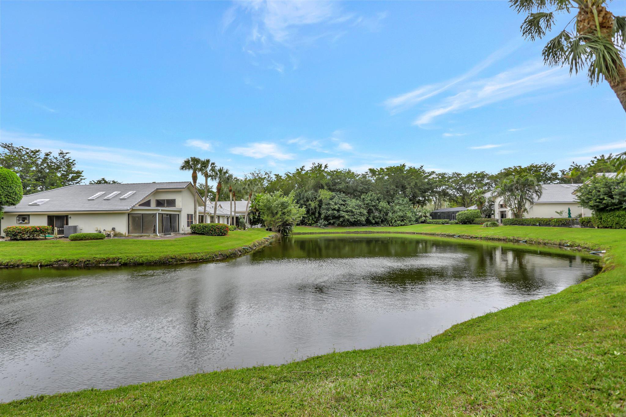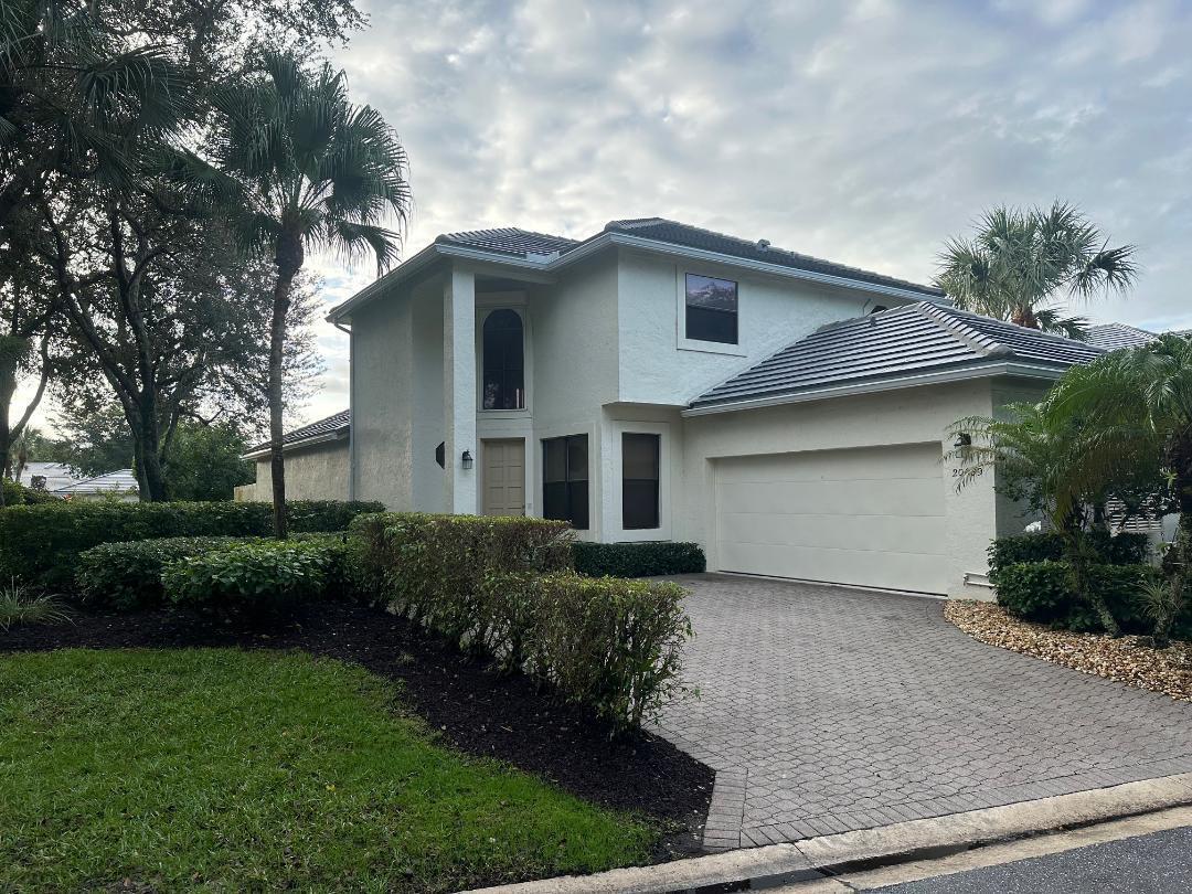 A very special offering! Waters Edge two story 3 bedroom, 2.5 bath free standing patio home located on a water front lot. Southwestern exposure. Only 18 free standing home in this community. Master is on the main level. Large open living area with skylights plus separate family room and kitchen. Tiled living areas. Covered and open patio areas with removable awning. Large open area to the side of the home. New roof just completed in 2024. A/C in 2016. Partial Hurricane shutters on the main level. Full 2 car garage. Being offered unfurnished with basic furnishings negotiable. Club membership required at $115,000. plus a $10,000. contribution to the Boca West Master Association for all new members into Boca West CC. Being sold 'as is' with the right to inspect.