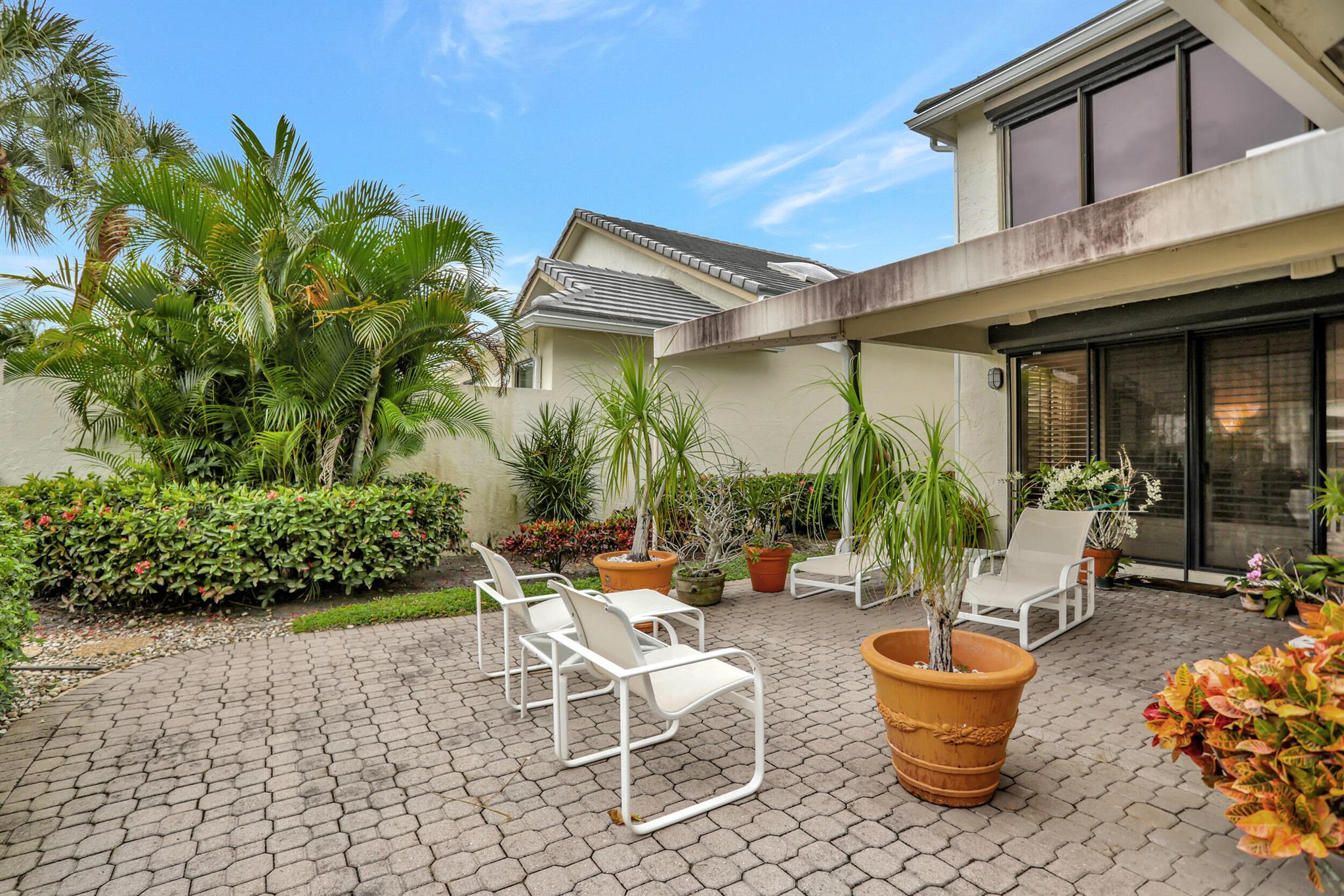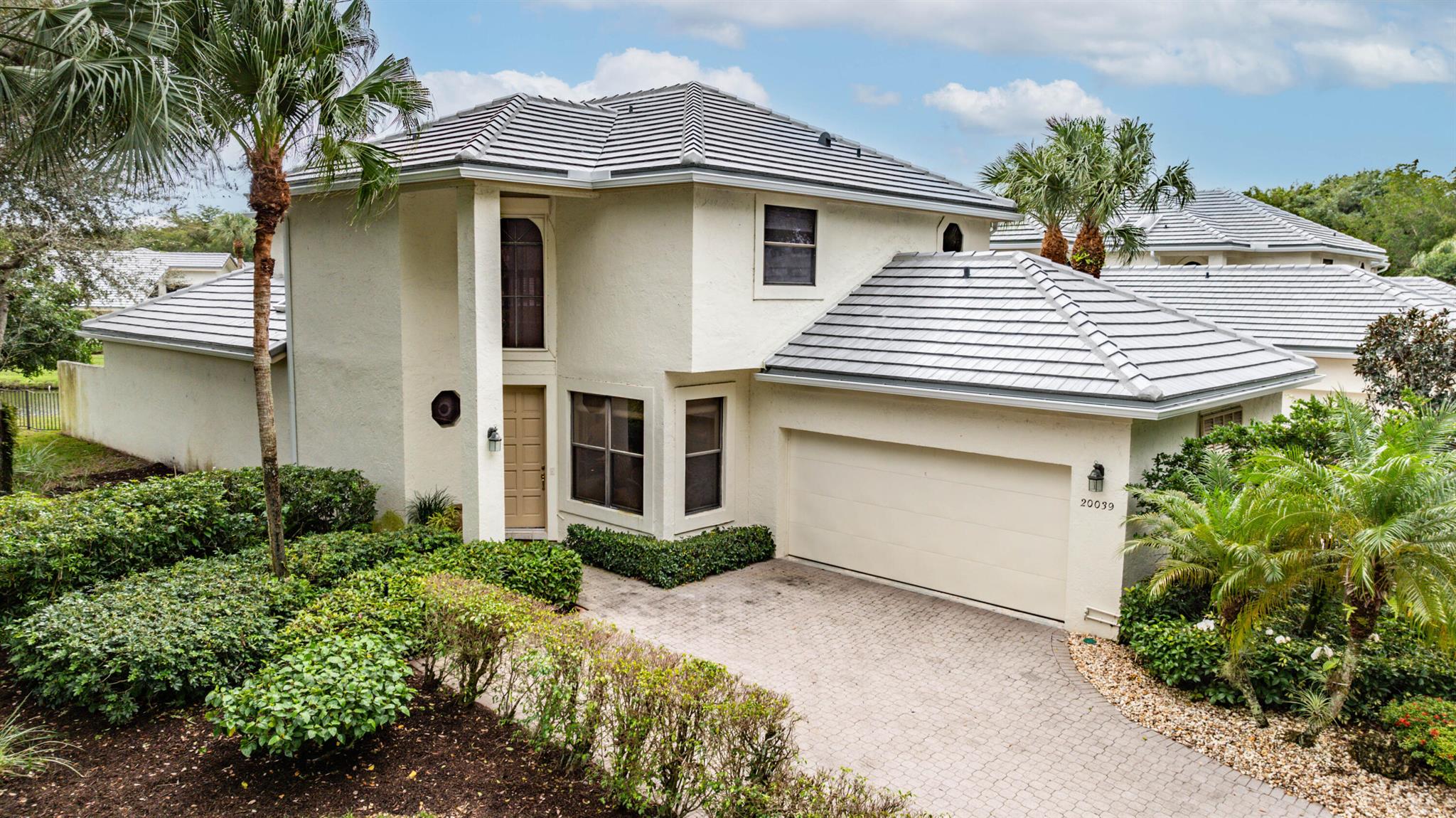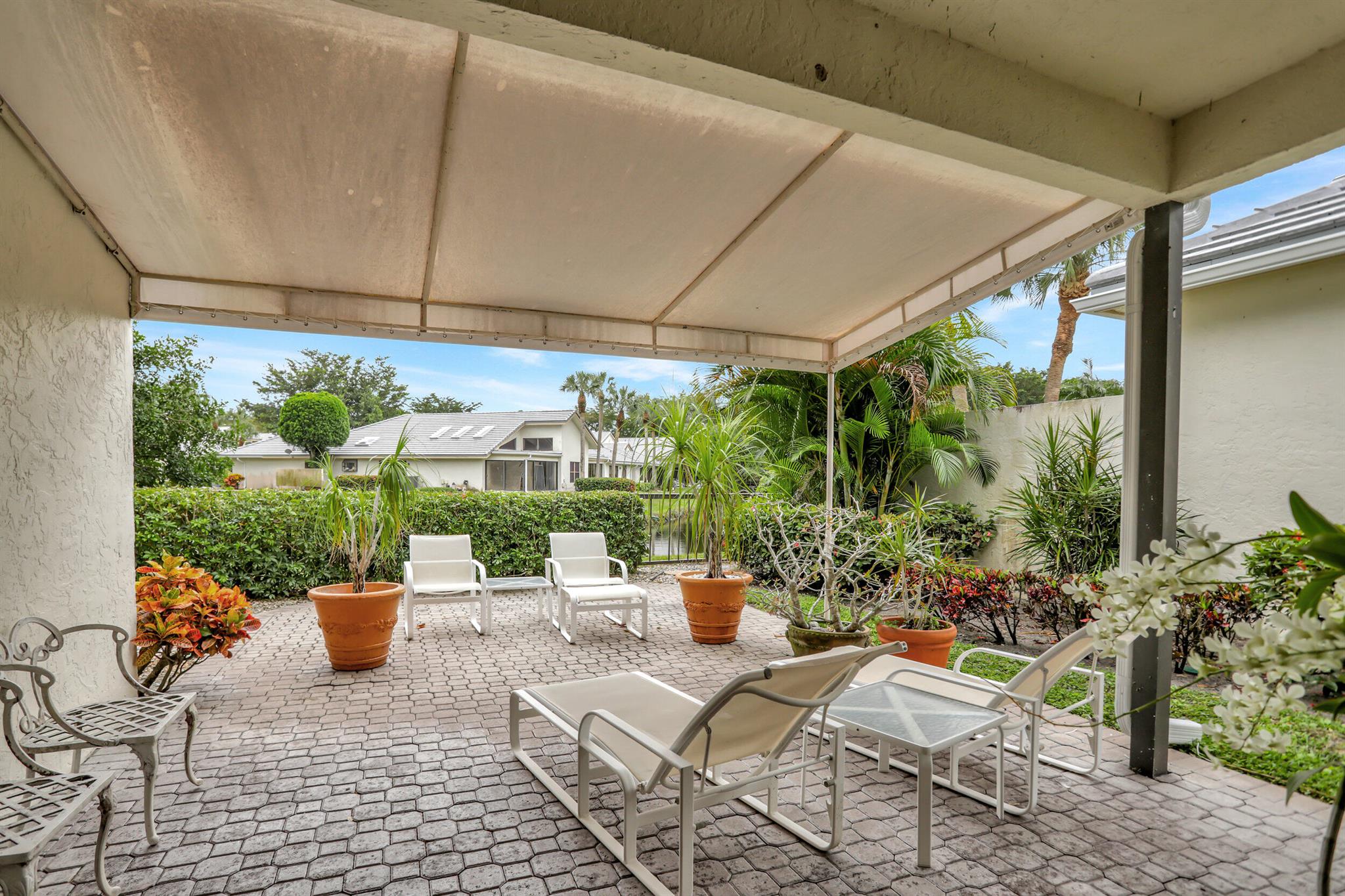 A very special offering! Waters Edge two story 3 bedroom, 2.5 bath free standing patio home located on a water front lot. Southwestern exposure. Only 18 free standing home in this community. Master is on the main level. Large open living area with skylights plus separate family room and kitchen. Tiled living areas. Covered and open patio areas with removable awning. Large open area to the side of the home. New roof just completed in 2024. A/C in 2016. Partial Hurricane shutters on the main level. Full 2 car garage. Being offered unfurnished with basic furnishings negotiable. Club membership required at $115,000. plus a $10,000. contribution to the Boca West Master Association for all new members into Boca West CC. Being sold 'as is' with the right to inspect.