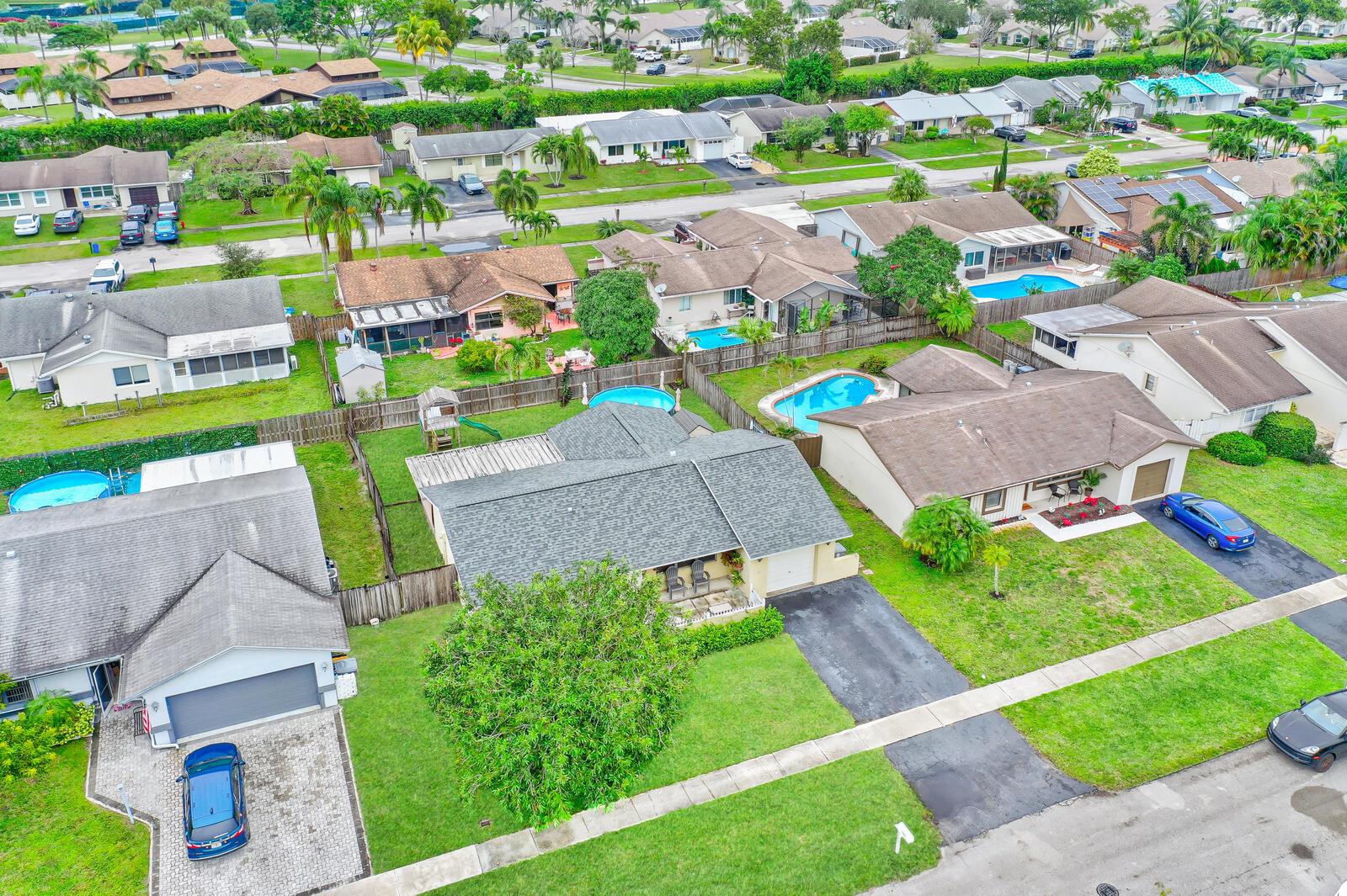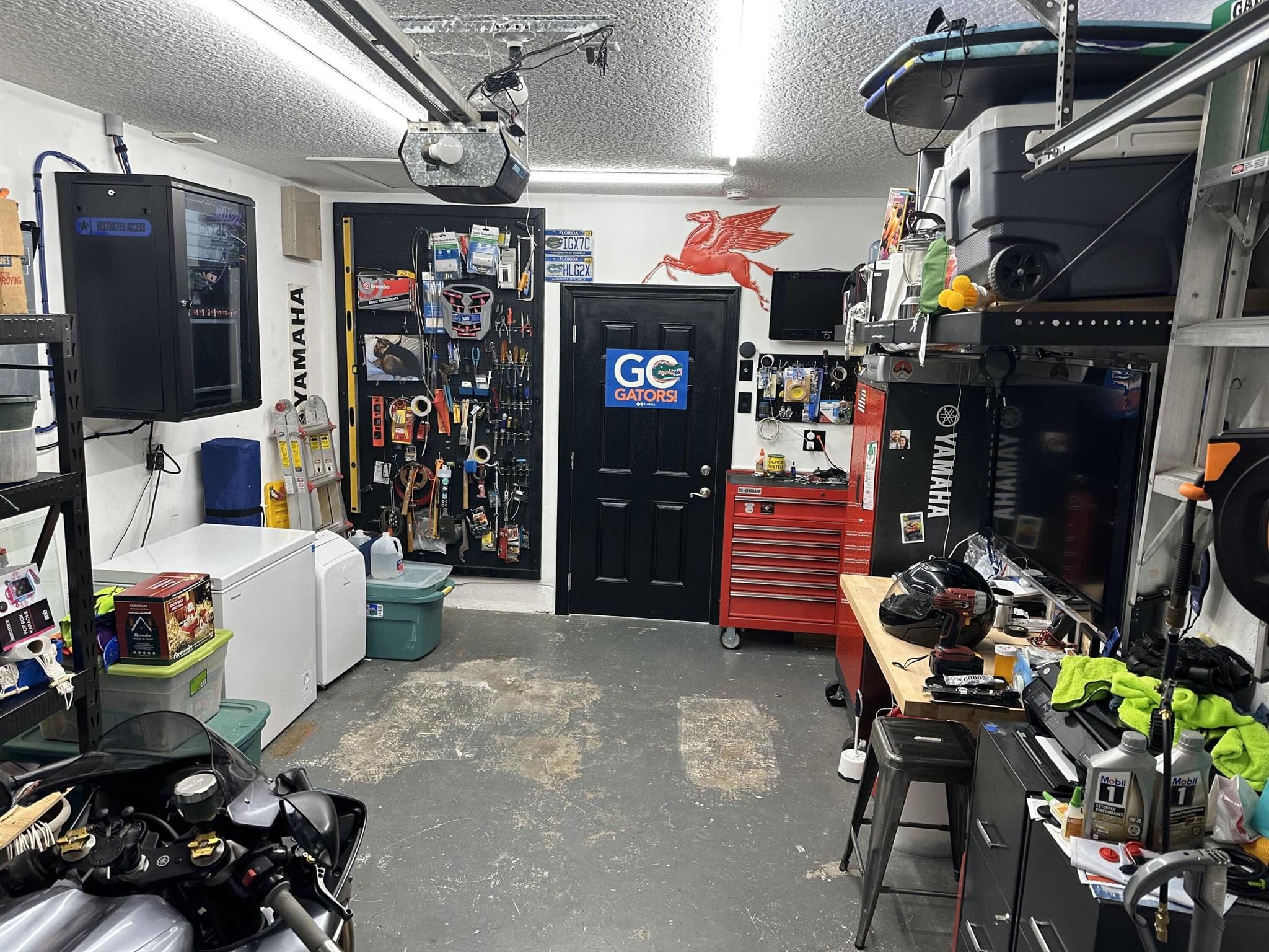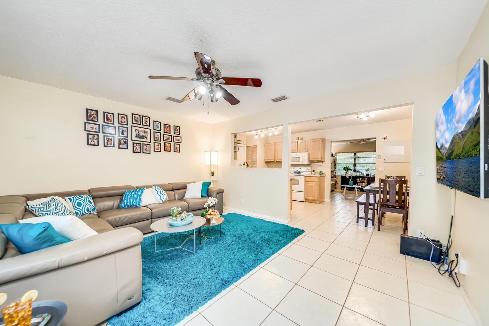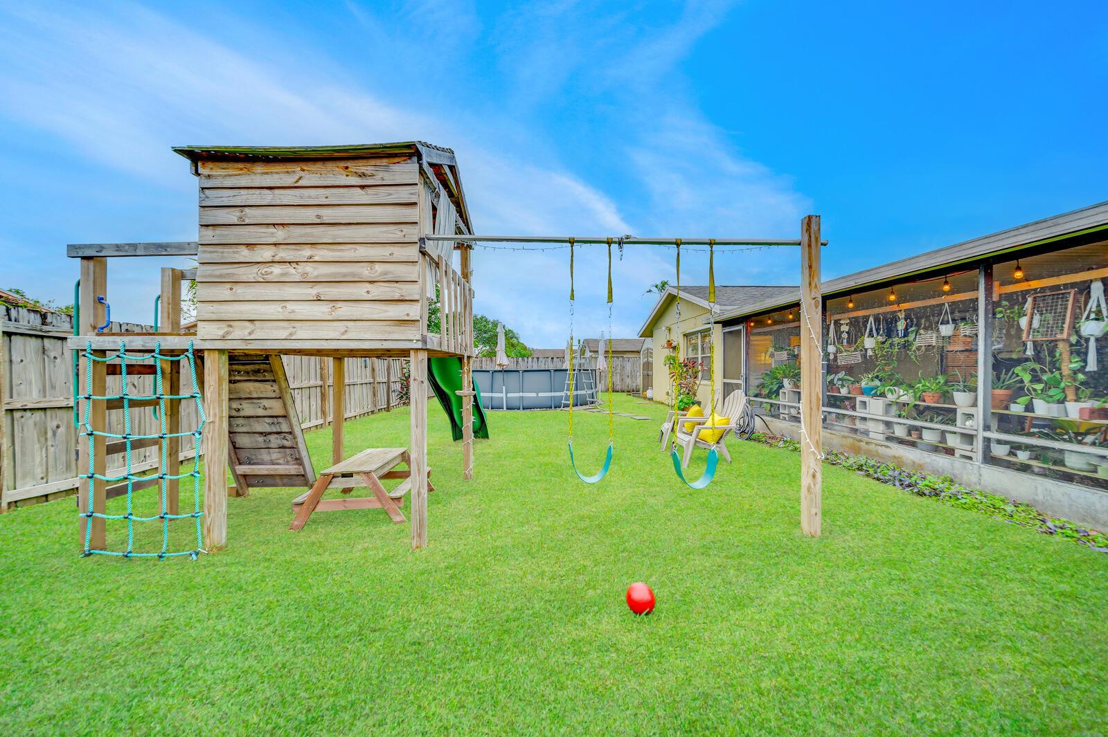 WOW! Open & bright 3 bedrooms, 2 bathrooms, 1 car garage, single family home in Saddlebrook/Spanish Isles! Roof 2019/Water heater 2023 / Air conditioning Oct 2022. Tile flooring in the living area, laminate in the bedrooms & knockdown ceilings throughout including the garage. Large 8x10 air-conditioned utility room before the garage includes tons of pantry shelving and space for an extra frig/freezer and supplies plus has laundry area with newer washer and dryer. Super clean and well-maintained. French doors with built in, internal blinds lead to the enormous covered/screened-in patio. Fenced in private backyard with a shed & a custom playset including rock wall, cargo net, a fort, 2 swings, a slide and more!