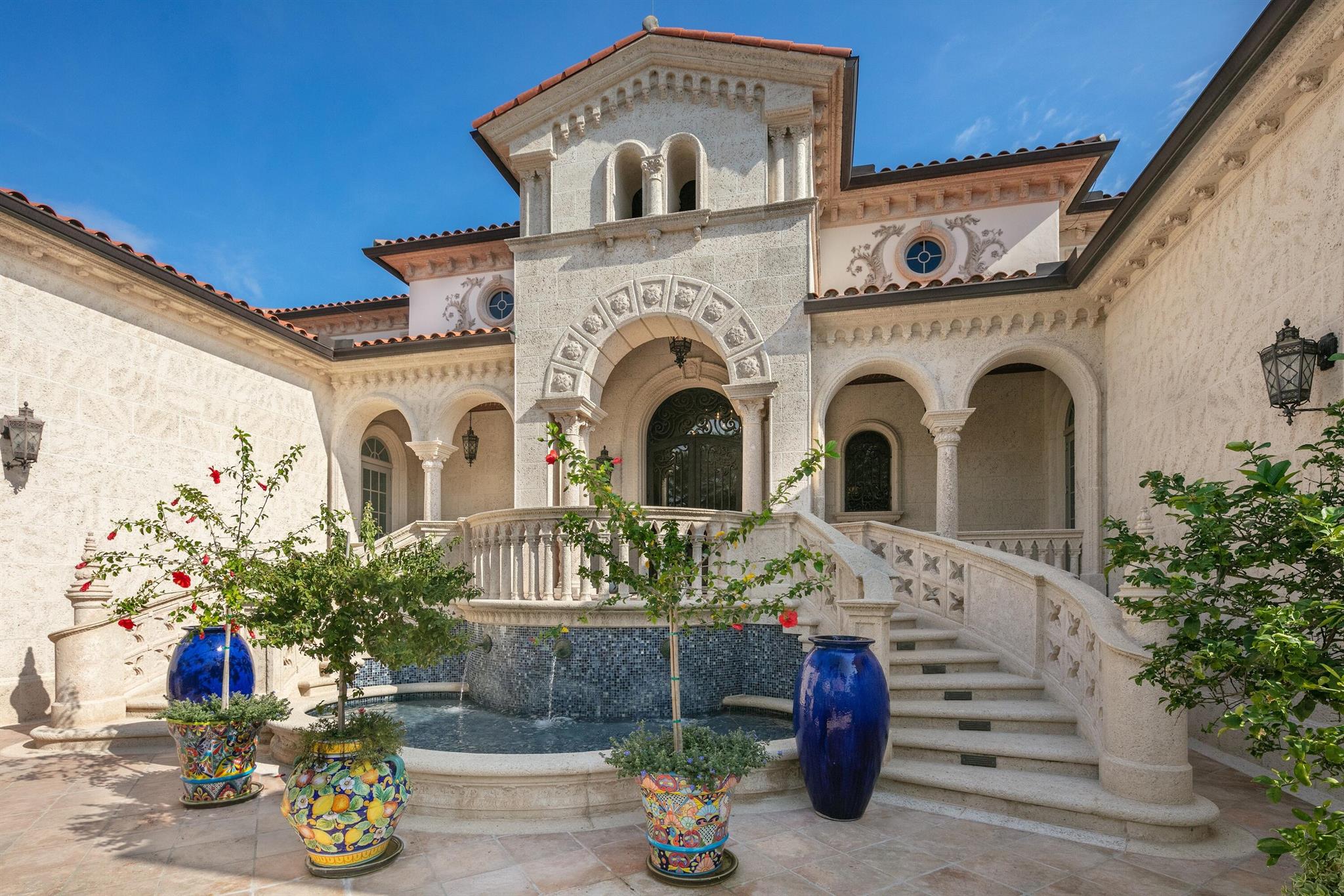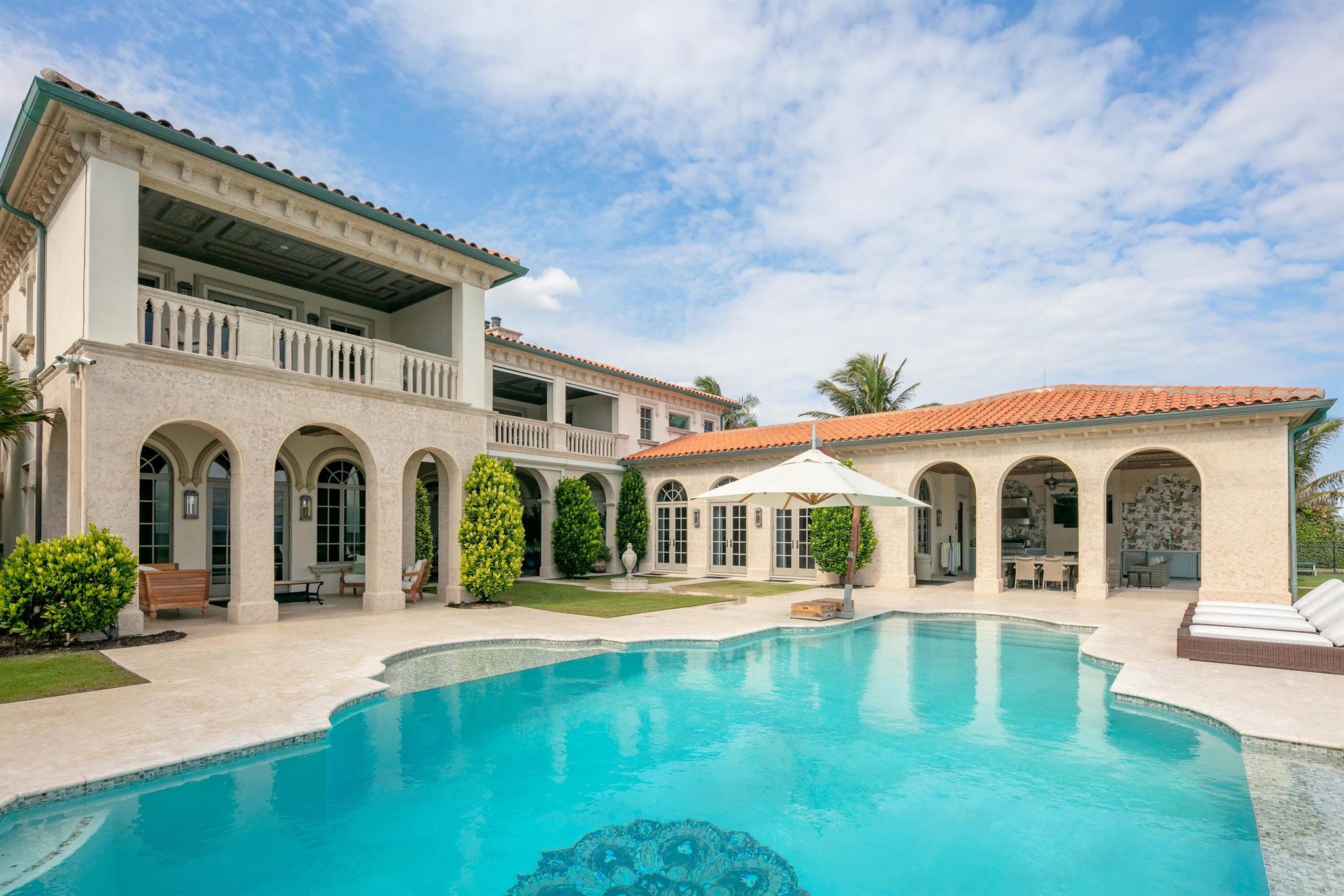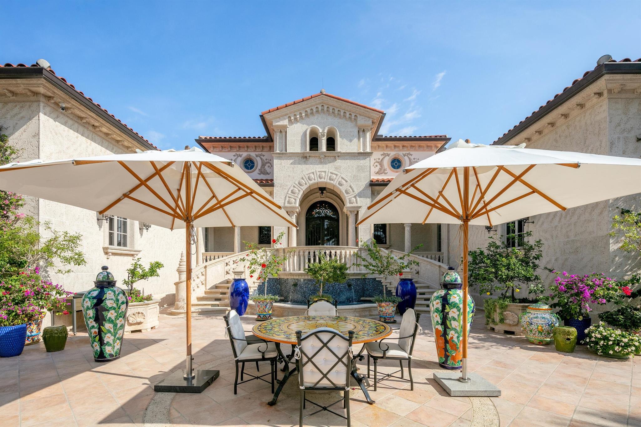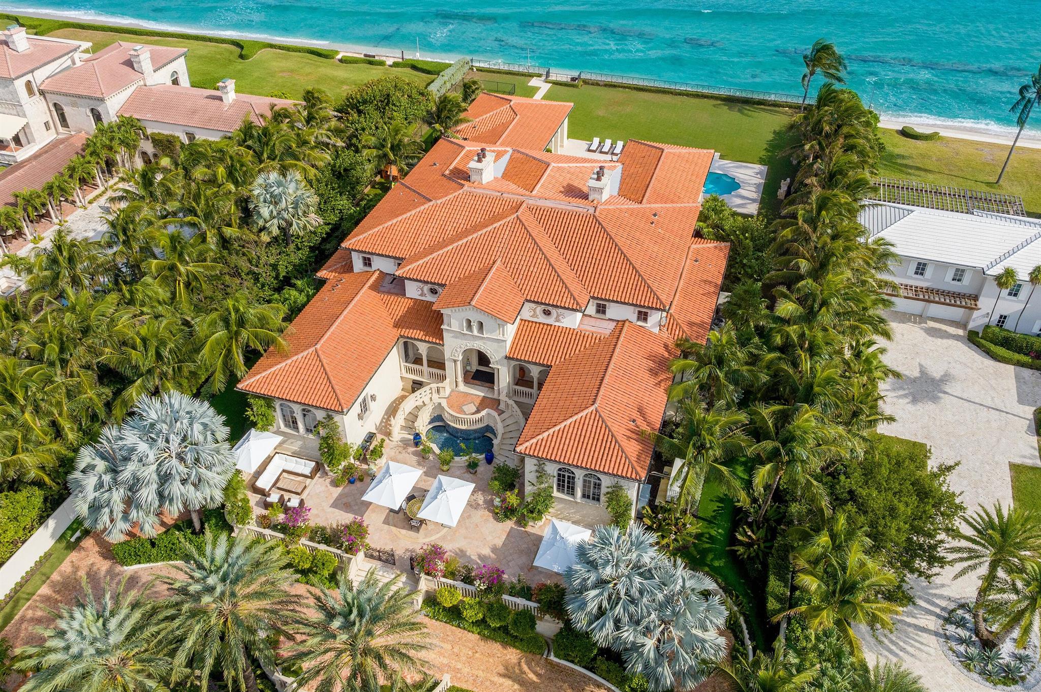 Spectacular Ocean-to-Lake Light and Bright Modern Mediterranean Compound with 9BR/11.3BA and 150 feet +/- of Ocean and Intracoastal frontage. This one-of-a-kind estate features rich details, intricate millwork, and sophisticated finishes. From spectacular reception to oversized living spaces and gorgeous formal dining room, this home is perfect for entertaining. Stunning wrought iron entryway opens to welcoming foyer with sweeping, detailed ceilings, beautiful imperial staircase, and crystal chandelier. Pristine estate with great natural sunlight throughout. Eat-in kitchen with island, china and silverware closet, and butler's pantry. Fabulous theater room connects to pub room with full bar. Paneled library with detailed fireplace. Expansive second floor primary wing with fireplace,