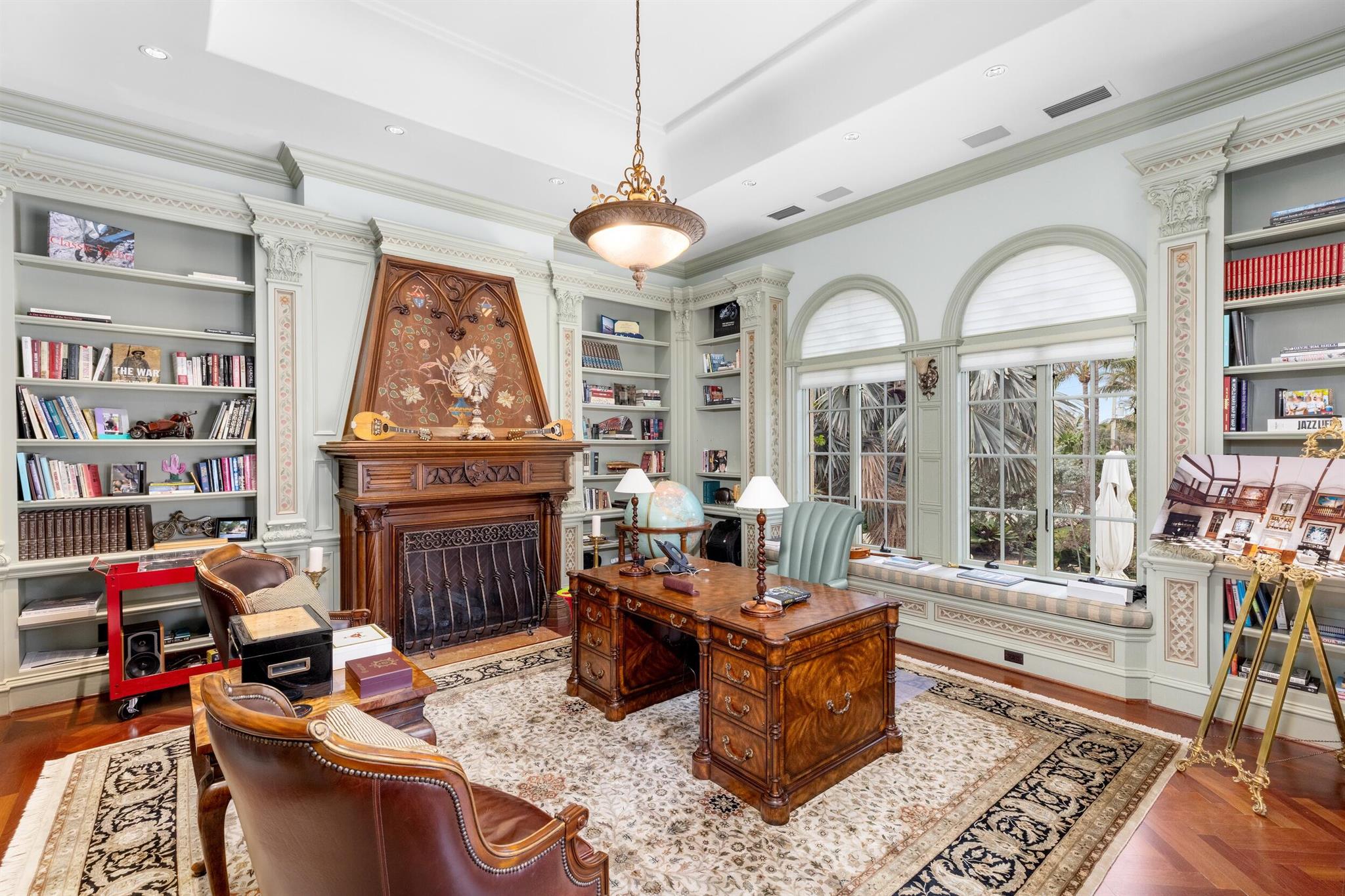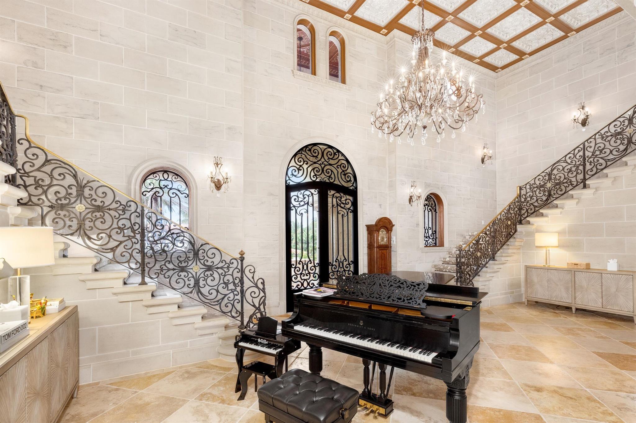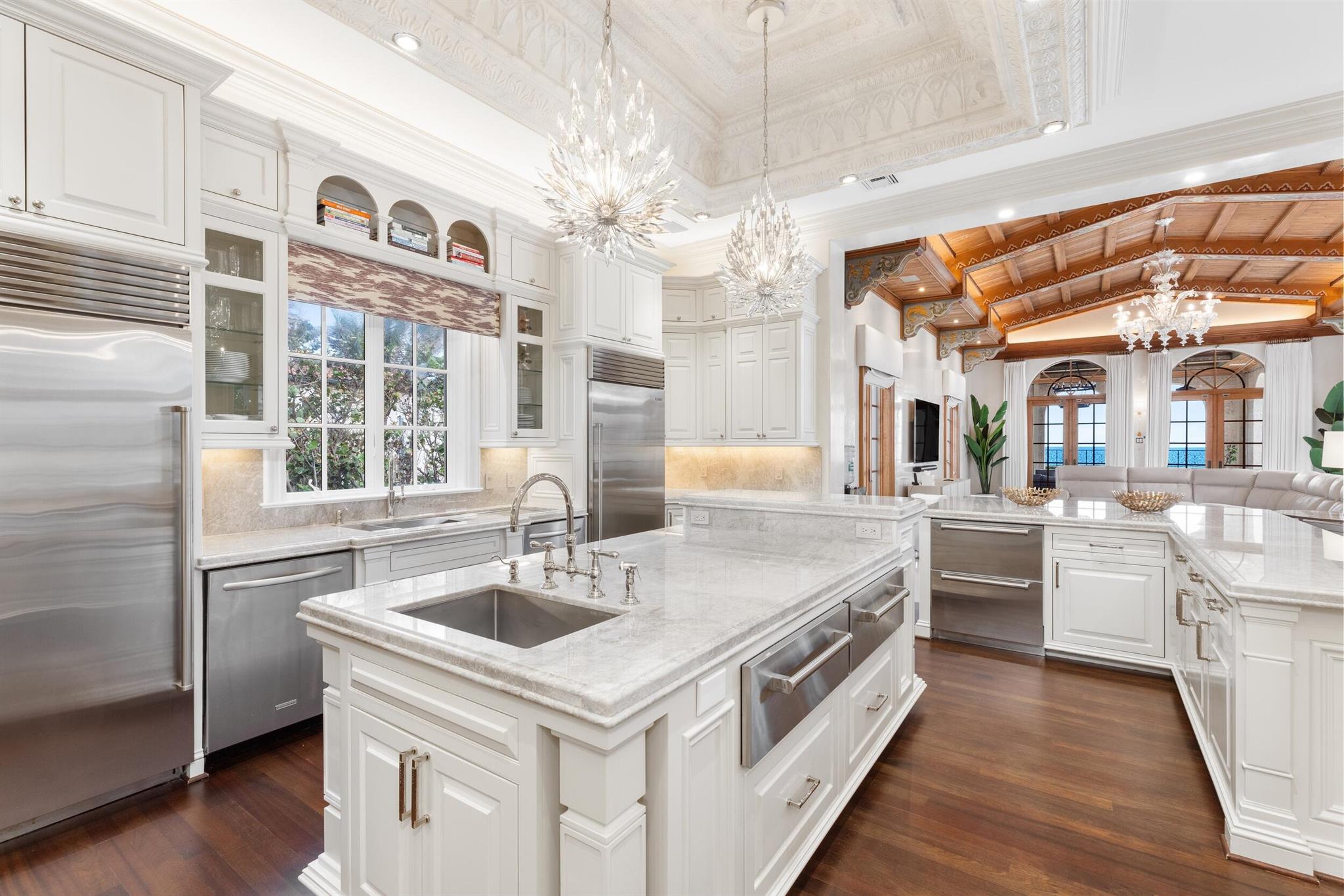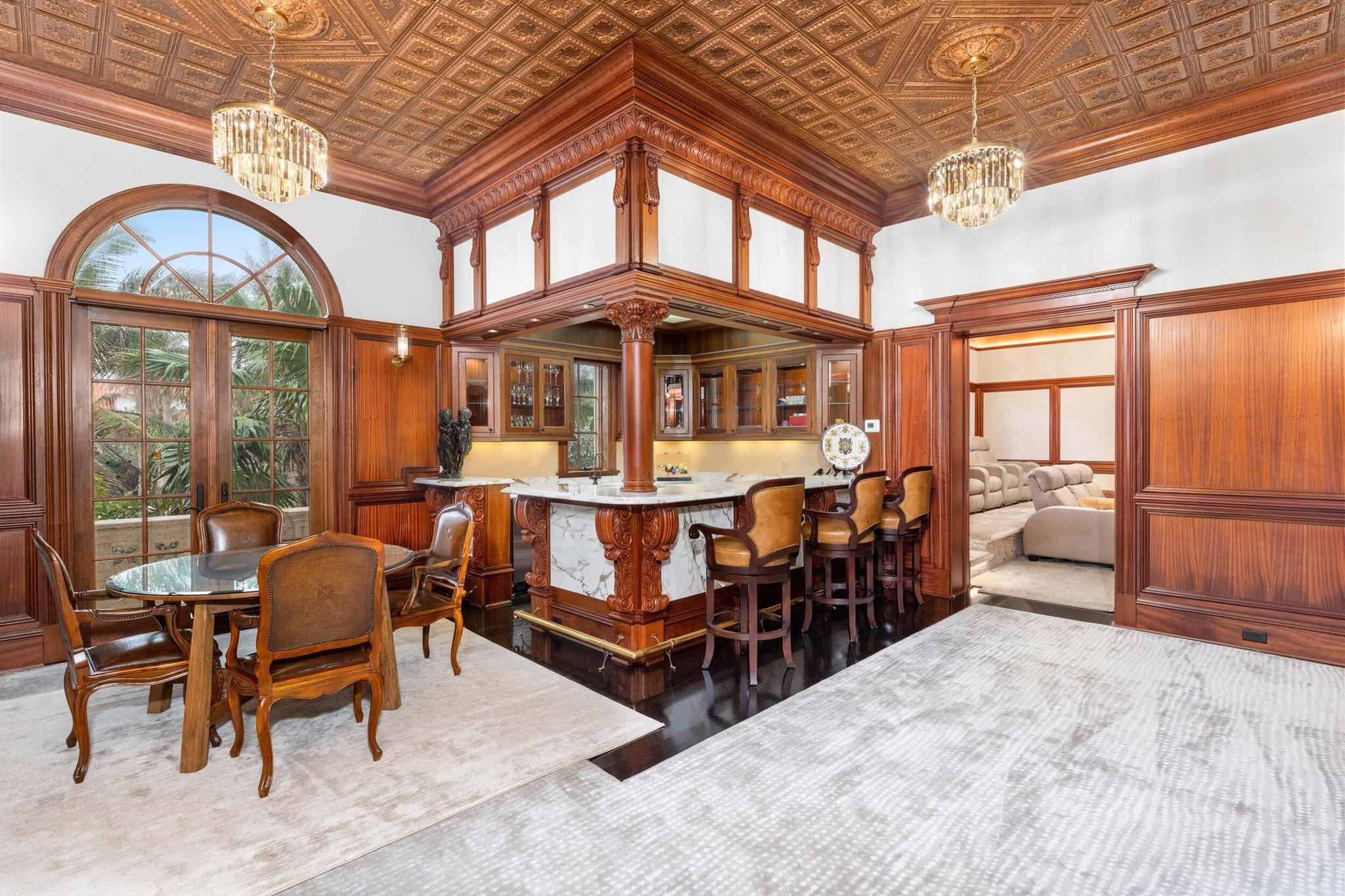 Spectacular Ocean-to-Lake Light and Bright Modern Mediterranean Compound with 9BR/11.3BA and 150 feet +/- of Ocean and Intracoastal frontage. This one-of-a-kind estate features rich details, intricate millwork, and sophisticated finishes. From spectacular reception to oversized living spaces and gorgeous formal dining room, this home is perfect for entertaining. Stunning wrought iron entryway opens to welcoming foyer with sweeping, detailed ceilings, beautiful imperial staircase, and crystal chandelier. Pristine estate with great natural sunlight throughout. Eat-in kitchen with island, china and silverware closet, and butler's pantry. Fabulous theater room connects to pub room with full bar. Paneled library with detailed fireplace. Expansive second floor primary wing with fireplace,