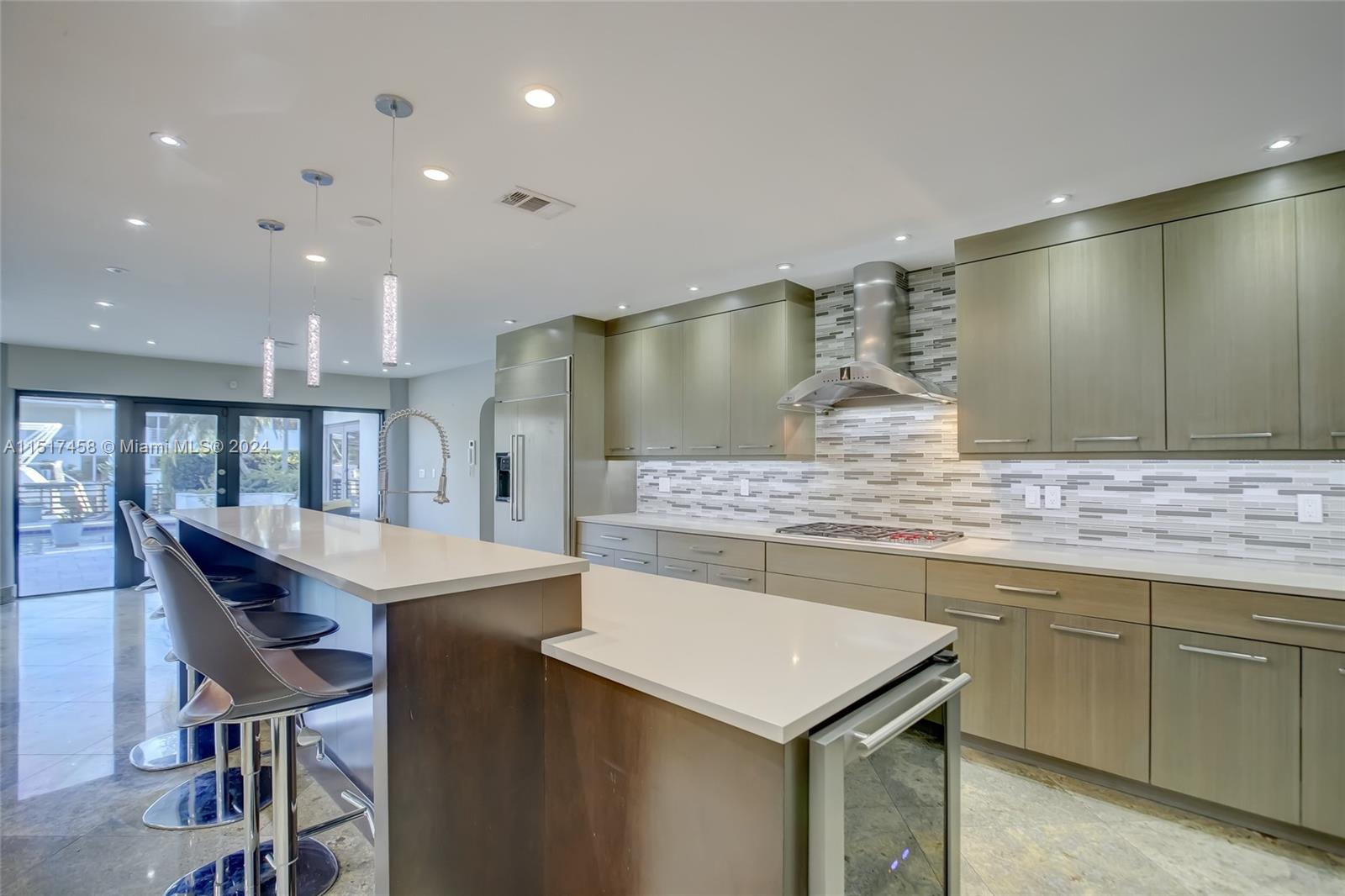 This amazing contemporary home built on 2 lots with large open design, allowing all glass doors to flow openly into the upscale pool and fully equipped outdoor barbecue/ bar area. The large "deep water" 107' dock is perfect for docking your boat or entertaining your friends. The 500 gallon underground gas tank supplies the heated pool with a perfect nighttime ambiance, surrounded by the beautiful lighted landscaping. The gourmet kitchen features upscale Stainless Steel appliances with a Wolf gas range. The kitchen layout is perfect for any intimate or large catered event. A very rare Brazilian tile flows throughout the home. A Miele coffee maker will start your mornings off with coffee. The large temperature controlled wine cellar will hold over 250 bottles of your favorite wines.