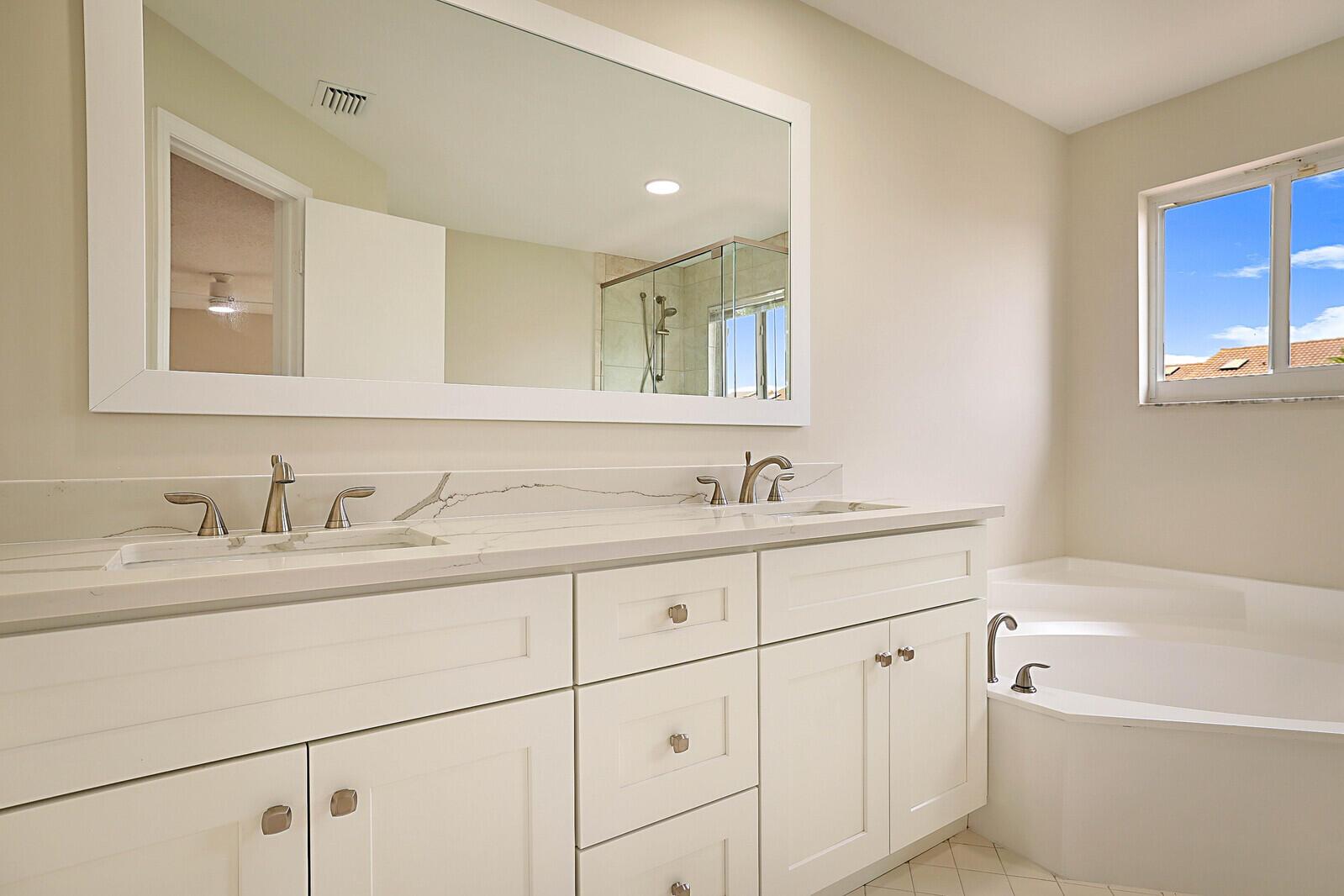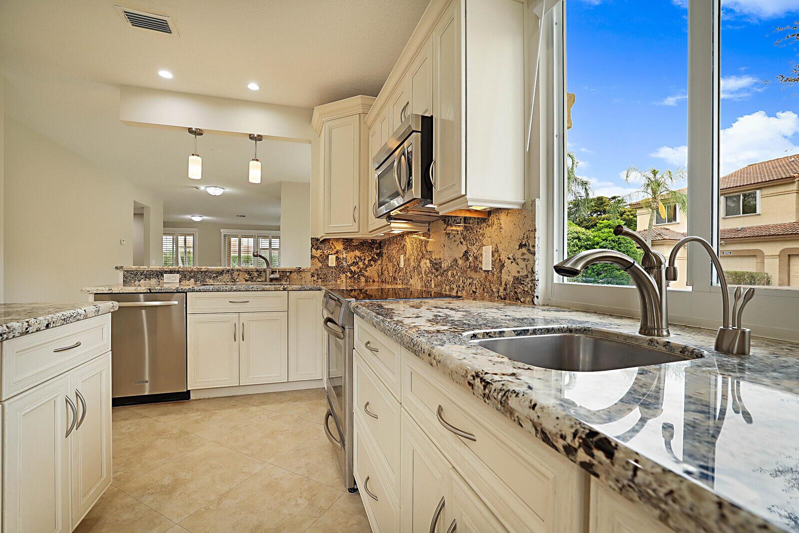 Largest end unit w/garage in Cortina. Boca Pointe is a beautiful, gated, Country Club Community where memberships ARE NOT REQUIRED. All memberships ARE AVAILABLE. Remodeled kitchen w/Country French cabinets, lazy susans, granite counters & backsplash, center island, stainless steel appliances, pantry, double stainless sink + a separate ''prep'' sink. Stone look tile downstairs. Formal Dining Room, spacious living room w/plantation shutters. Pretty powder room w/pedestal sink. New laminate on the stairs & 2nd story. Oversized, 2nd floor Master Suite has 10'x8' walk-in closet, new white shaker vanity w/quartz top & 2 sinks, a soaking tub + separate shower w/seamless enclosure. Freshly painted interior. Impact windows & sliders. There are no polybutylene pipes in the home. Community pool.