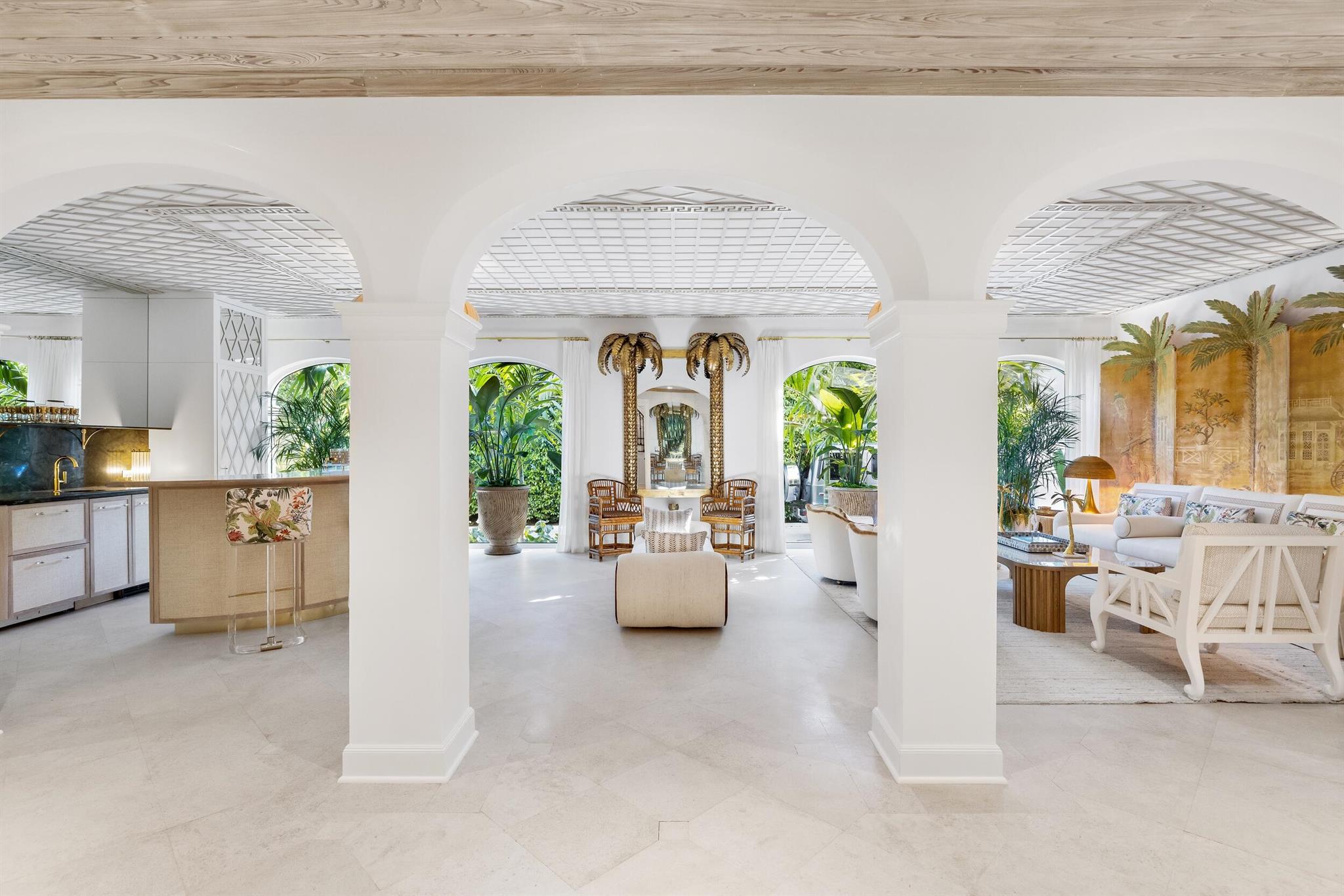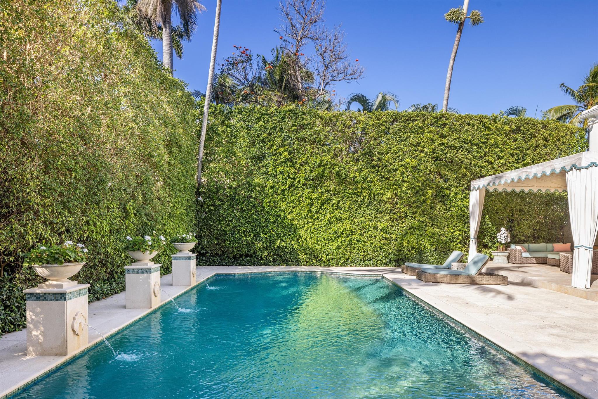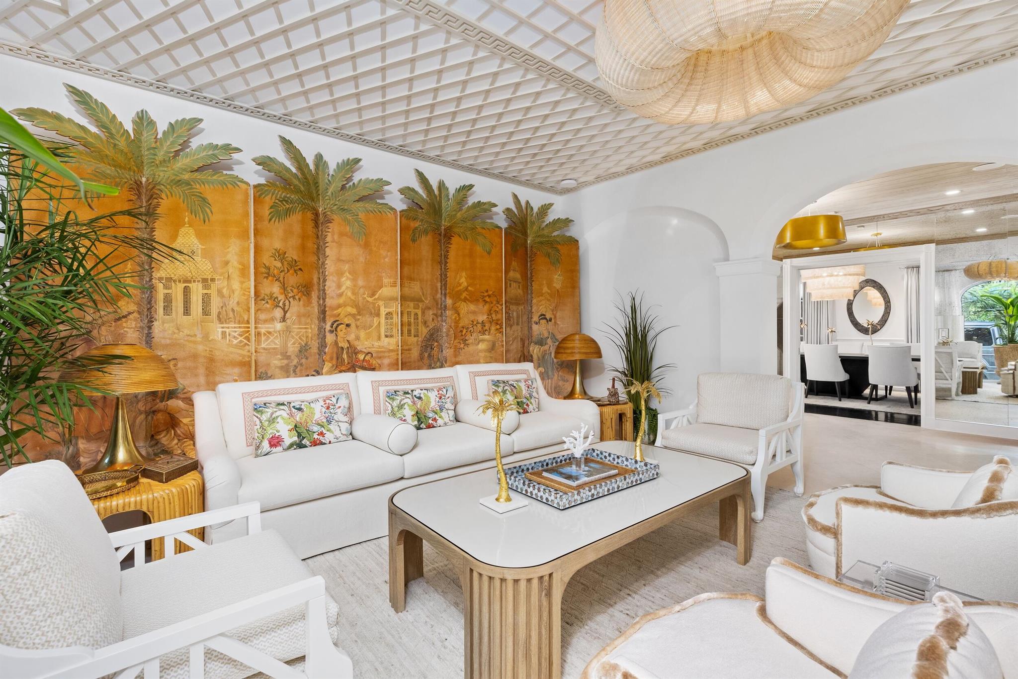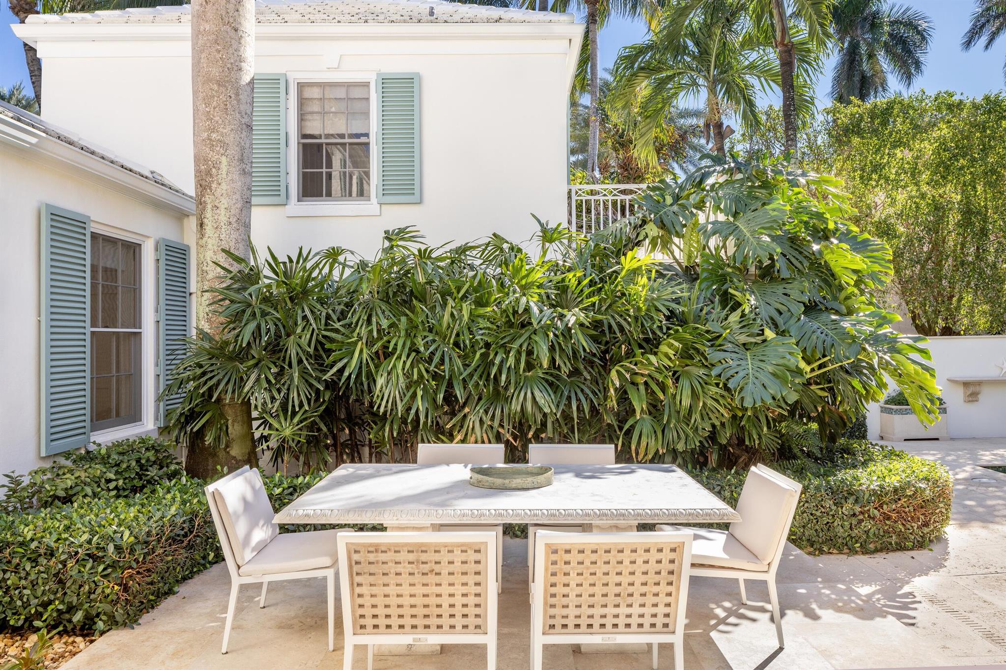 Gorgeously remodeled Monterey Colonial home designed by renowned Palm Beach architect John Volk. 6 bedrooms, 7 full baths, and powder room. Situated on a 14,500 +/- square foot lot, this home features over 7,000 total square feet, formal living room, and beautiful dining room. Formal entryway and large gallery hall. Oversized interior loggia leading to gourmet eat-in chef's kitchen and breakfast room. Iconic John Volk staircase leads to second floor den with Juliet Balcony. Expansive primary suite features gorgeous bath with stunning marble floors and details. Beautiful and serene landscaping surrounds large pool and covered patio. Gracious entry approach and parking with circular drive and driveway leading to 2 car air-conditioned garage. Guest apartment with terrace overlooking pool.