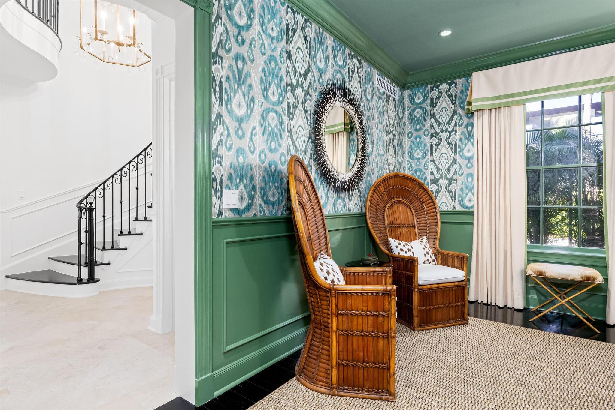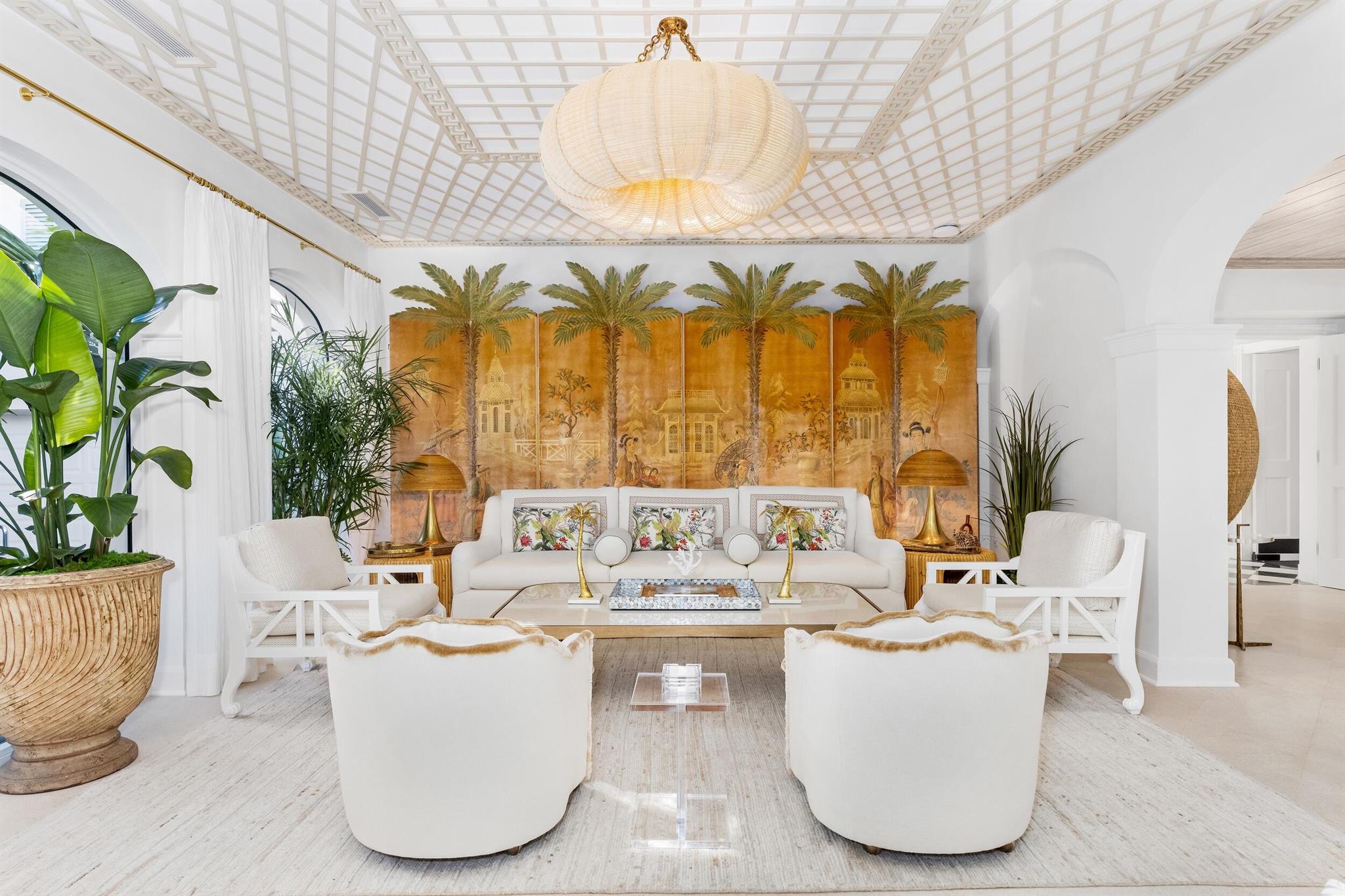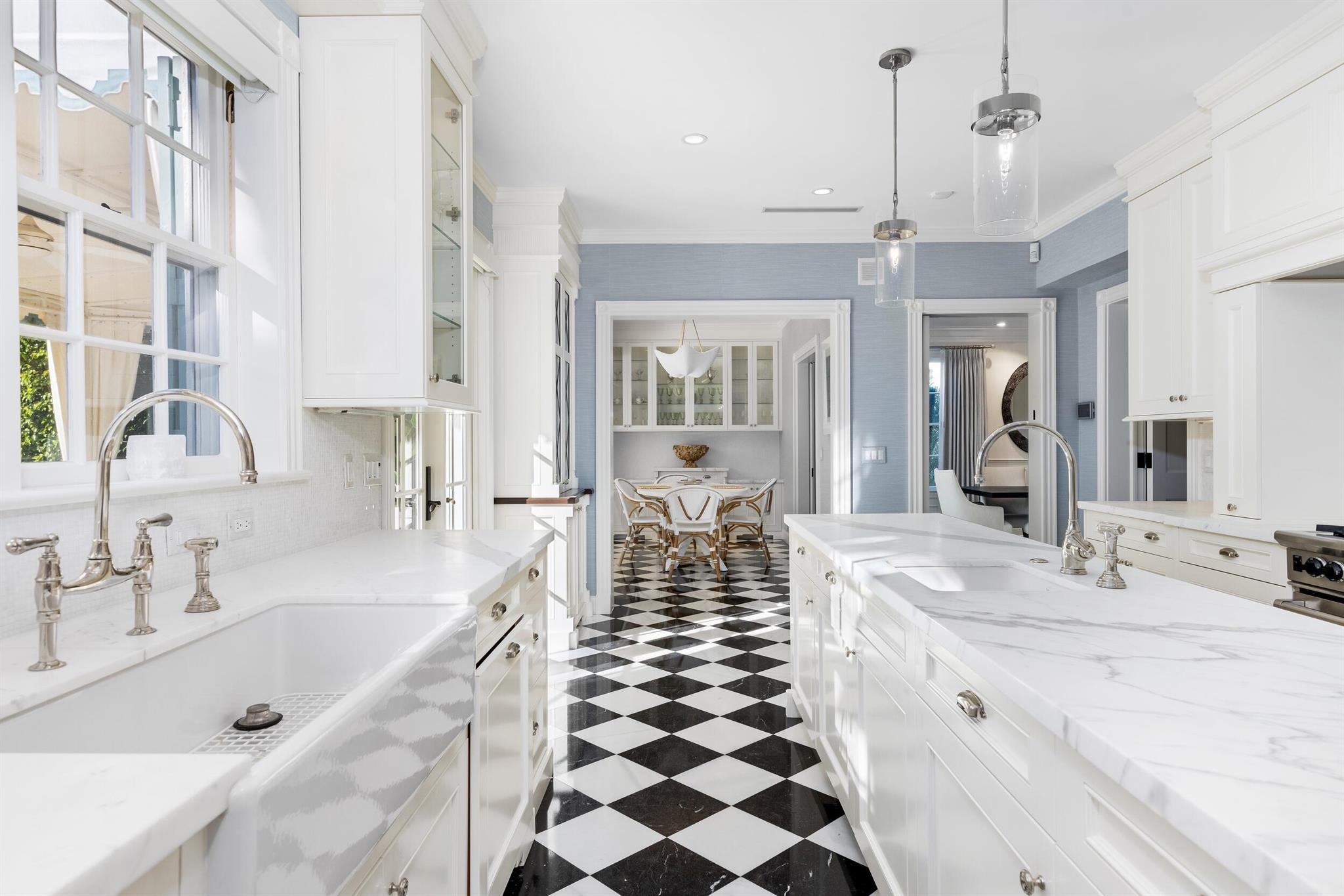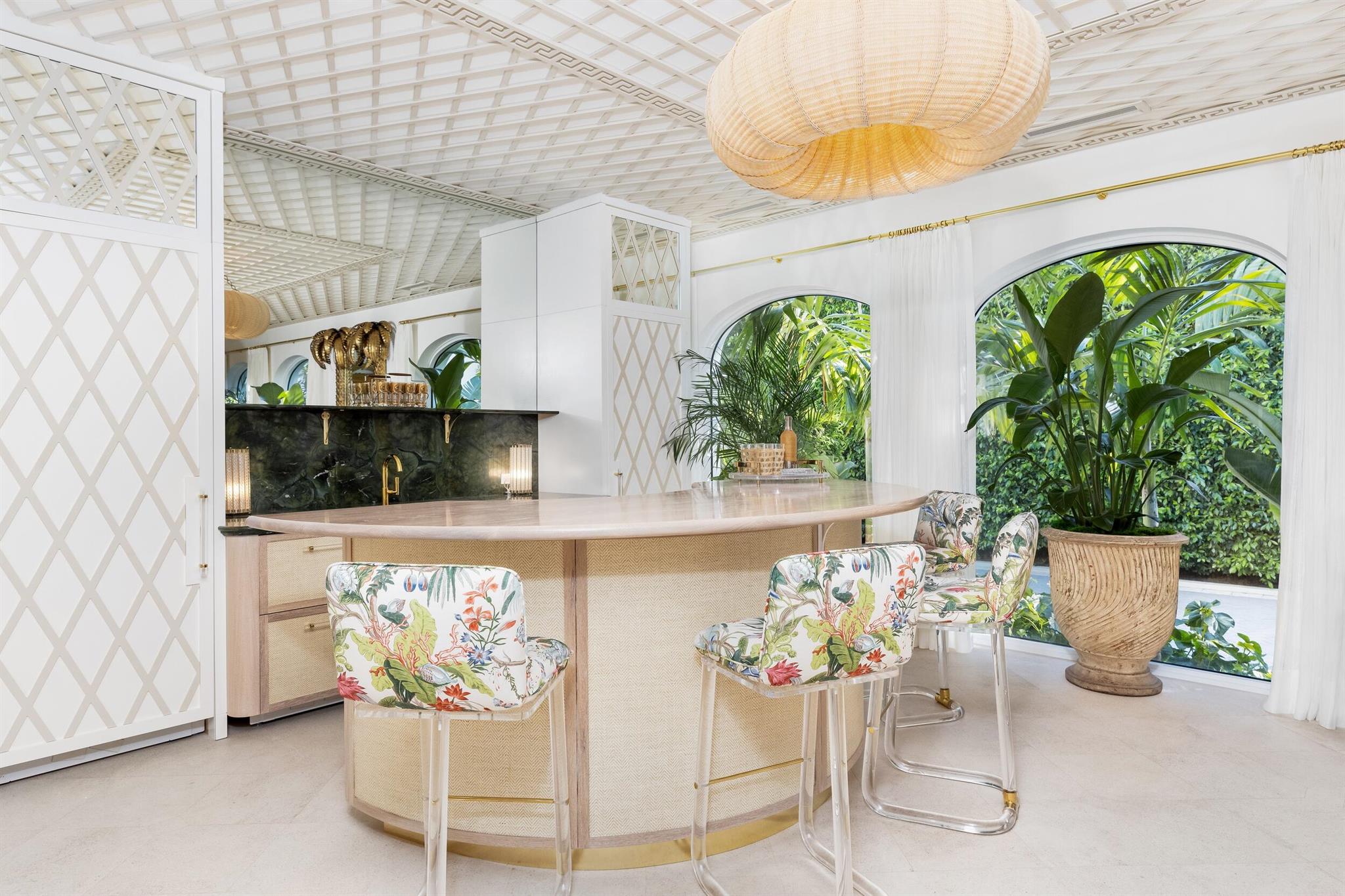 Gorgeously remodeled Monterey Colonial home designed by renowned Palm Beach architect John Volk. 6 bedrooms, 7 full baths, and powder room. Situated on a 14,500 +/- square foot lot, this home features over 7,000 total square feet, formal living room, and beautiful dining room. Formal entryway and large gallery hall. Oversized interior loggia leading to gourmet eat-in chef's kitchen and breakfast room. Iconic John Volk staircase leads to second floor den with Juliet Balcony. Expansive primary suite features gorgeous bath with stunning marble floors and details. Beautiful and serene landscaping surrounds large pool and covered patio. Gracious entry approach and parking with circular drive and driveway leading to 2 car air-conditioned garage. Guest apartment with terrace overlooking pool.