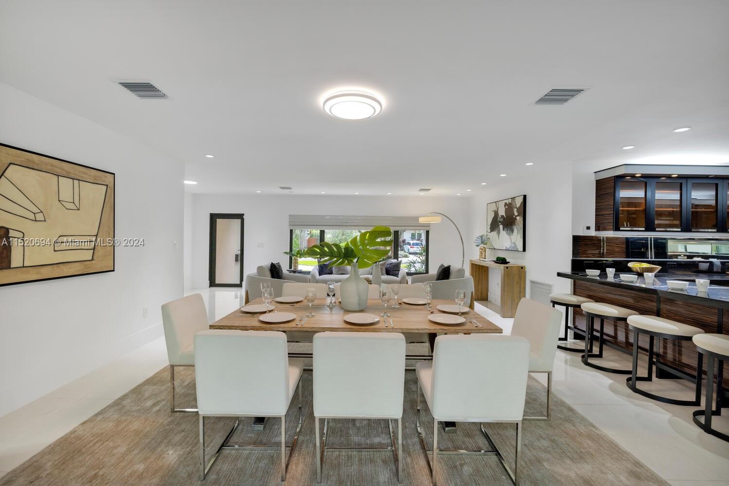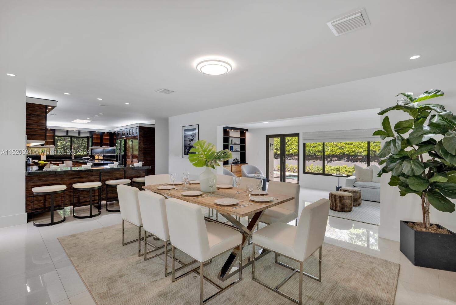 Welcome to Vila Brio! Come experience carefree luxe living in this beautifully updated sprawling mid-century modern designer pool home. Spectacular open-flow living, formal dining, grand media room and incredible double-sized custom eat-in dual-island gourmet kitchen with storage galore. Three spacious bedrooms in the main house, plus a fourth private entrance bedroom/legal in-law quarters with its own bath. Escape outside to the cleverly curated resort garden paradise with a sparkling pool, mature privacy landscaping, entertainment patios and space for relaxation. Totally turn-key: impact windows-doors; updated kitchen, baths, plumbing, electric, and porcelain tile floors; plus new A/C and pool equipment. All in Miami Shores' most prestigious neighborhood, on a quiet cul-de-sac