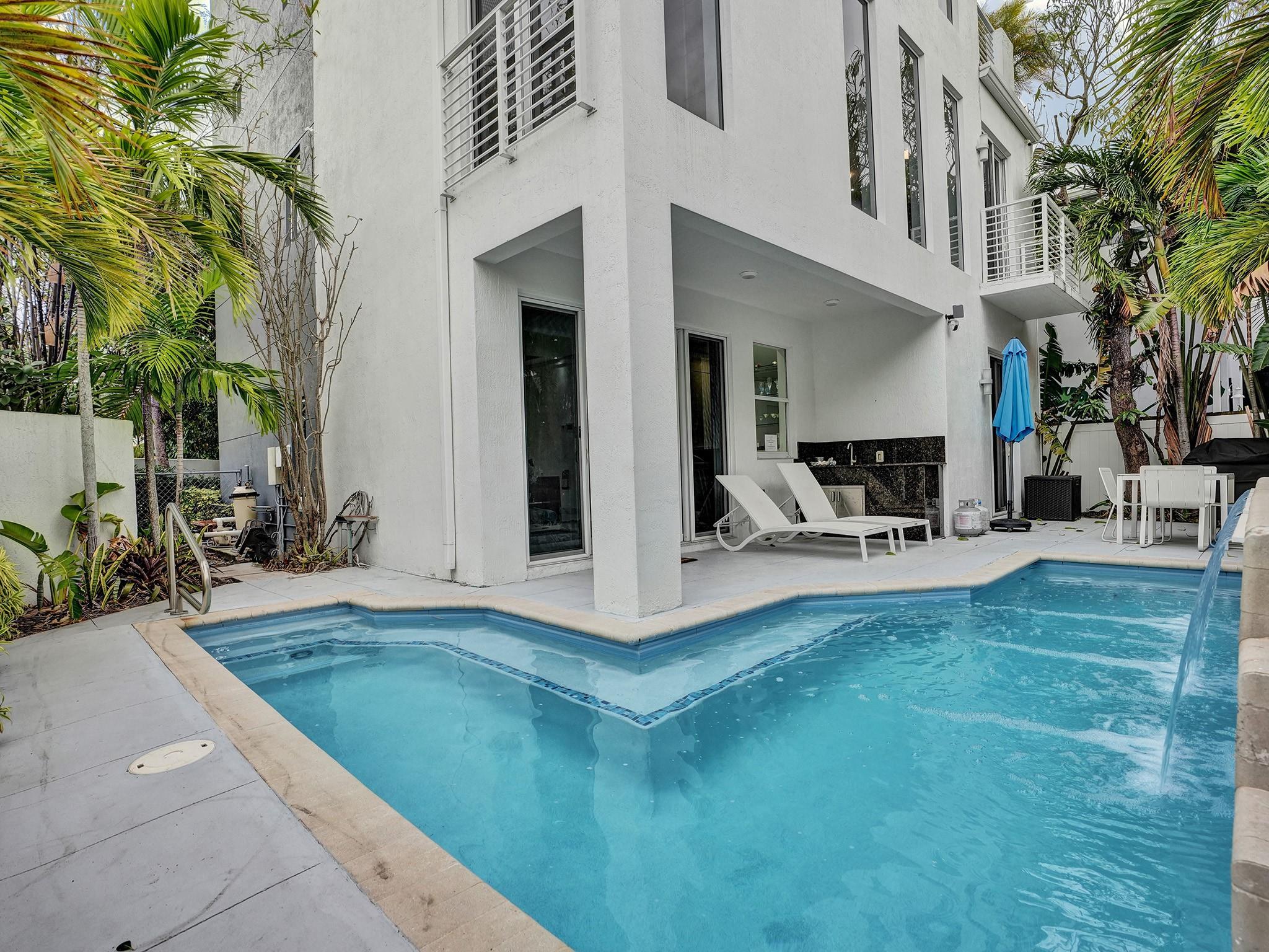 Fort Lauderdale Architectural Masterpiece—a four-story single-family home with captivating skyline views from the hot tub equipped roof deck. This architectural gem redefines luxury living with modern design, a GLASS elevator to all floors for convenience, and seamless indoor-outdoor spaces. Three bedrooms, and three sanctuary spa-like baths. The outdoors features a refreshing pool with three fountains in a tropical oasis. A huge beautiful open concept kitchen with a massive island is an entertainer's dream. Offered fully furnished. An unparalleled lifestyle in the heart of Fort Lauderdale close to the Broward Center and numerous great restaurants. Ideal location for easy access to the airport and local services. This four-story single-family home is a testament to great design throughout.