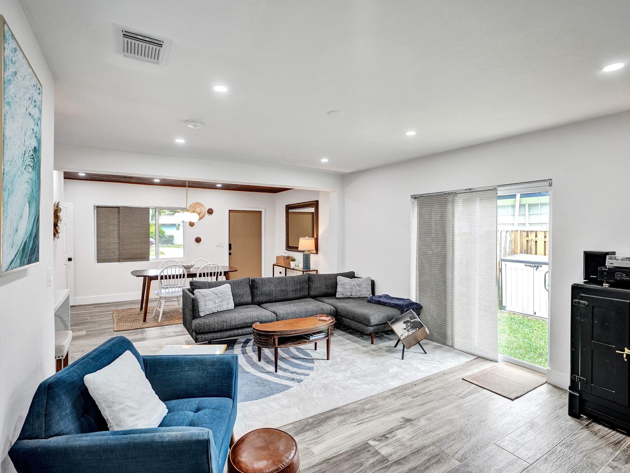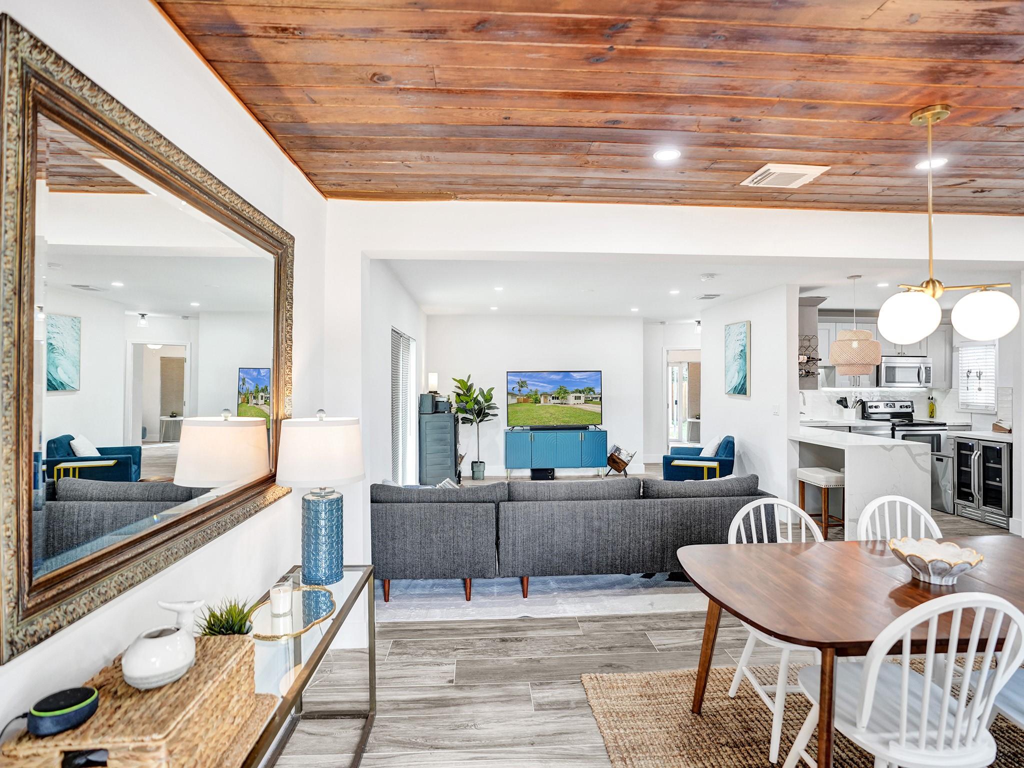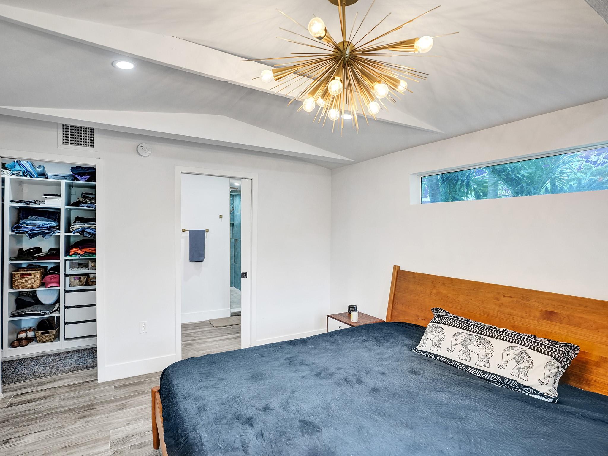 This stylish renovated expanded River Oaks home feels brand new. Addition includes an elegant and spacious carefully curated master suite featuring vaulted ceilings, modern chandelier, double vanity, massive shower and custom built walk in closet. Other updates make this home perfect for entertaining- such as expanded kitchen with peninsula open to living room and bar with beverage fridge. Details in cabinetry, backsplash and hardware set this home apart with a feeling of cozy contemporary charm. Screened front porch was enclosed to increase size and create separate dining area. Guest bedrooms share a large bath with soaking tub & separate shower. Guest bedrooms and living room provide easy access to yard through new hurricane sliders. Newly built workshop could be man cave/pool house.