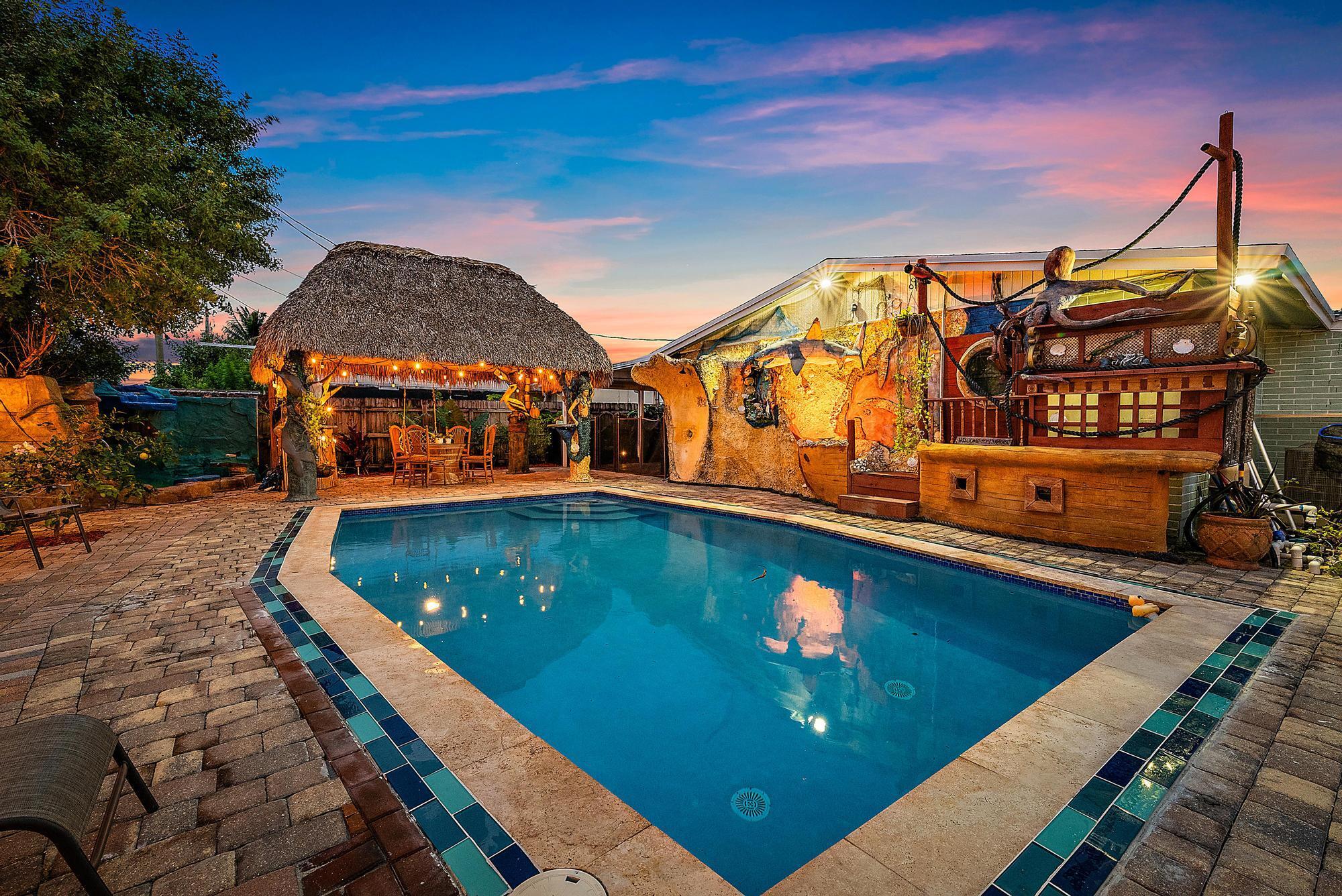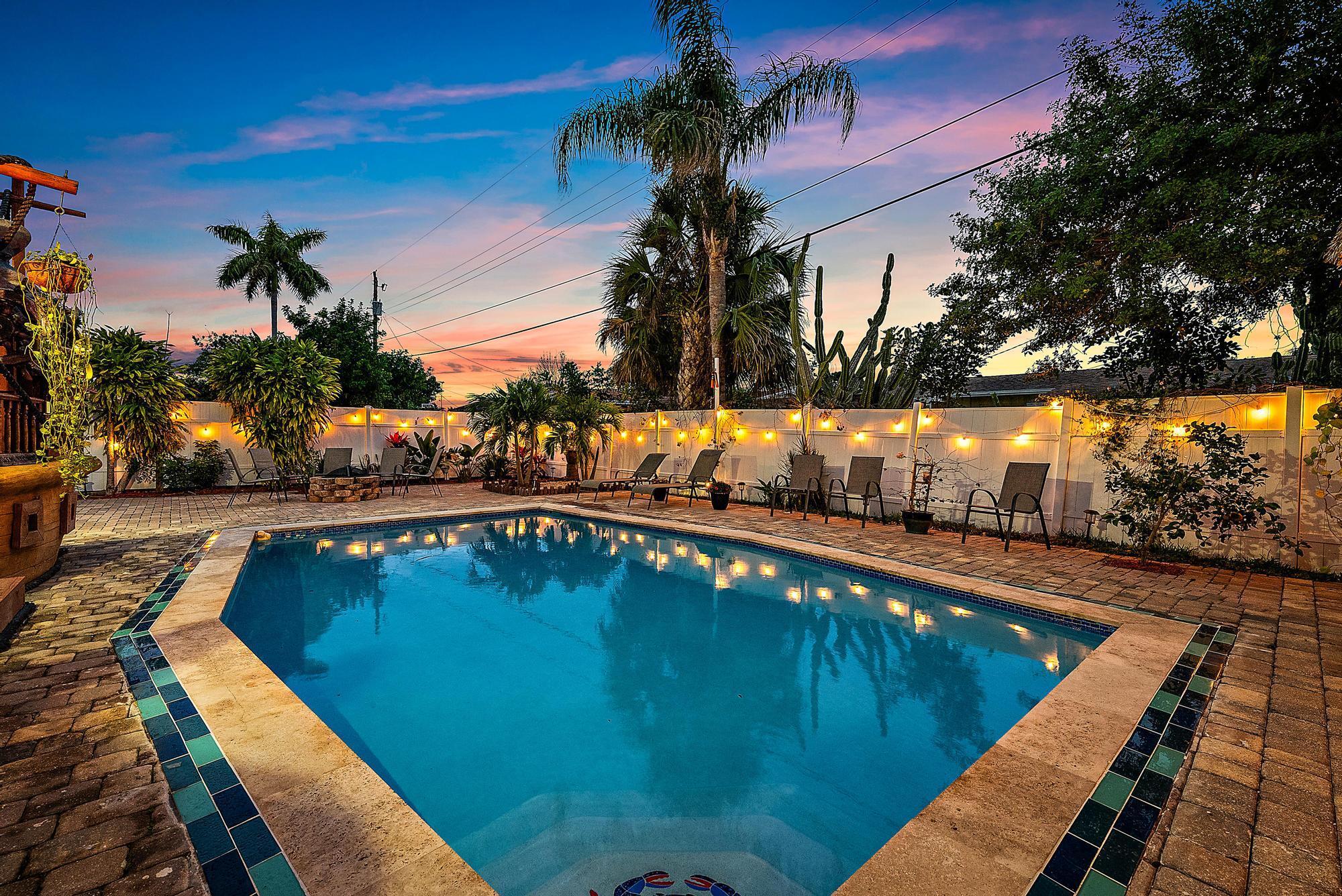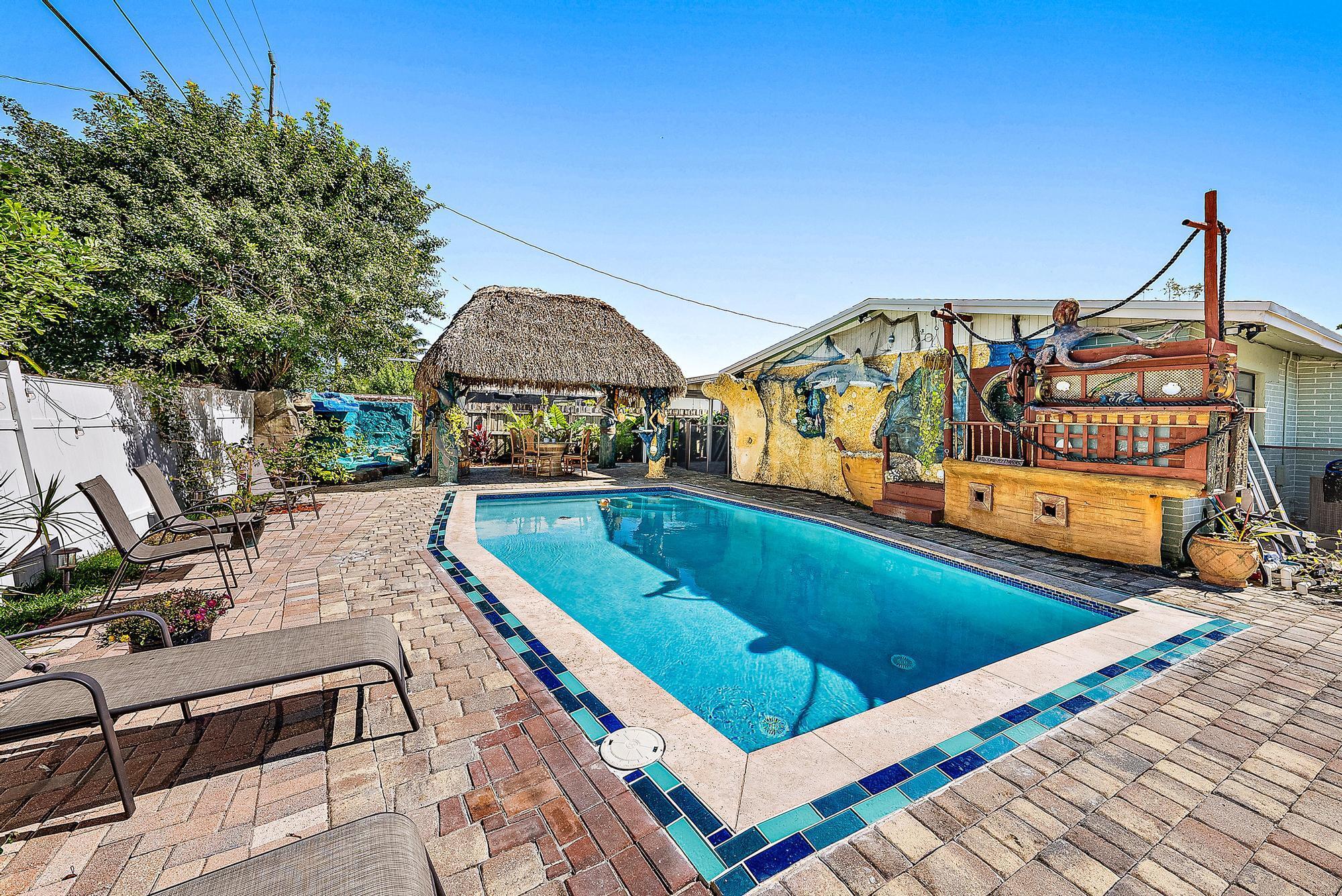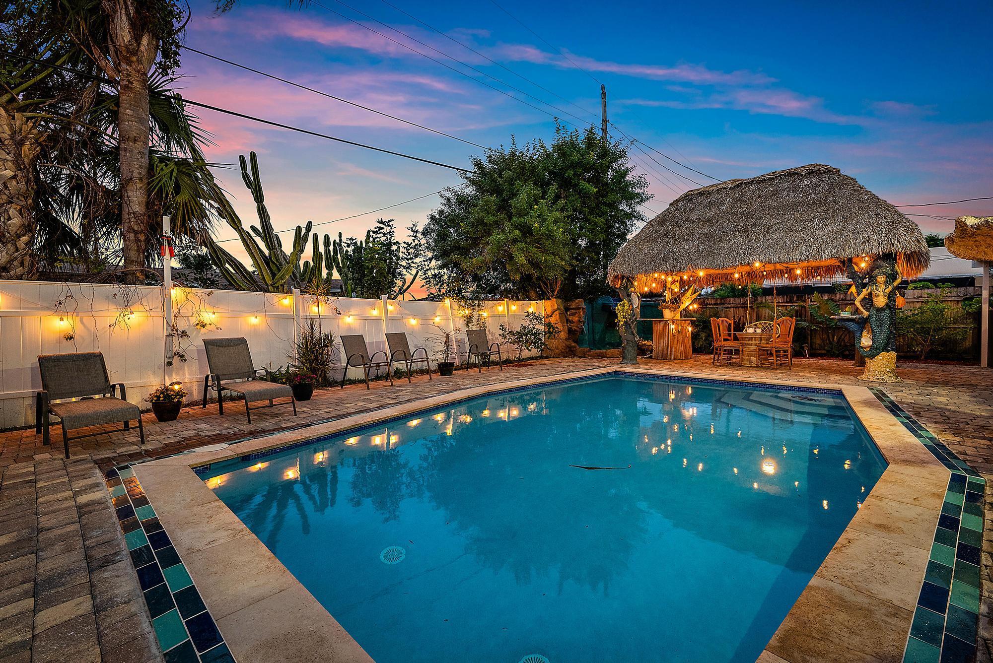 Welcome to your own tropical oasis! Updated 3-bedroom, 2-bath, pool home, or for those who require a dedicated workspace or relaxation area, one of the bedrooms can easily be converted into a home office or den. The updated kitchen features granite countertops, stainless-steel appliances, and ample storage. Newer tile throughout the main living areas, while the family room features a decorative fireplace. Step into the backyard, an entertainer's paradise, with a large, covered patio, fenced-in yard, and an oversized paved deck, minimizing yard maintenance. Enjoy a dip in the beautiful pool or lounge under the tiki hut, relaxing is a breeze in this backyard paradise.