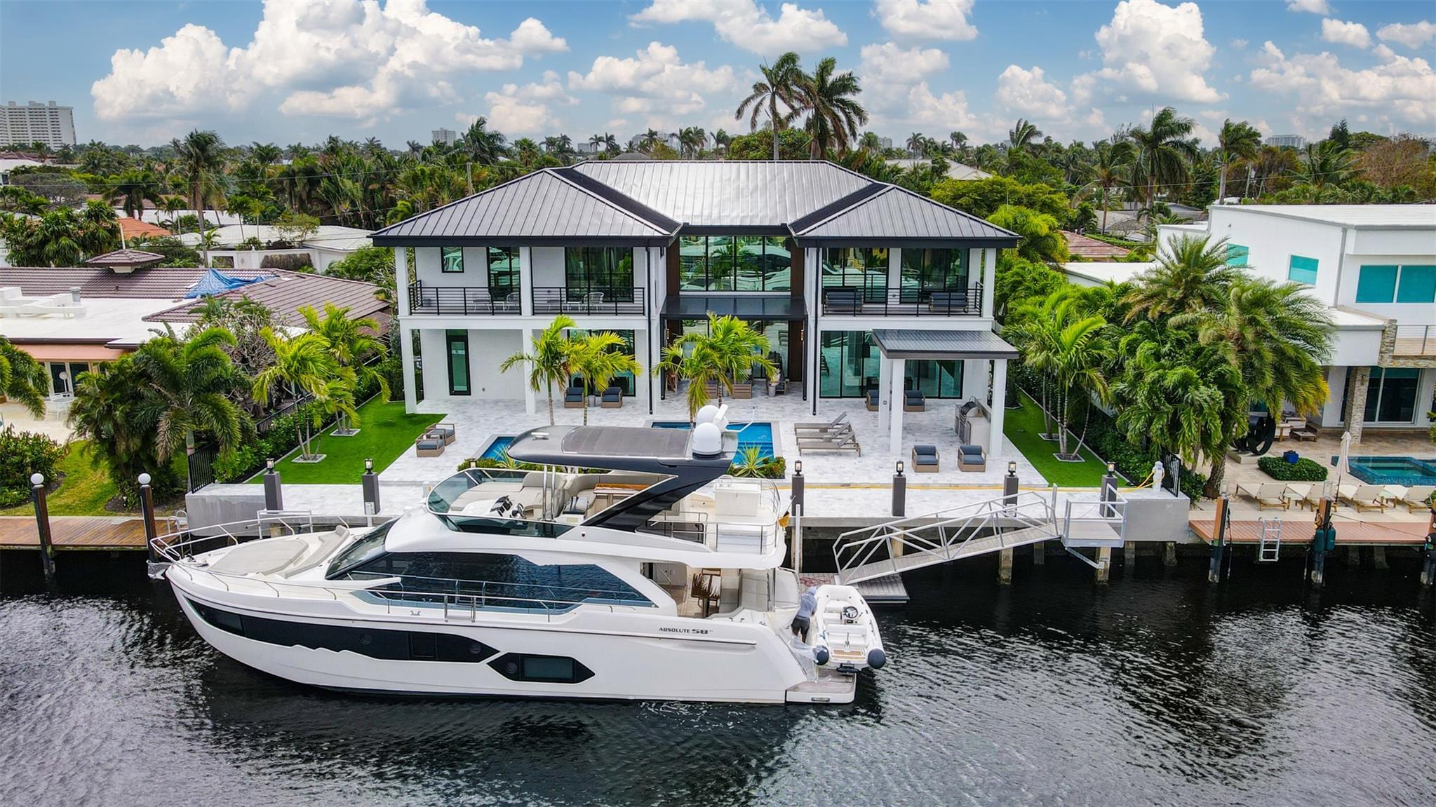An extraordinary contemporary (NOW OFFERED TURNKEY) 100ft deepwater residence exceeds expectations! Extensive custom upgrades must be seen to be appreciated & ultimate yachtsman's amenities set this home apart! Almost 8,400sf total! 1st level: expansive, open concept entertaining & living areas flow outdoors, Chef's kitchen, formal dining area, one of two primary suites-all water/pool facing, guest bath, elevator, boat storage room, laundry room, pool access cabana. 2nd level presents beautifully: 3 spacious secondary bedroom suites, all custom baths & closet systems, glass enclosed home office/gym. Ultra-luxurious primary suite offers separate spa baths & dressing rooms, private balcony. Multiple balconies, covered terraces, Summer kitchen gazebo & floating dock create a resort ambiance.