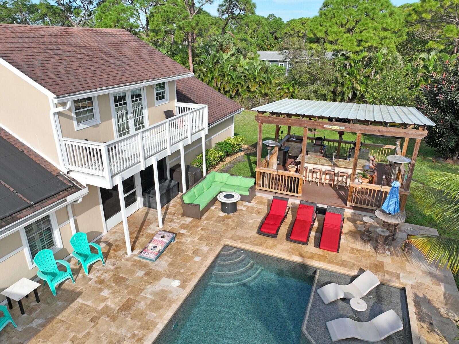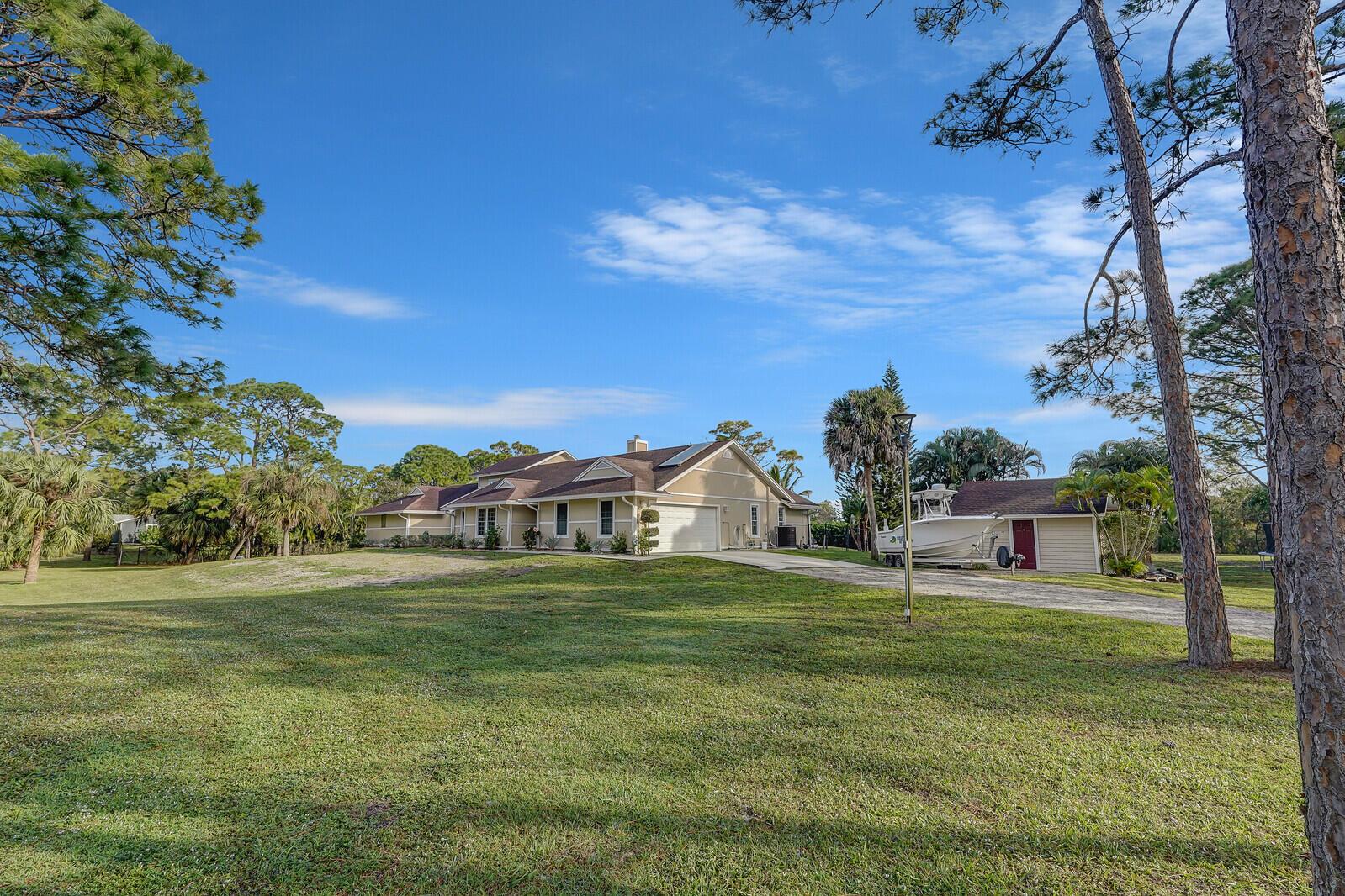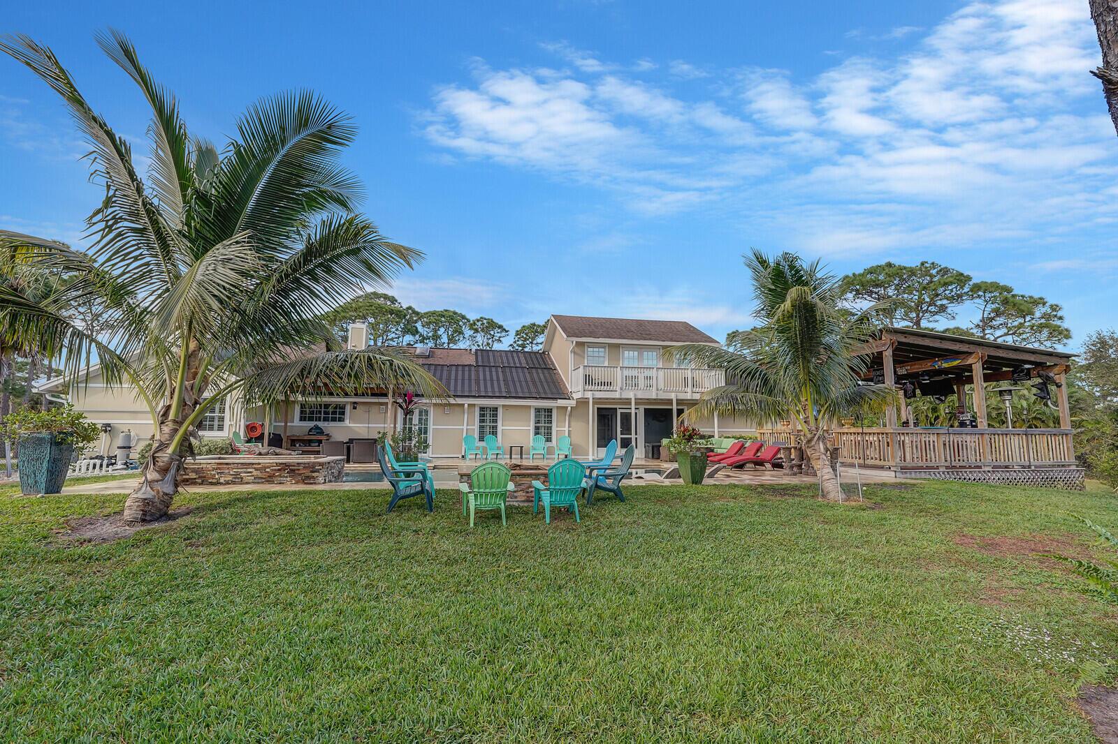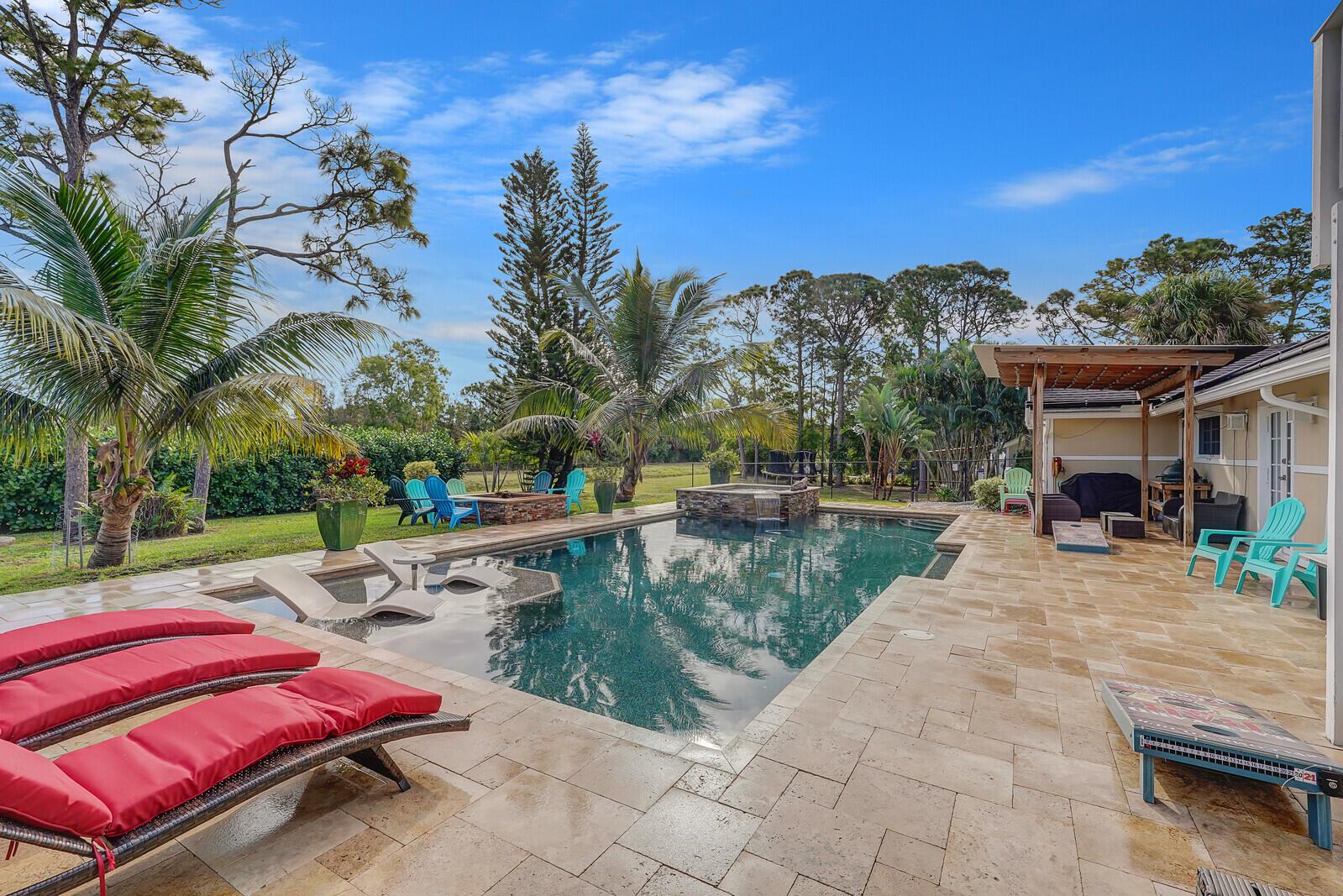 This stunning 4bd, 3ba residence, perfectly situated on a sprawling 1.4 acre lot in Palm Beach Country Estates. You'll be captivated by the grandeur of vaulted ceilings & a spacious nearly 3000 sqft. floor plan that exudes opulence at every corner. The upgraded kitchen has generous storage offering both gas & induction cooking options. Boasting 2 master suites both with luxurious en suites, dual sinks, separate showers, & custom cabinetry for a spa-like retreat, along with substantial walk-in closets. Outside is an entertainer's dream, featuring state of the art heated pool & spa, custom built fire pit & area for an outdoor kitchen creating the ideal setting for year-round entertainment. The property has a 500 gallon in-ground propane tank, a new 2023 AC unit & a 2022 pool heater!