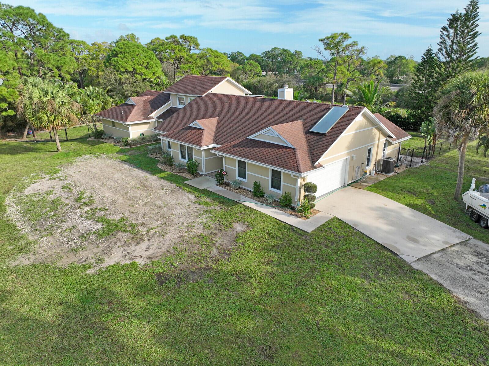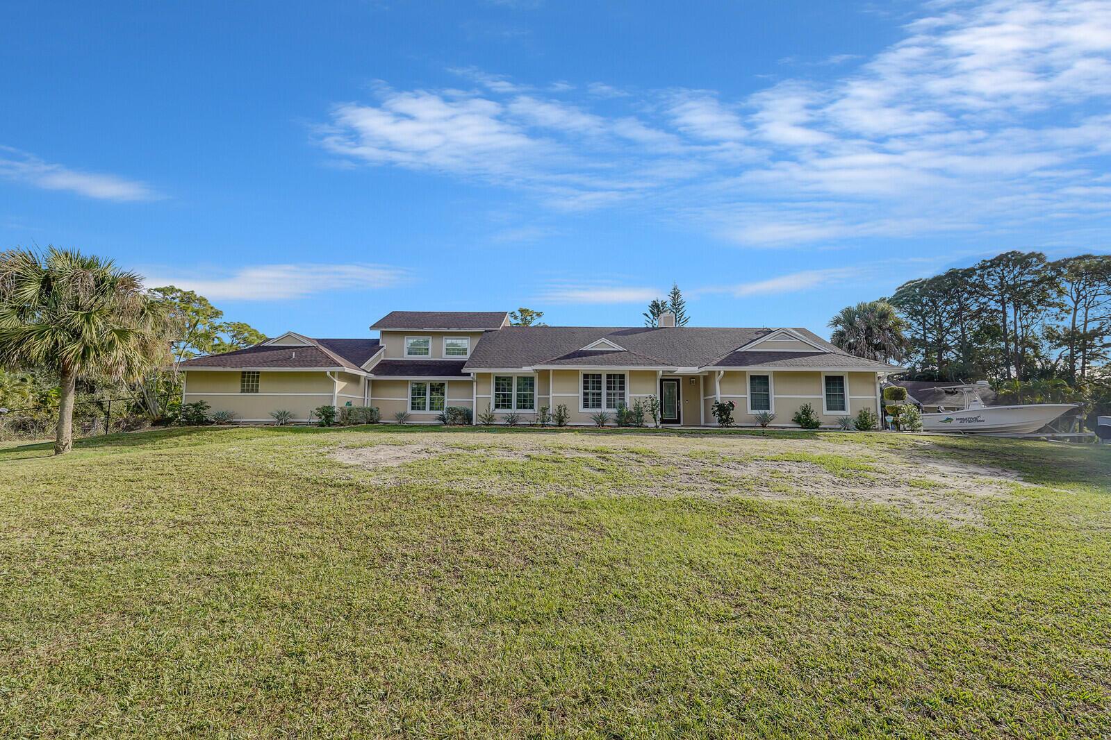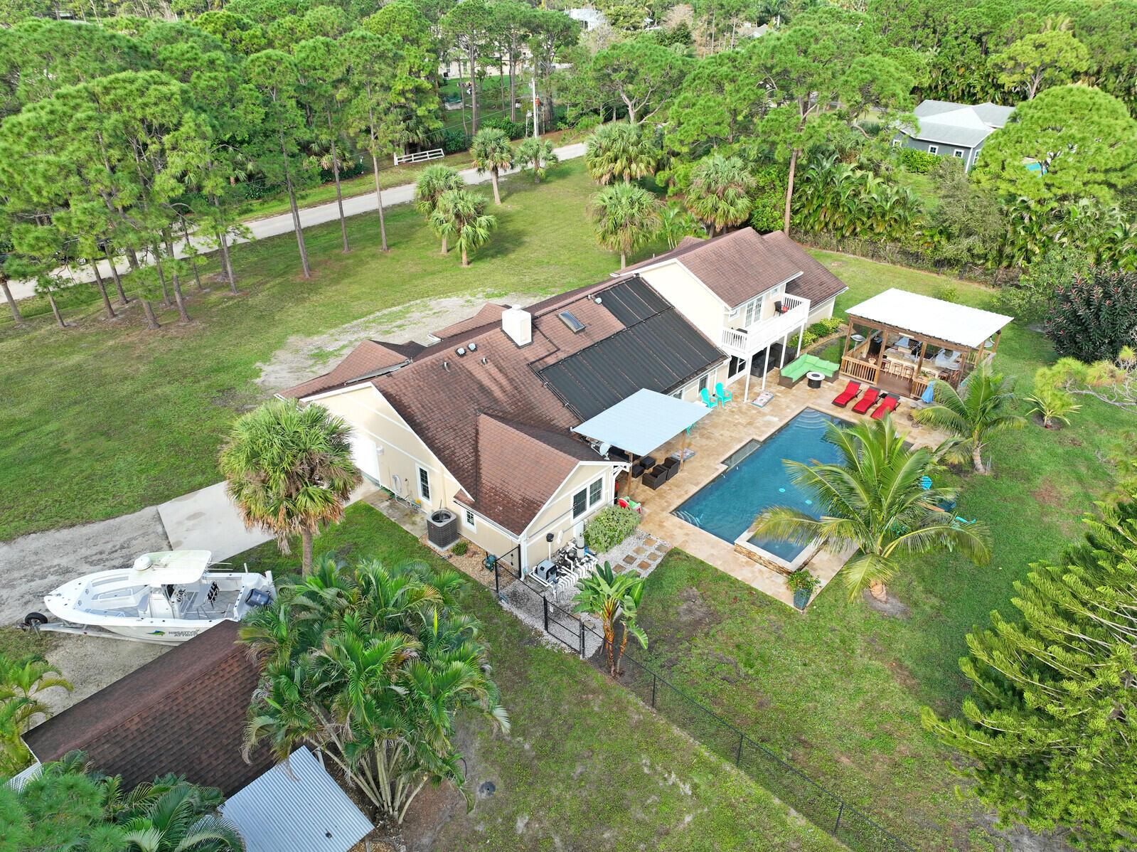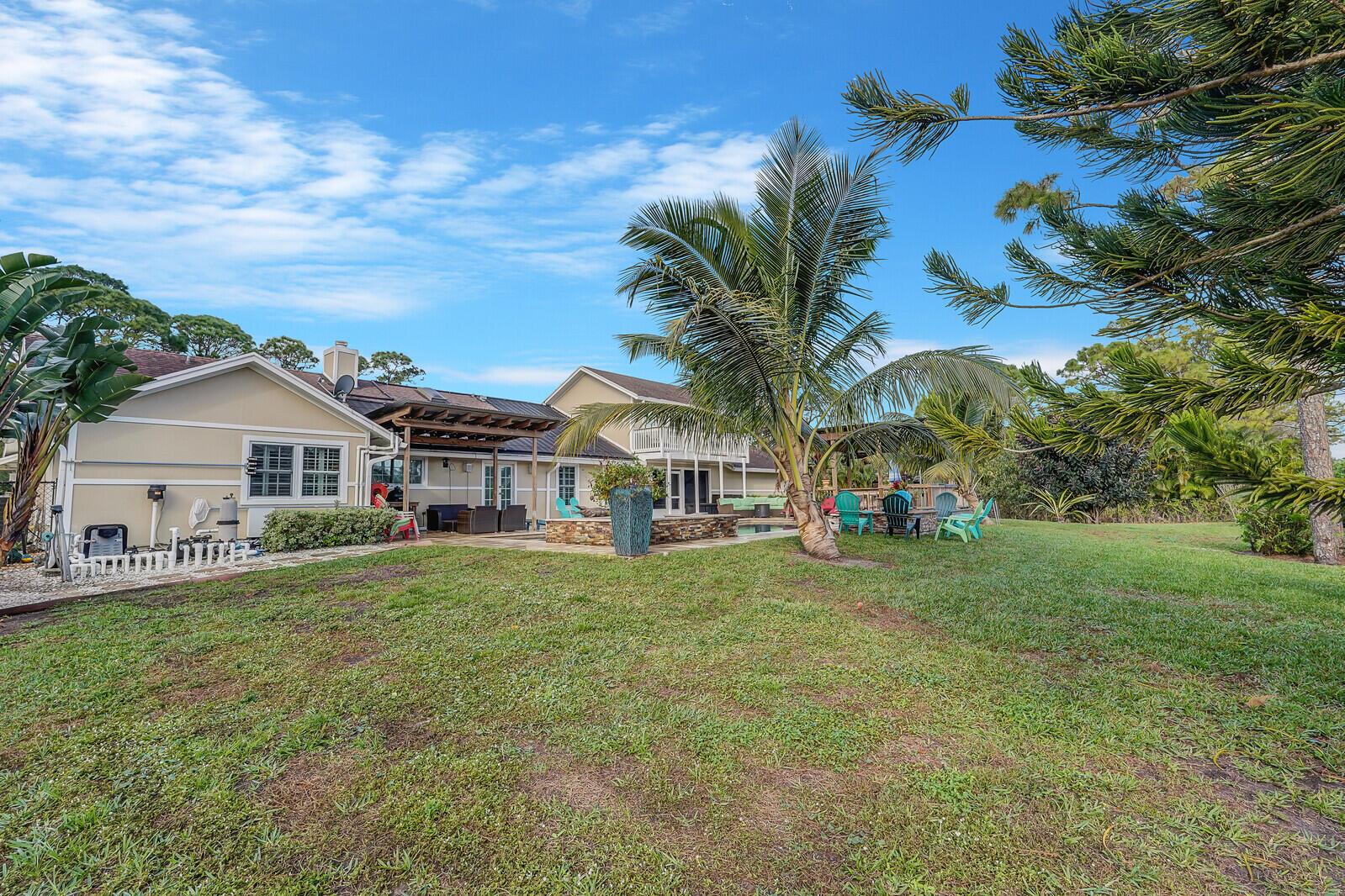 This stunning 4bd, 3ba residence, perfectly situated on a sprawling 1.4 acre lot in Palm Beach Country Estates. You'll be captivated by the grandeur of vaulted ceilings & a spacious nearly 3000 sqft. floor plan that exudes opulence at every corner. The upgraded kitchen has generous storage offering both gas & induction cooking options. Boasting 2 master suites both with luxurious en suites, dual sinks, separate showers, & custom cabinetry for a spa-like retreat, along with substantial walk-in closets. Outside is an entertainer's dream, featuring state of the art heated pool & spa, custom built fire pit & area for an outdoor kitchen creating the ideal setting for year-round entertainment. The property has a 500 gallon in-ground propane tank, a new 2023 AC unit & a 2022 pool heater!