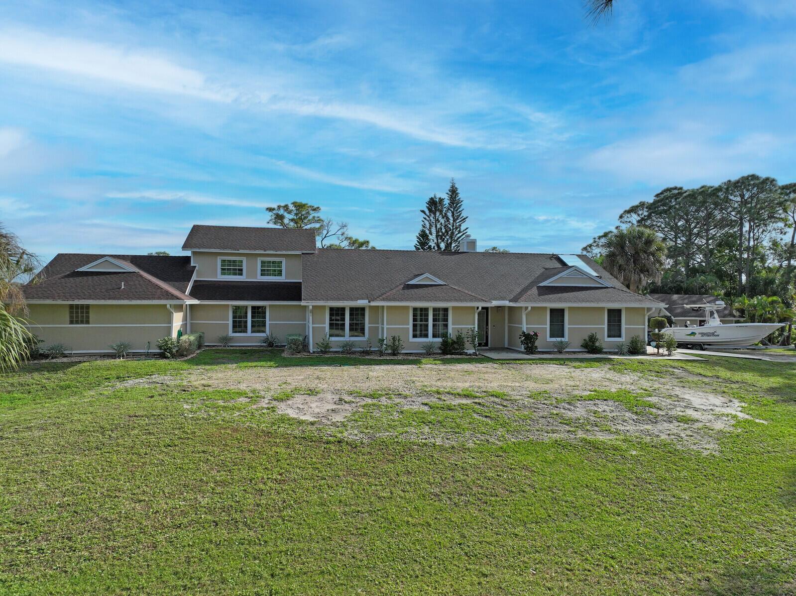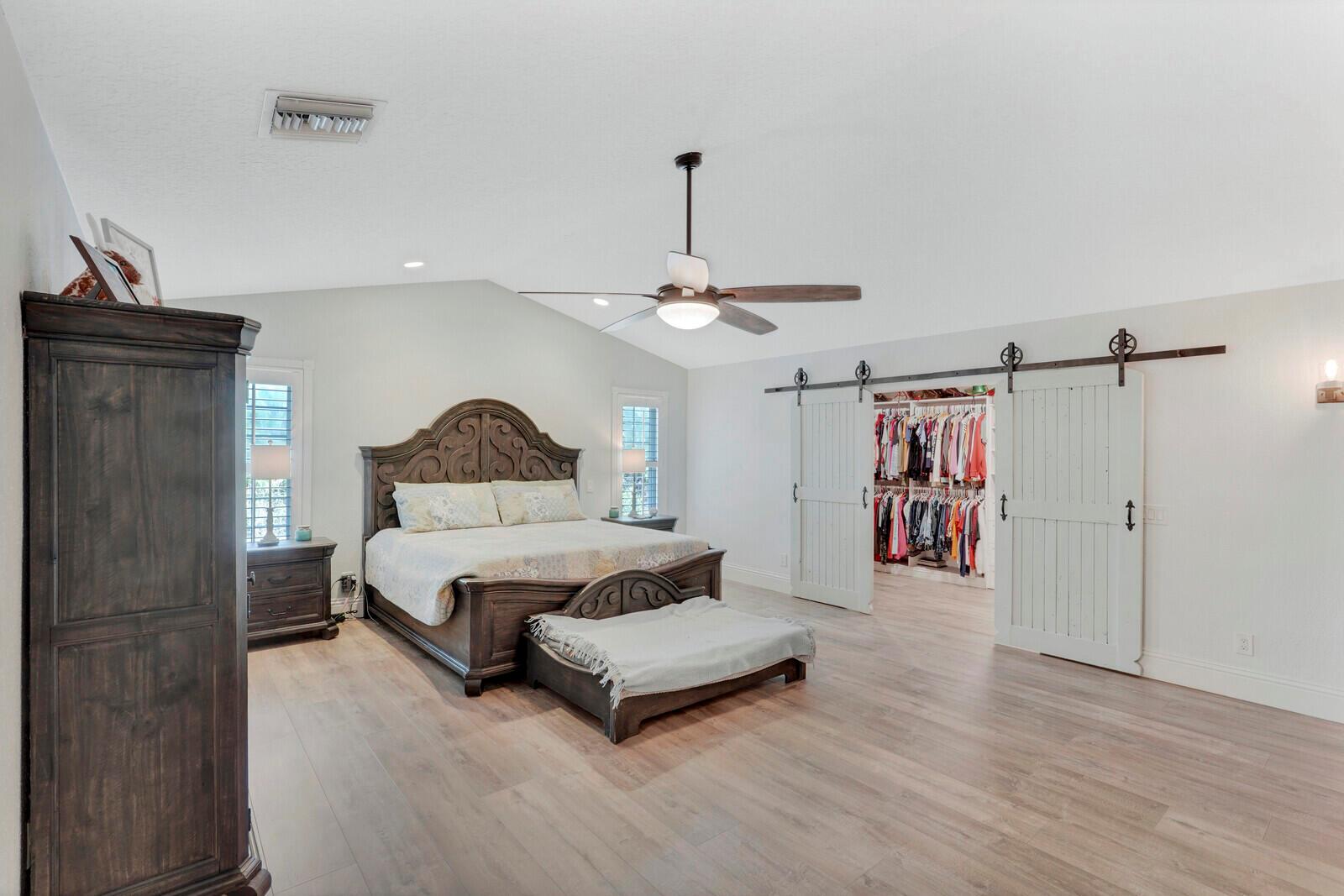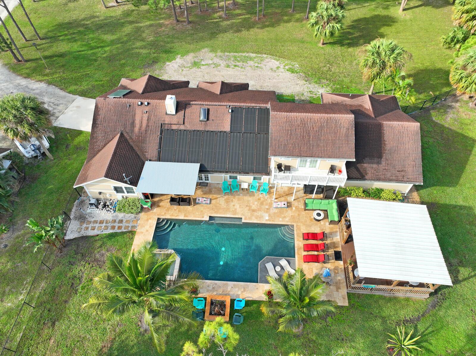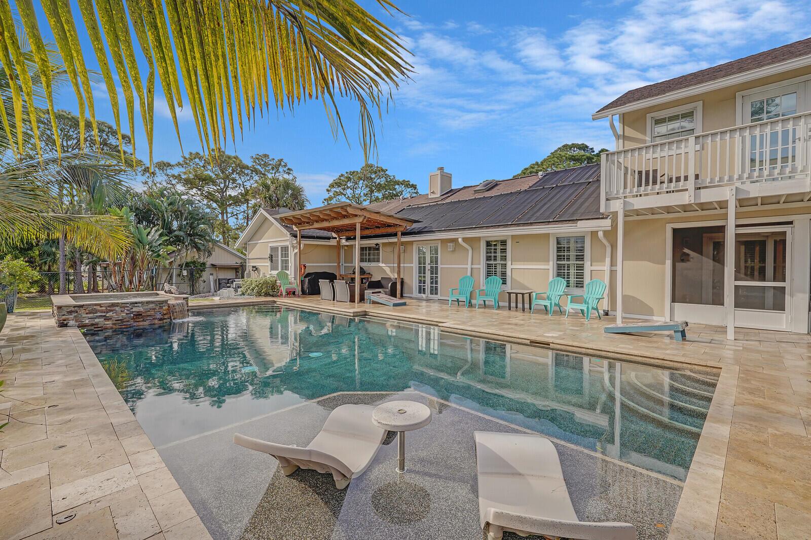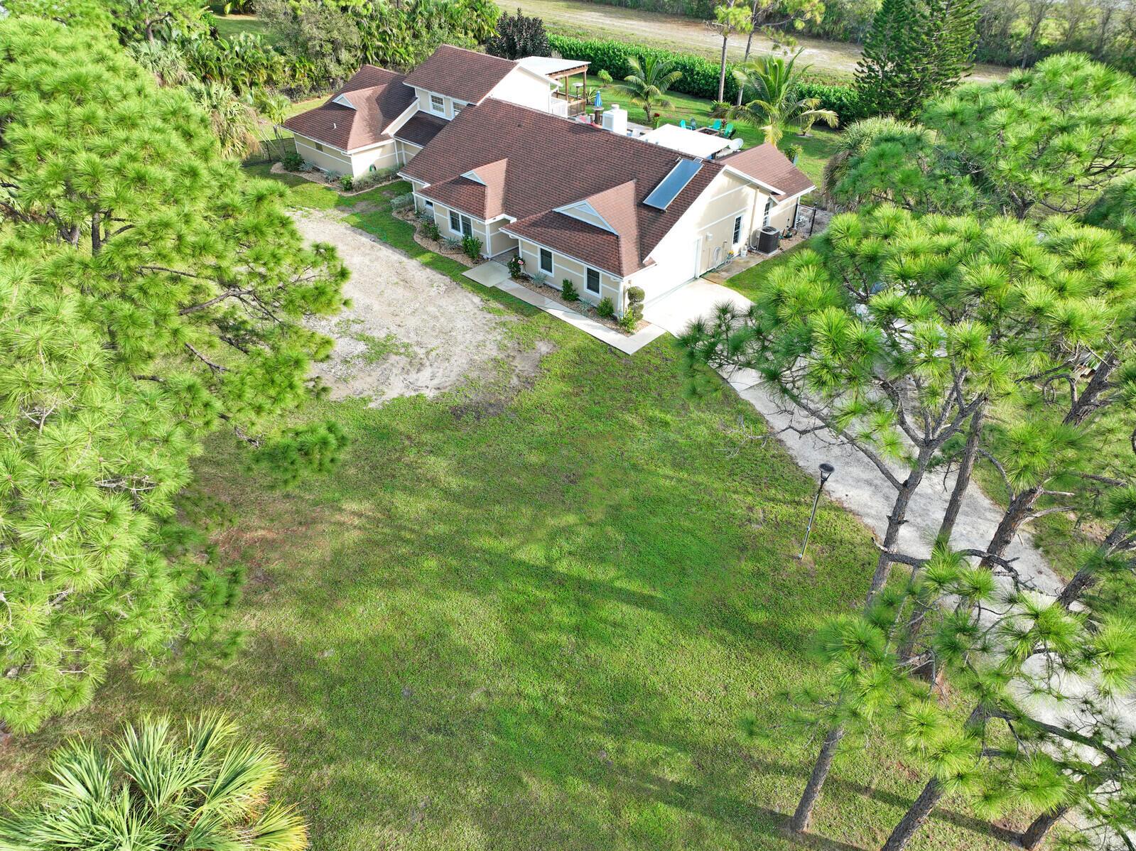 This stunning 4bd, 3ba residence, perfectly situated on a sprawling 1.4 acre lot in Palm Beach Country Estates. You'll be captivated by the grandeur of vaulted ceilings & a spacious nearly 3000 sqft. floor plan that exudes opulence at every corner. The upgraded kitchen has generous storage offering both gas & induction cooking options. Boasting 2 master suites both with luxurious en suites, dual sinks, separate showers, & custom cabinetry for a spa-like retreat, along with substantial walk-in closets. Outside is an entertainer's dream, featuring state of the art heated pool & spa, custom built fire pit & area for an outdoor kitchen creating the ideal setting for year-round entertainment. The property has a 500 gallon in-ground propane tank, a new 2023 AC unit & a 2022 pool heater!
