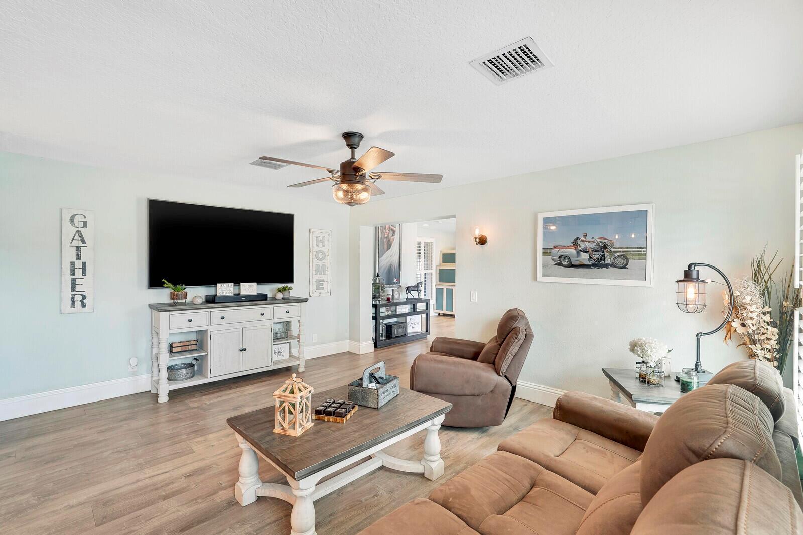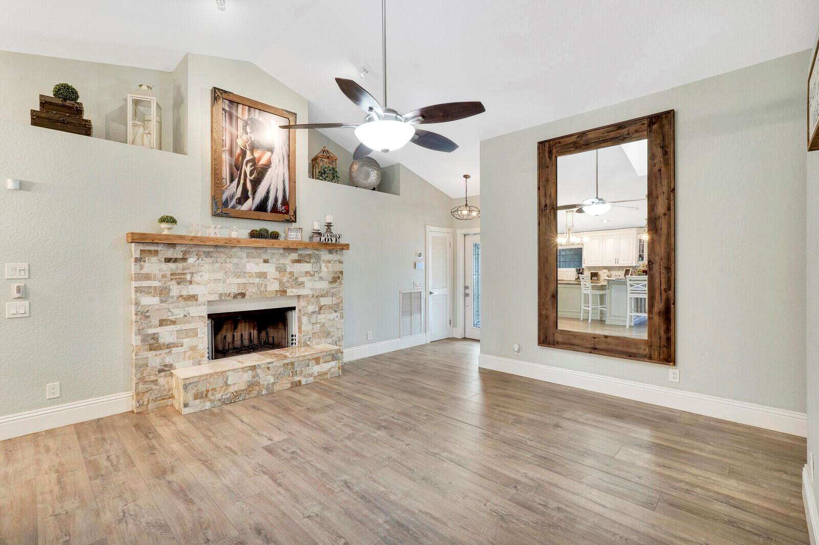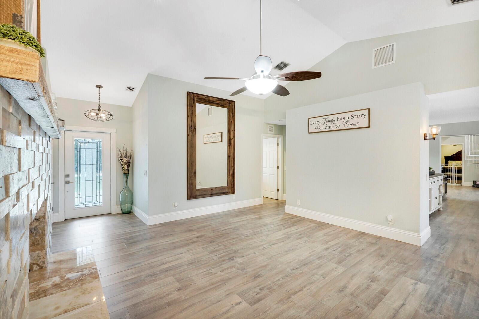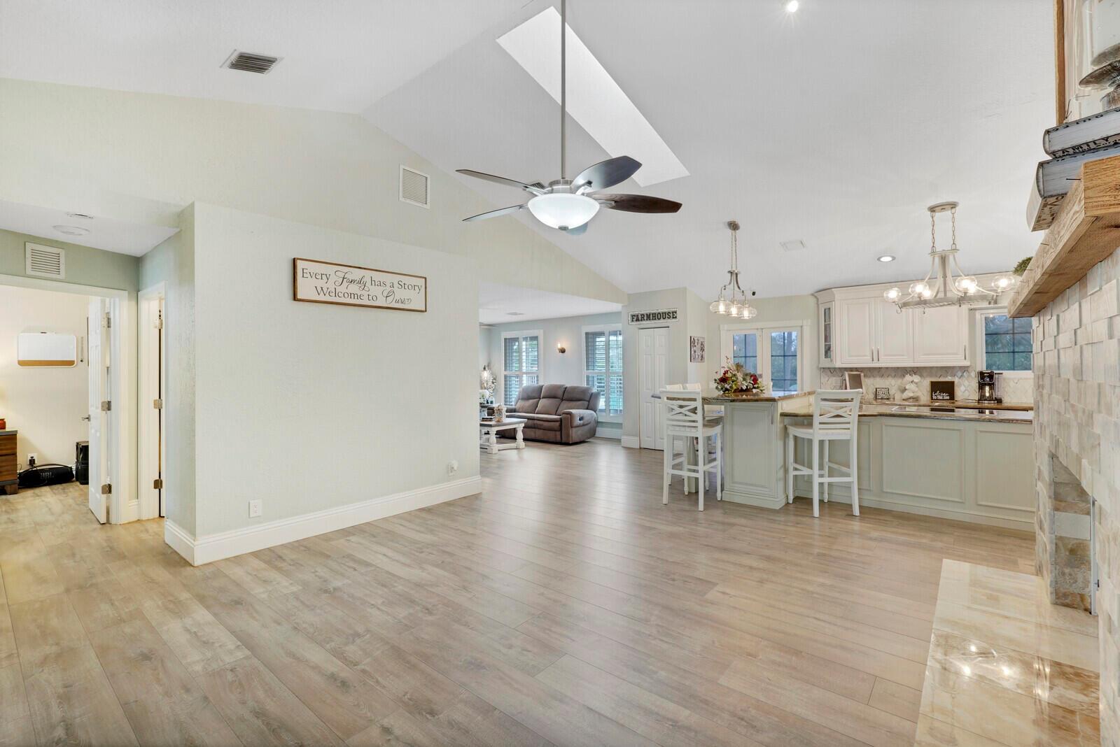 This stunning 4bd, 3ba residence, perfectly situated on a sprawling 1.4 acre lot in Palm Beach Country Estates. You'll be captivated by the grandeur of vaulted ceilings & a spacious nearly 3000 sqft. floor plan that exudes opulence at every corner. The upgraded kitchen has generous storage offering both gas & induction cooking options. Boasting 2 master suites both with luxurious en suites, dual sinks, separate showers, & custom cabinetry for a spa-like retreat, along with substantial walk-in closets. Outside is an entertainer's dream, featuring state of the art heated pool & spa, custom built fire pit & area for an outdoor kitchen creating the ideal setting for year-round entertainment. The property has a 500 gallon in-ground propane tank, a new 2023 AC unit & a 2022 pool heater!