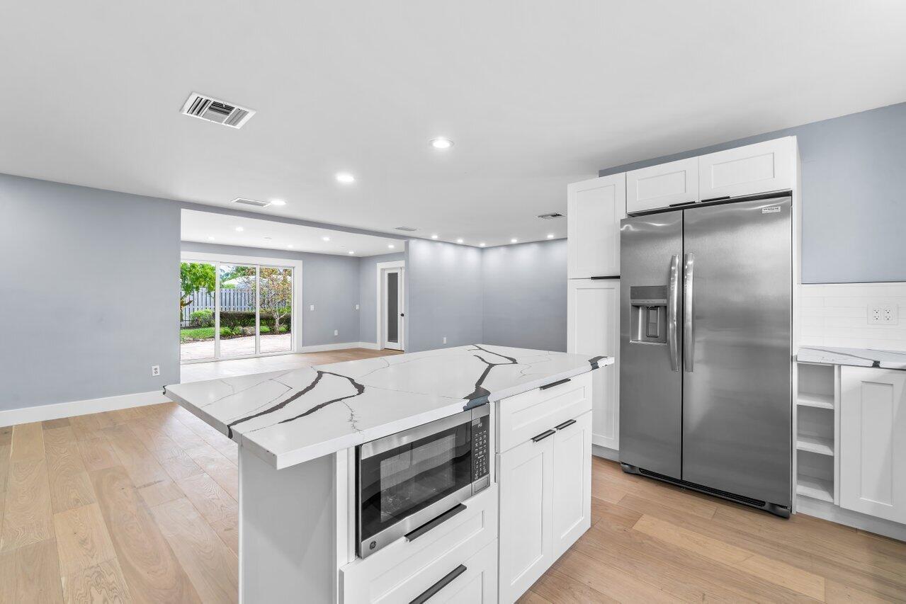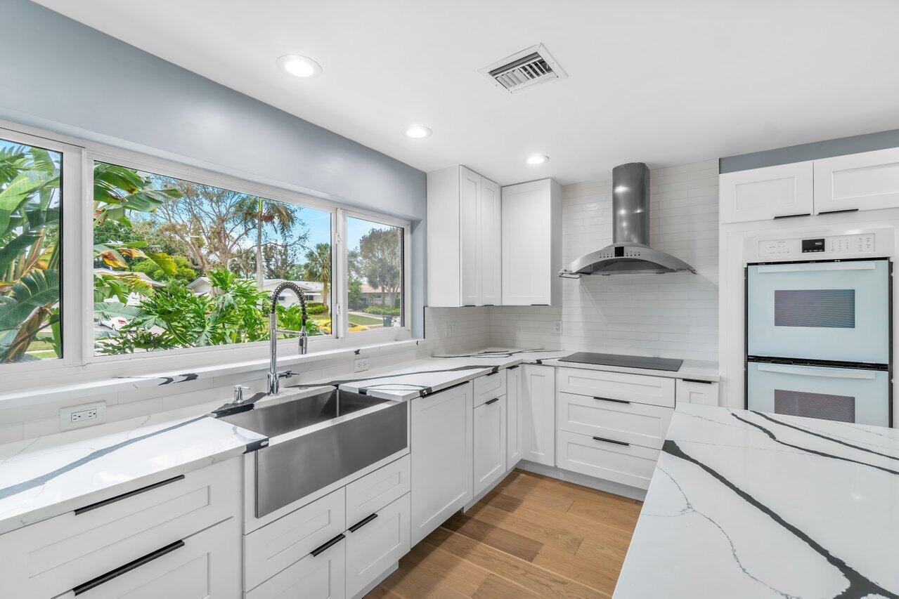 BOCA SQUARE GEM! One story ranch home with all NEW kitchen, shaker style wood cabinets, quartz countertops, stainless-steel appliances, double wall ovens, walk-in pantry and breakfast island. Features impact glass windows and sliding glass door, elegant wood floors in a light and bright open-concept design. Includes ALL NEW insulations, high hats, vents, interior doors, door hardware, washer, water heater and gutters. Internal laundry room for convenience. Spacious fenced in backyard, ideal for pool or lush garden. Near top rated public and private schools, beaches, shopping, entertainment. Prime location in East Boca Raton. Move in ready.