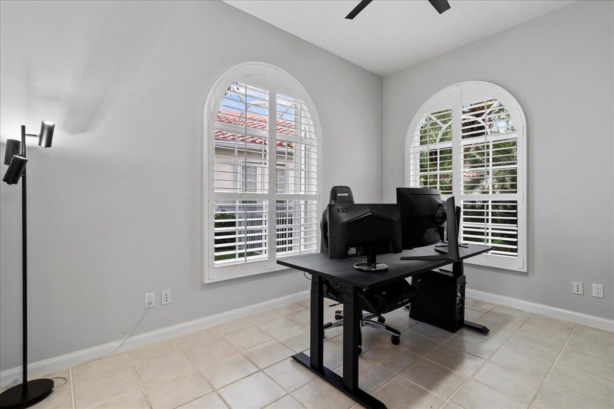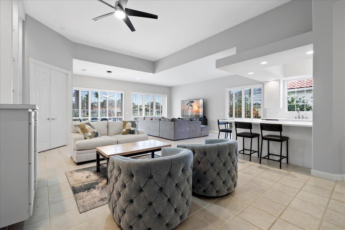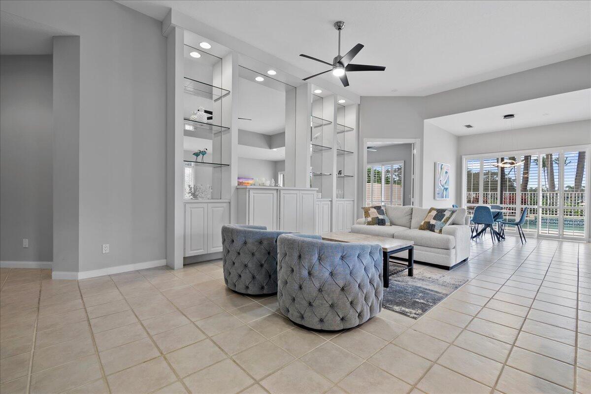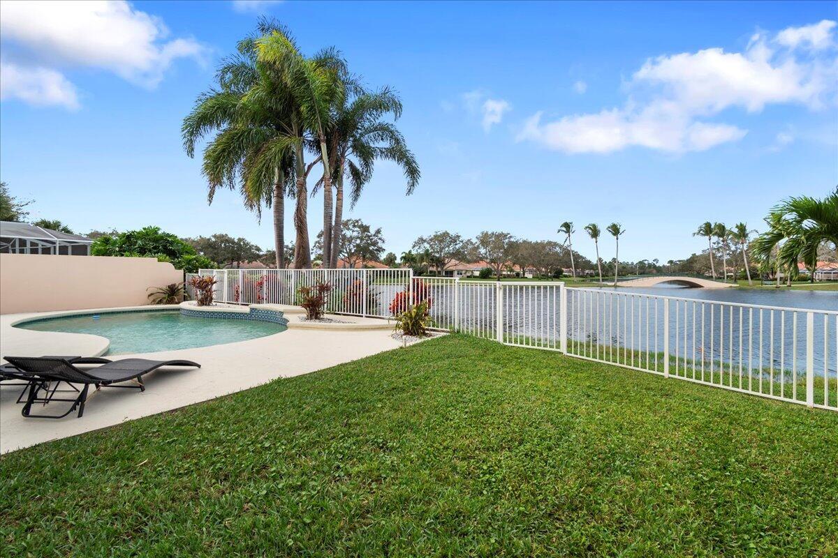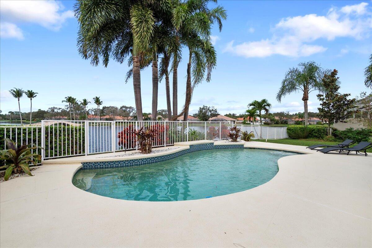 Exceptional gated Expanded Oakmont home in Riverwalk w extra long lake views on wide fenced lot. Hardly used well cared for home on best quiet lot location. Stunning entrance with high ceilings looks thru home to custom pool with spa jets and waterfall. Exotic landscaping surrounds the entire exterior of home. This spacious 3/3 with dbl doors to office can be used as 4th bedroom. Expanded model boasts additional living room and dining area open to kitchen. Custom exterior electric awnings across back of home. Updated plantation shutters on all doors and windows, fresh interior/exterior paint, new modern lighting and fans, custom entertainment center, spacious 2 car garage with built in cabinets.
