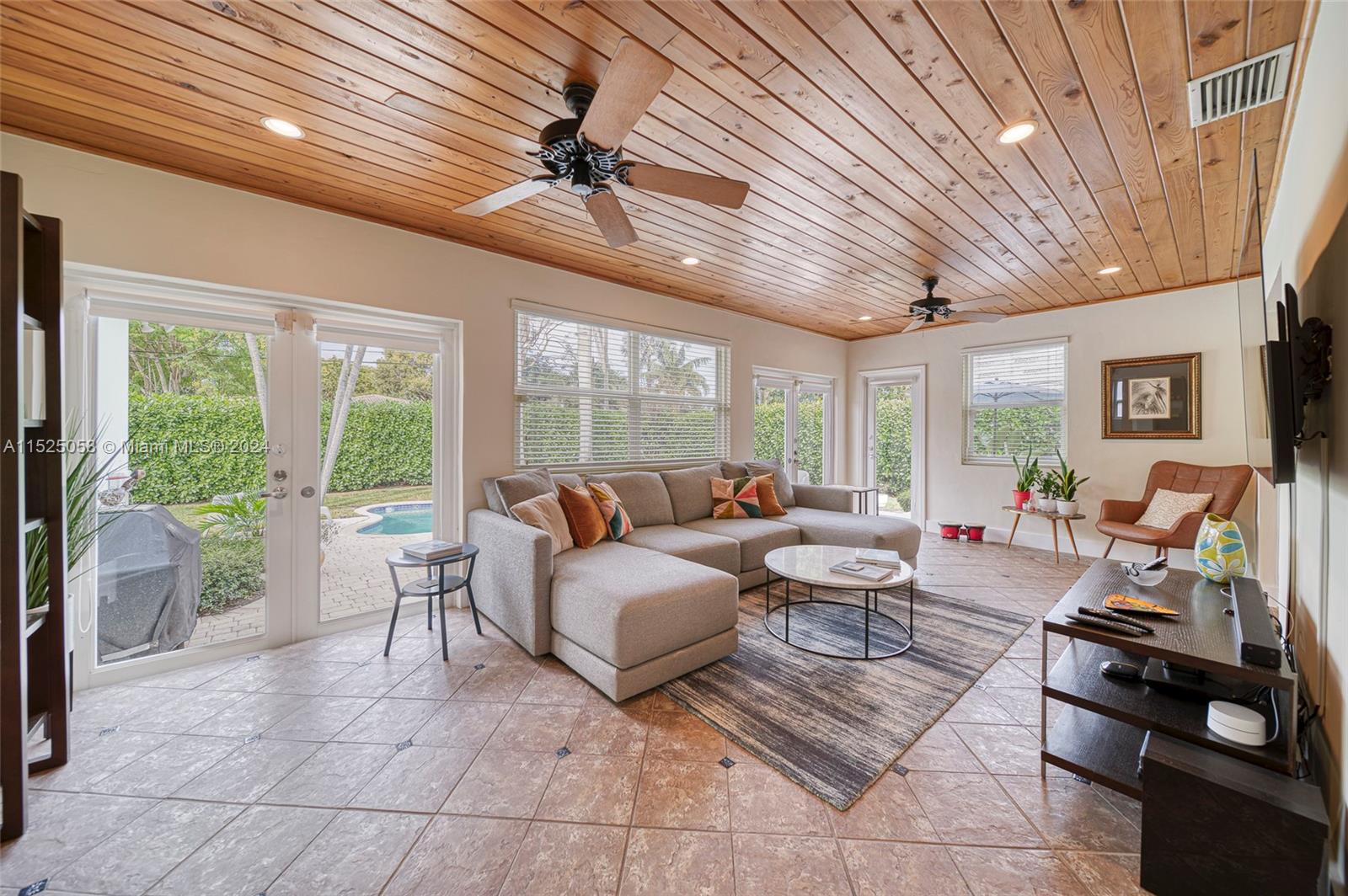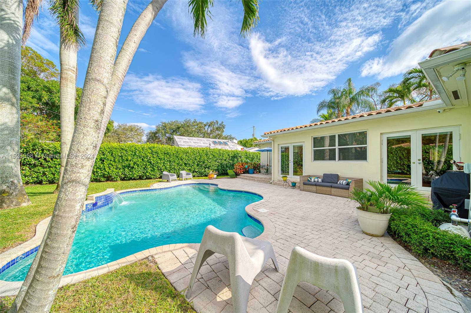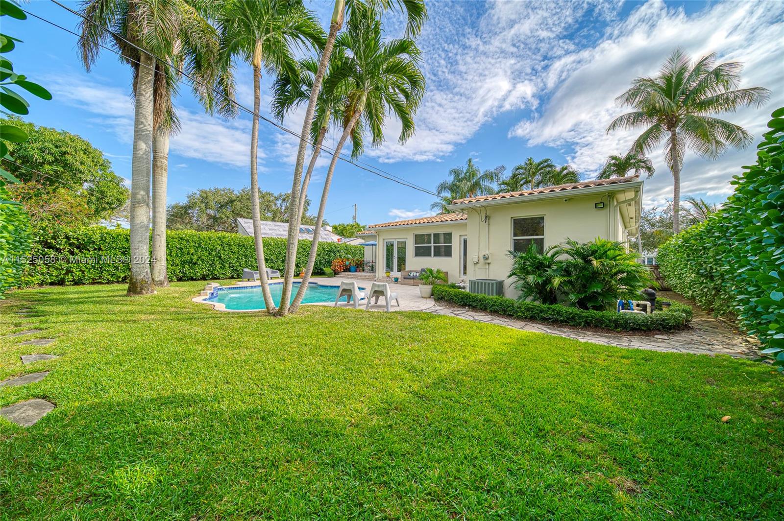 This Miami Shores, 3/2, split, garage, pool, home is a true Mid -Century Gem! A spacious home w/ an open floor plan, Pirello custom kitchen, original inlaid hardwood floors & a beautiful, light-filled sunroom overlooking a private, tropical, freeform, pool oasis! An inviting paver patio greets you as you open any of the back garden facing French doors in the Sunroom or the owners quarters & you will love the convenience of alley access from the back yard. This attractive home offers hurricane rated impact doors & windows, clay barrel tile roof, crown molding, recessed lighting, an attached one car garage w/ washer/dryer & a fully fenced back yard. Wonderful Shores location, walk to downtown Miami shores, drive to I 95, midtown, downtown or beaches in minutes! No flood insurance required!