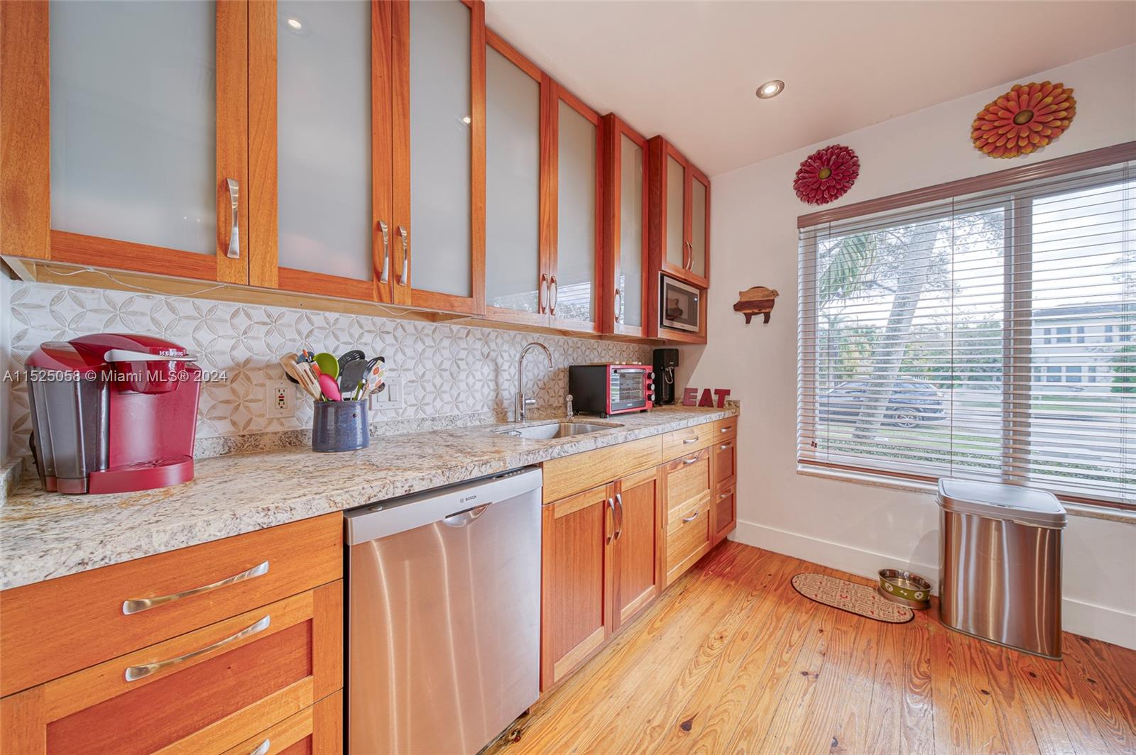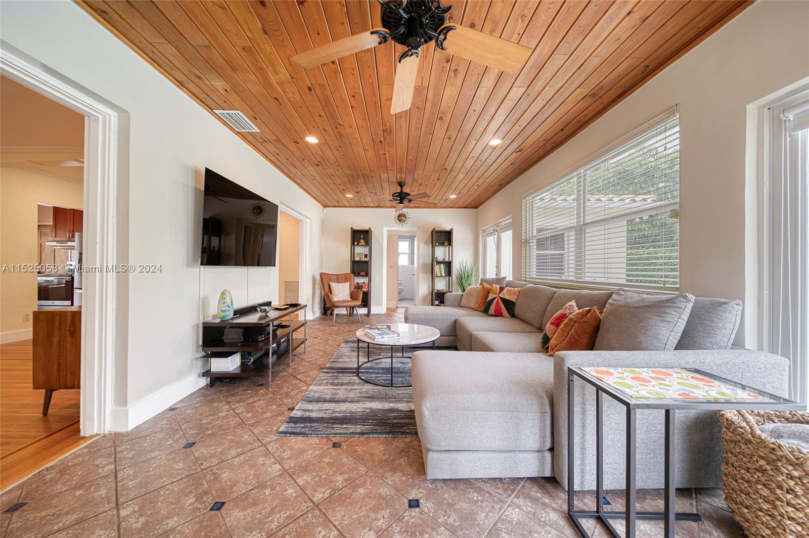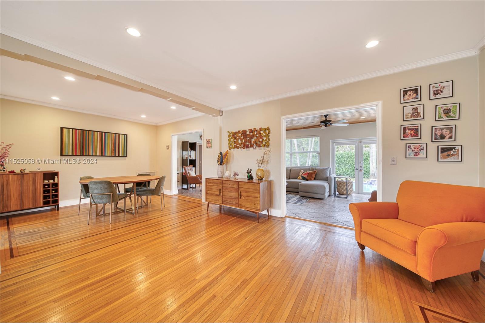 This Miami Shores, 3/2, split, garage, pool, home is a true Mid -Century Gem! A spacious home w/ an open floor plan, Pirello custom kitchen, original inlaid hardwood floors & a beautiful, light-filled sunroom overlooking a private, tropical, freeform, pool oasis! An inviting paver patio greets you as you open any of the back garden facing French doors in the Sunroom or the owners quarters & you will love the convenience of alley access from the back yard. This attractive home offers hurricane rated impact doors & windows, clay barrel tile roof, crown molding, recessed lighting, an attached one car garage w/ washer/dryer & a fully fenced back yard. Wonderful Shores location, walk to downtown Miami shores, drive to I 95, midtown, downtown or beaches in minutes! No flood insurance required!
