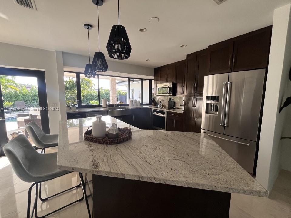 Rarely does a home boasting numerous upgrades and meticulous maintenance become available on the market. Nestled in the sought-after Hollywood Hills, this residence features a 2022 roof with double strap mitigation credit for lower cost homeowners insurnace, impact windows and doors, marble floors in main living areas, a remodeled kitchen with high-end KitchenAid appliances, freshly landscaped surroundings, a new washer and dryer, a new water heater, upgraded bathrooms, a ceiling speaker system, new pool lighting, Tesla setup charging station, new window treatments, and various other enhancements.