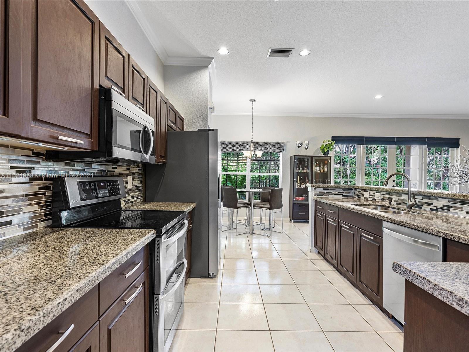 Beautiful one-story single-family home with 4 bedrooms and 2.5 bathrooms in the highly desirable gated community of The Ridges. This home features an open floor plan with spacious living and dining. Large family room. Renovated open Kitchen with wood cabinets, granite countertops, stainless steel appliances, and convenient breakfast area. Tile floors throughout. Fully fence patio with covered area, ideal to entertain. Separate Laundry room. 2-car garage. Community amenities include 24-hour security, clubhouse with pools and water park, several playgrounds, basketball, soccer, volleyball, hockey, tennis, and pickleball courts. Central location, close to I-75, restaurants, shopping, and parks. The community is across the street from the A+ rated Weston middle and high schools.