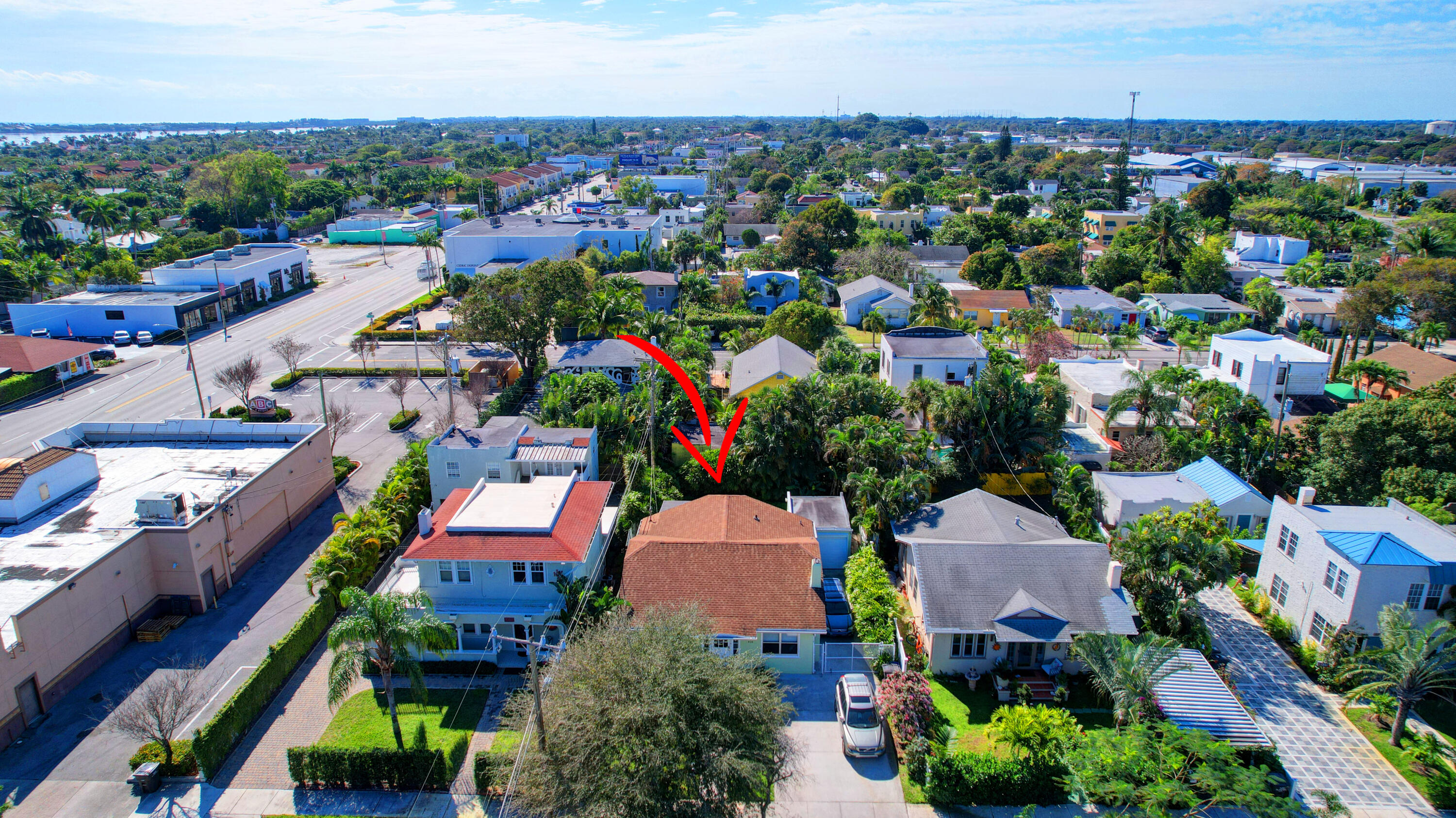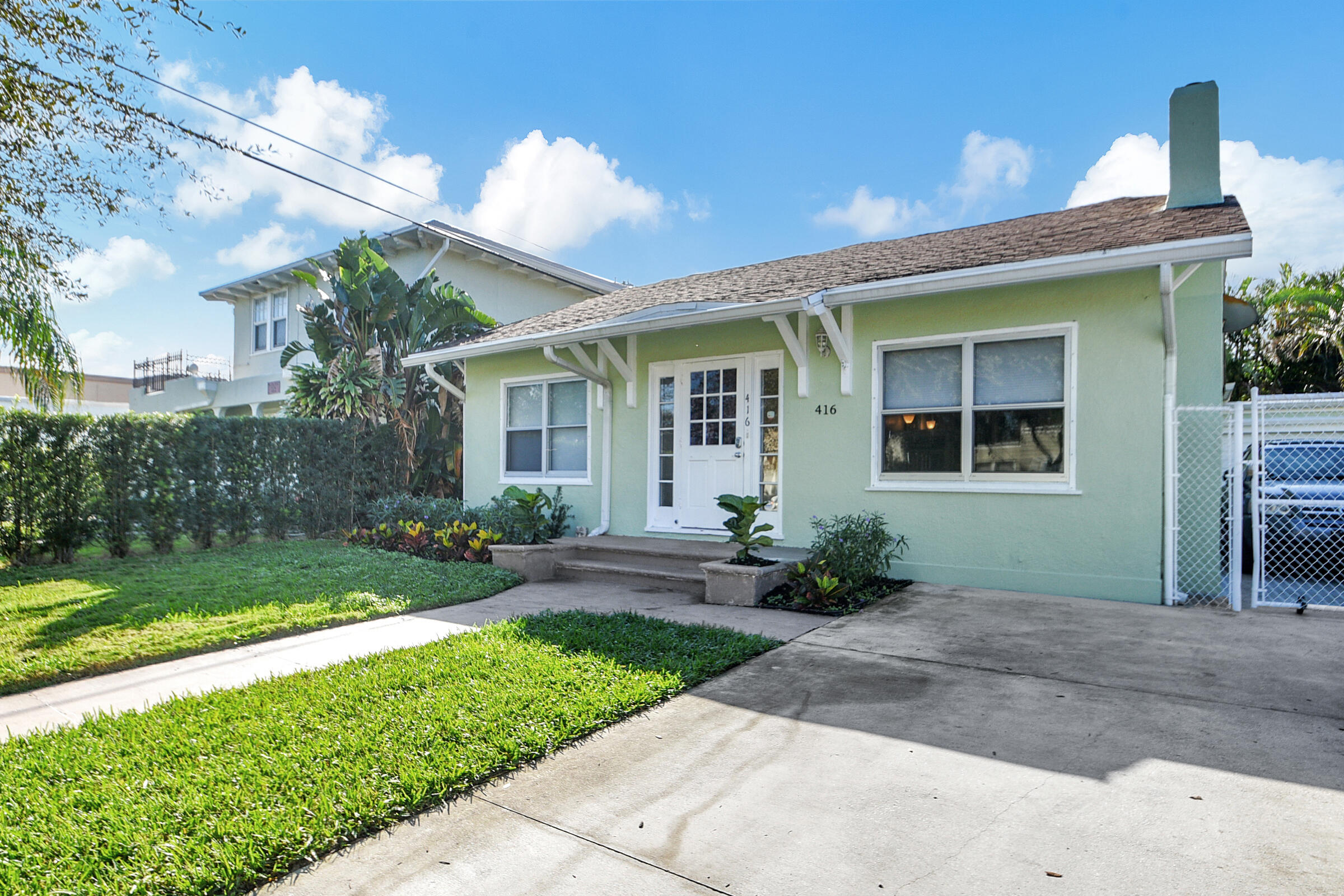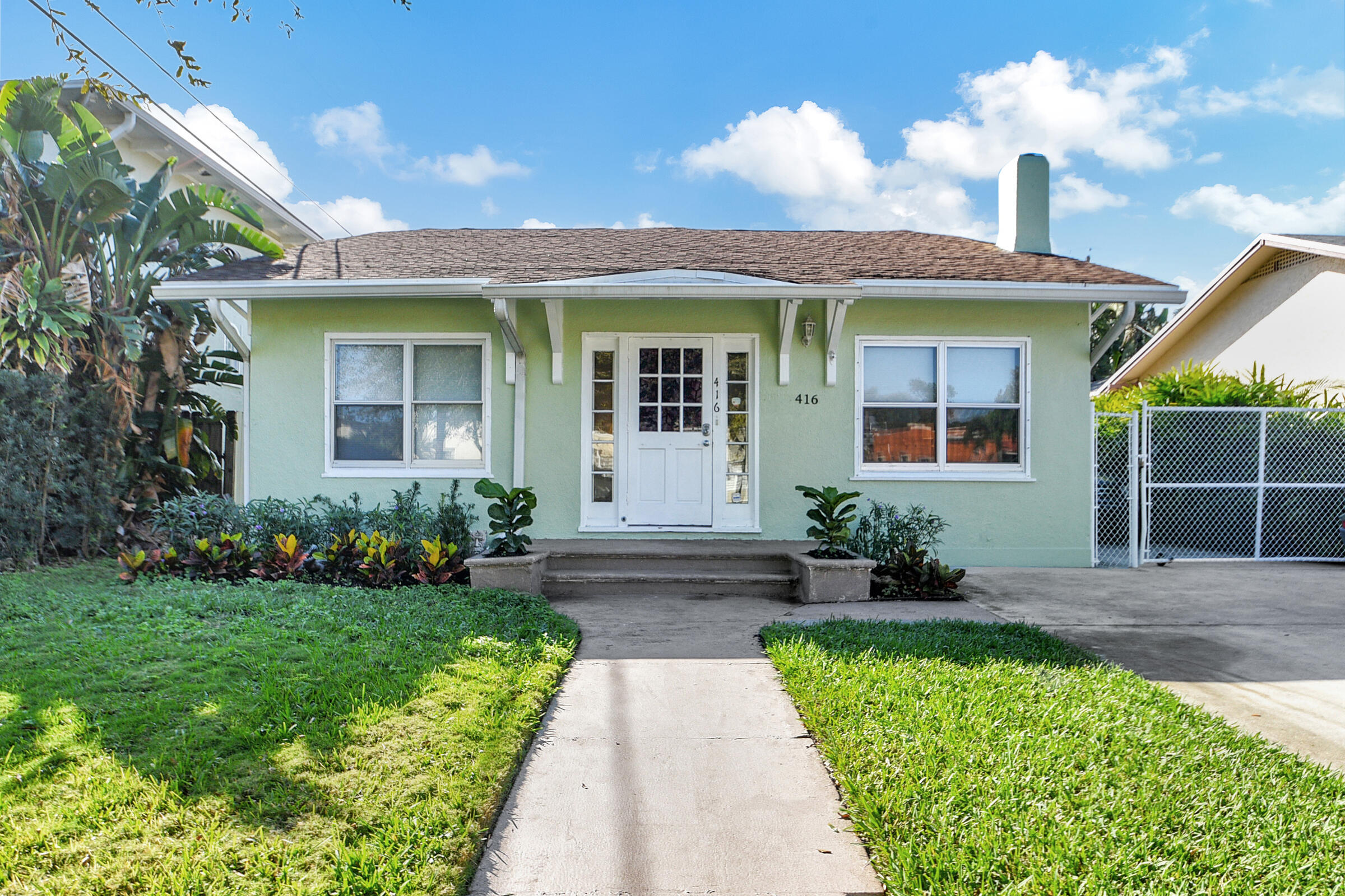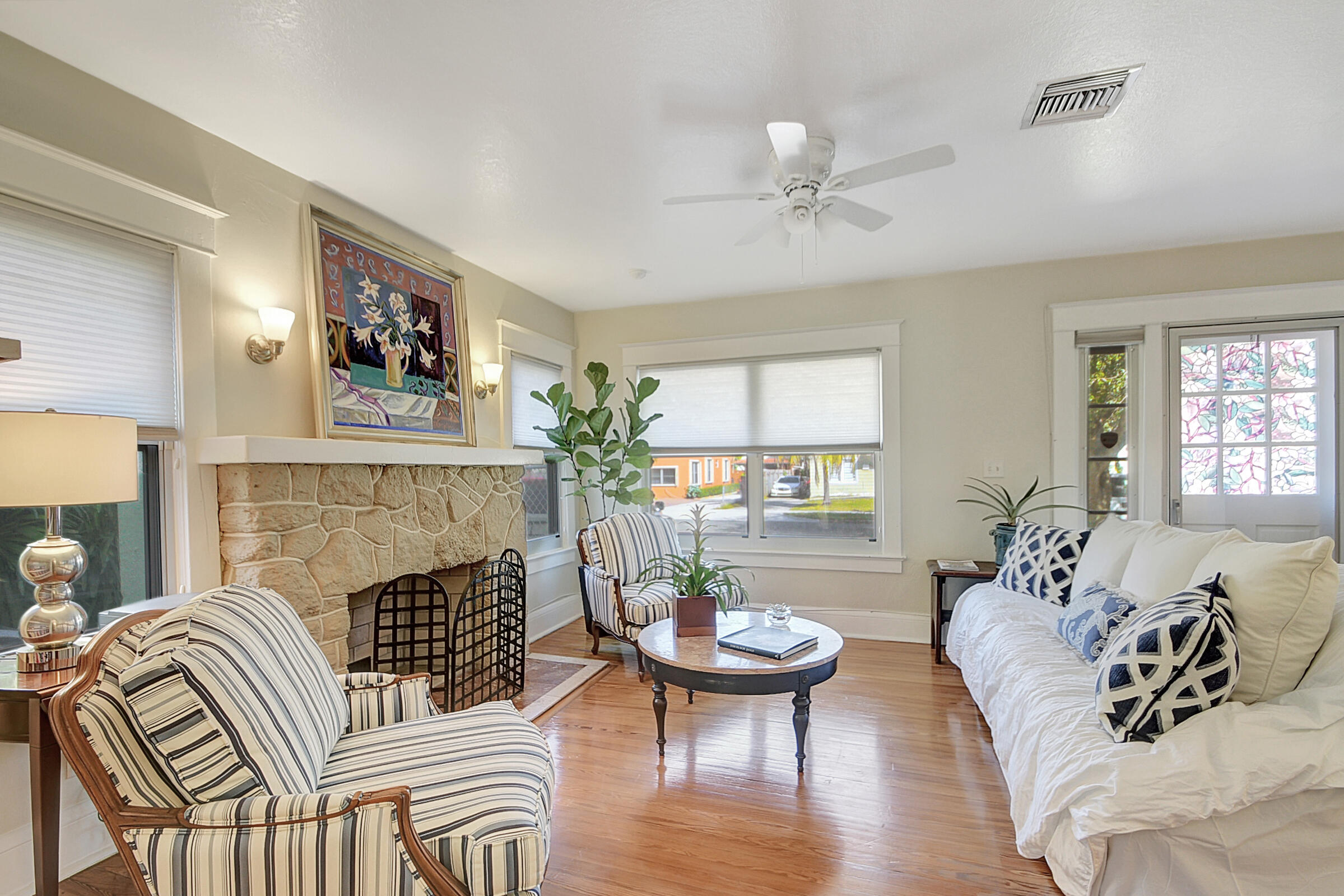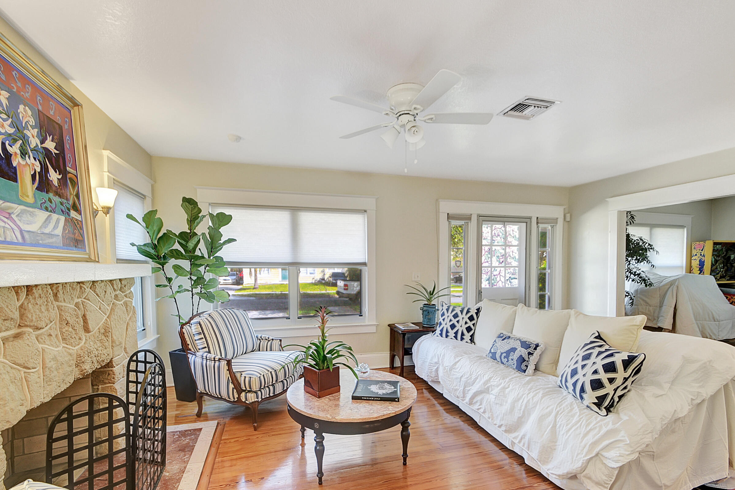 Charming 1931 Key West style house just 4 blocks from the famous Intracoastal Waterway. This home sits where the Design & Dining District meets Antique Row. Gleaming hardwood floors and built-in book cases give this historic home that old Florida character so popular with so many. All the rooms are spacious with fresh paint. Living room with Coquina stone fireplace leads into formal dining room with 3 windows. Kitchen has travertine flooring with granite countertops and a gas range. 2 bedrooms and a den are on the east side of the house. Out back is a 18x12 additional room being used as the primary bedroom. It has exposed wood beamed with pecky cypress ceiling. There is also a mud room off the kitchen that leads into a 1 car garage. Private backyard features outdoor shower. A must see!