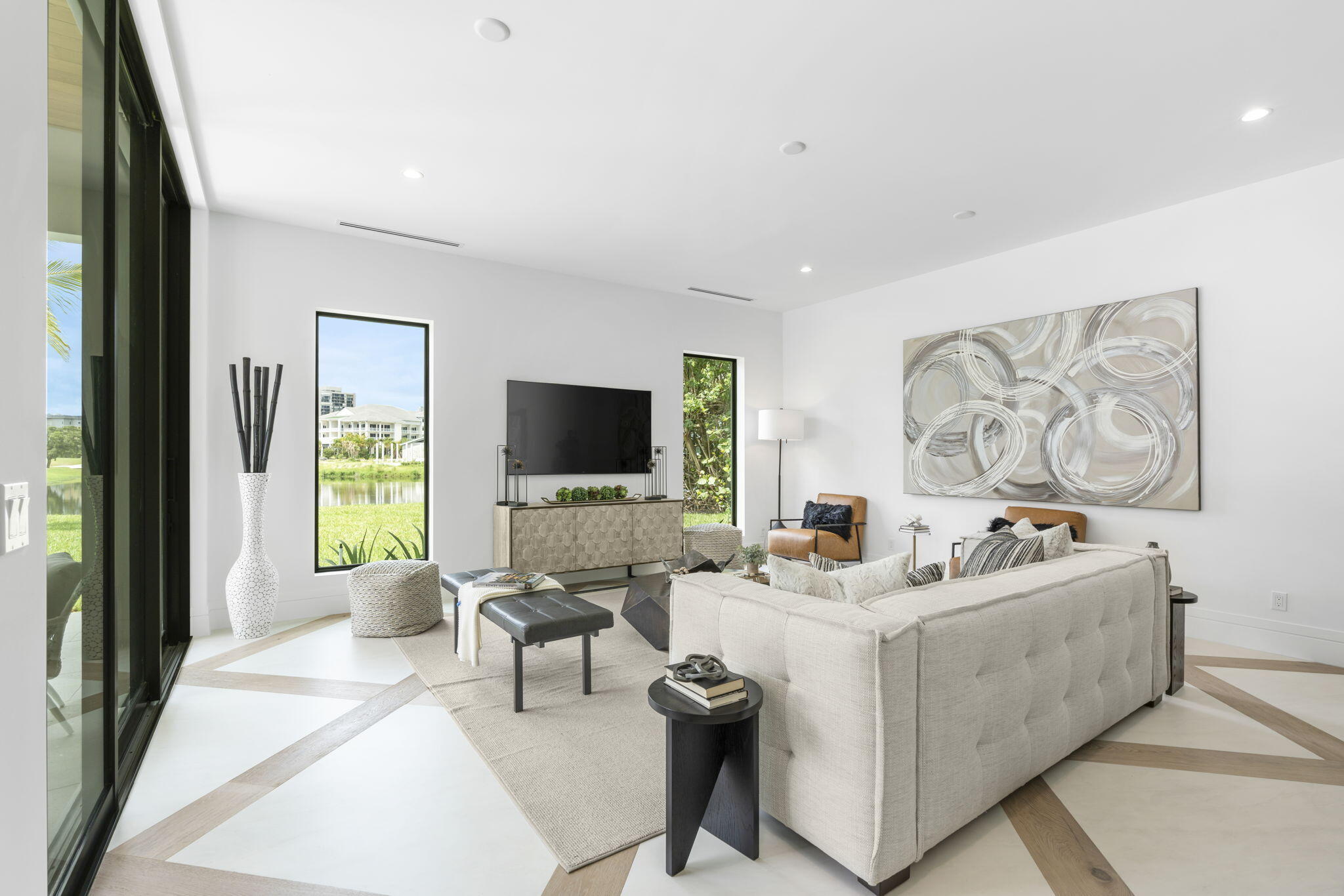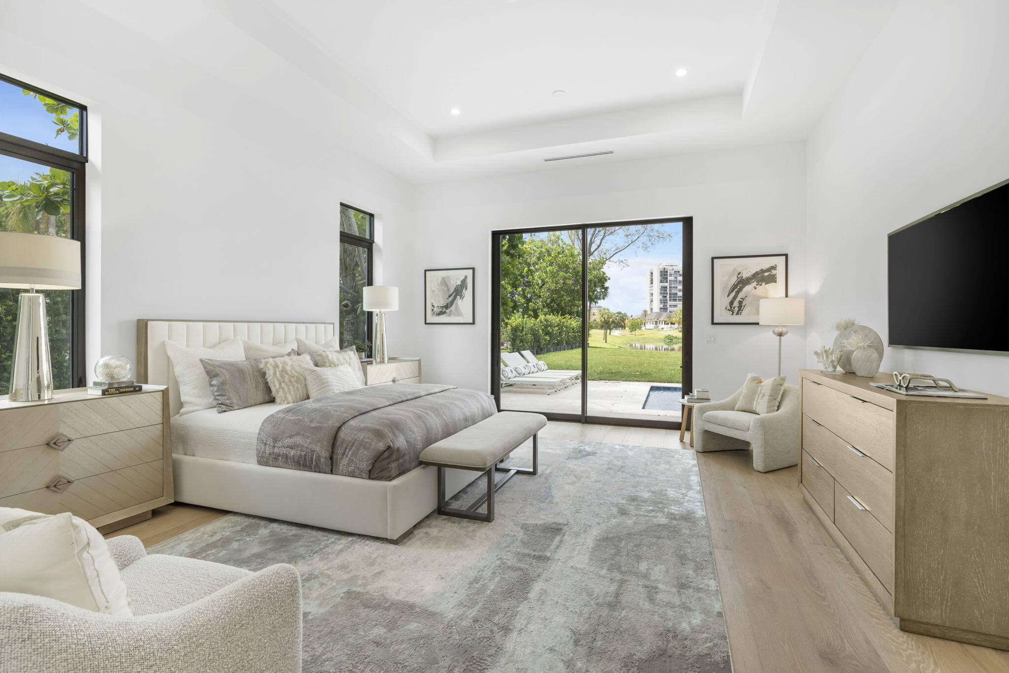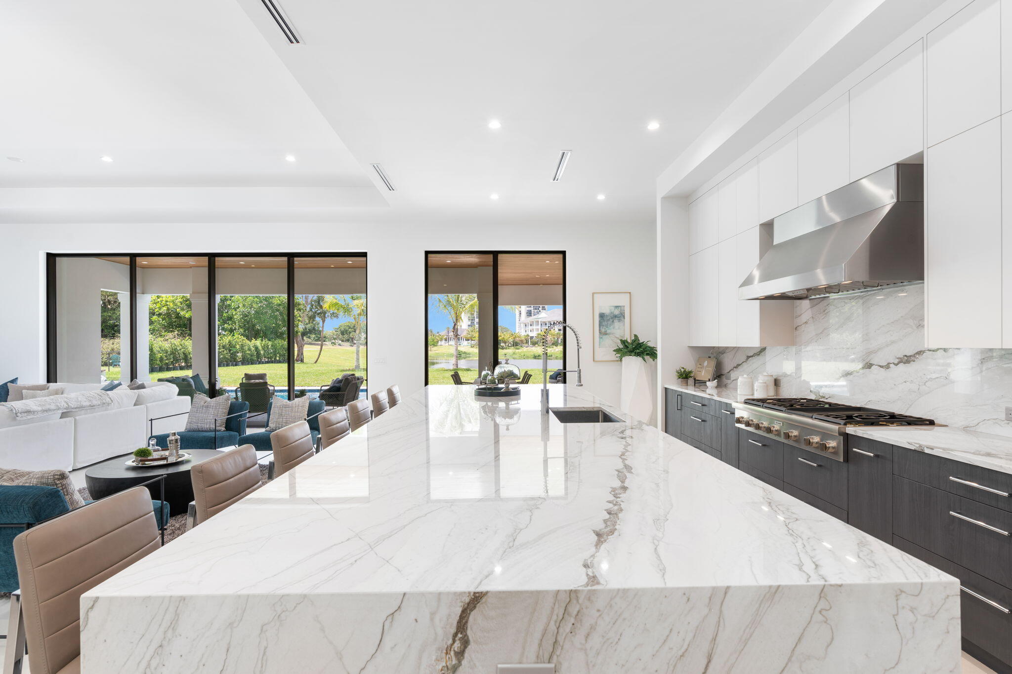 This new construction modern ranch home by Sam Fisch Development features ~6,000 square feet of luxury living on a nearly 1/2 acre lot in the Lands of the President gated community in West Palm Beach. The open-concept great room has soaring 12-foot ceilings and a chef's kitchen with walk-in pantry and spectacular 15-foot island. Seamlessly transition to the covered loggia, summer kitchen, and heated pool/spa, designed for al fresco dining and entertaining against the backdrop of serene lake views. The luxurious primary suite opens up to the outdoor oasis and also includes two expansive walk-in closets, double vanities, and an oversized double shower and freestanding tub. Enjoy waterfront living at its finest in this exclusive gated enclave!