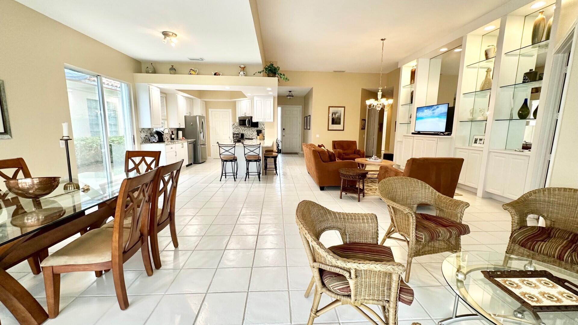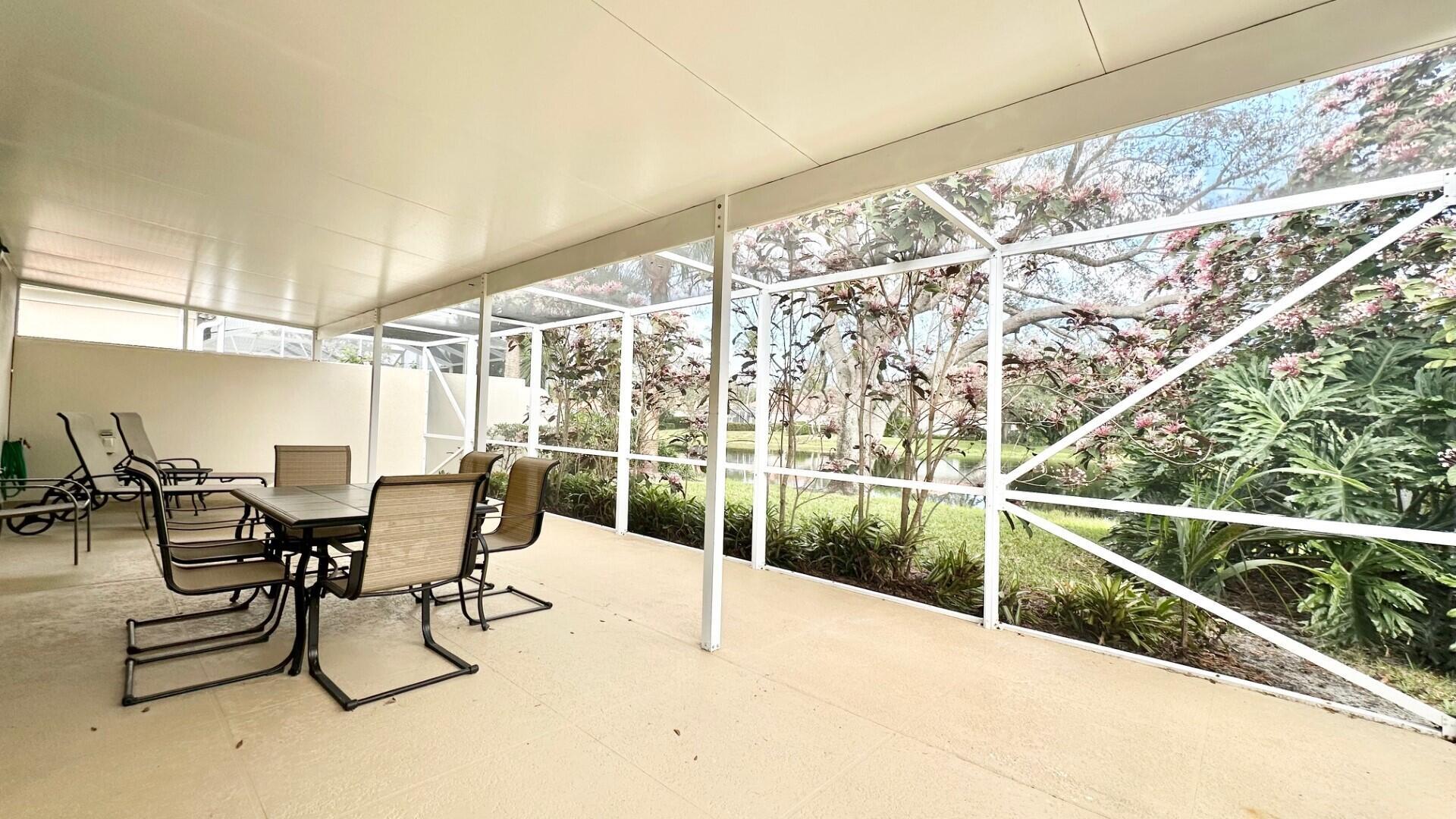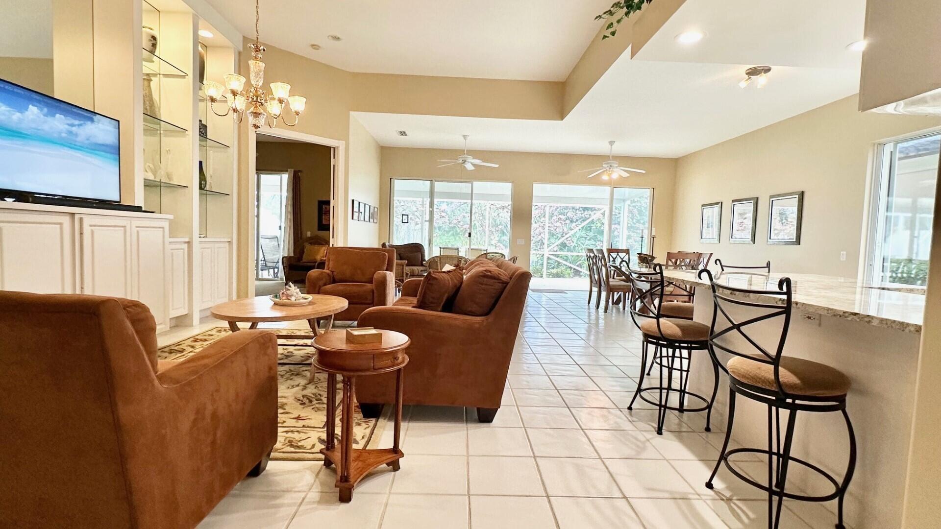 Step into a sanctuary! This ''expanded'' floor plan Oakmont model boasts 12 ft ceilings in the main Great Room area and 10ft elsewhere. The kitchen has been modified to ''open'' the flow of living, kitchen and dining areas and has beautiful granite countertops in neutral grey/white tones and top of the line stainless appliances. The large primary bedroom is a unique suite with two private bathrooms, easily accomodates a king size bed and has sliding doors that lead to the large outdoor living space. Sip your morning coffee and enjoy the beautiful weather on your private covered and screened patio overlooking the tranquil wide lake views. This home has been meticulously cared for by its snowbird owner. The AC is approximately 4 years old, the main living areas are tiled, carpet in bedroom