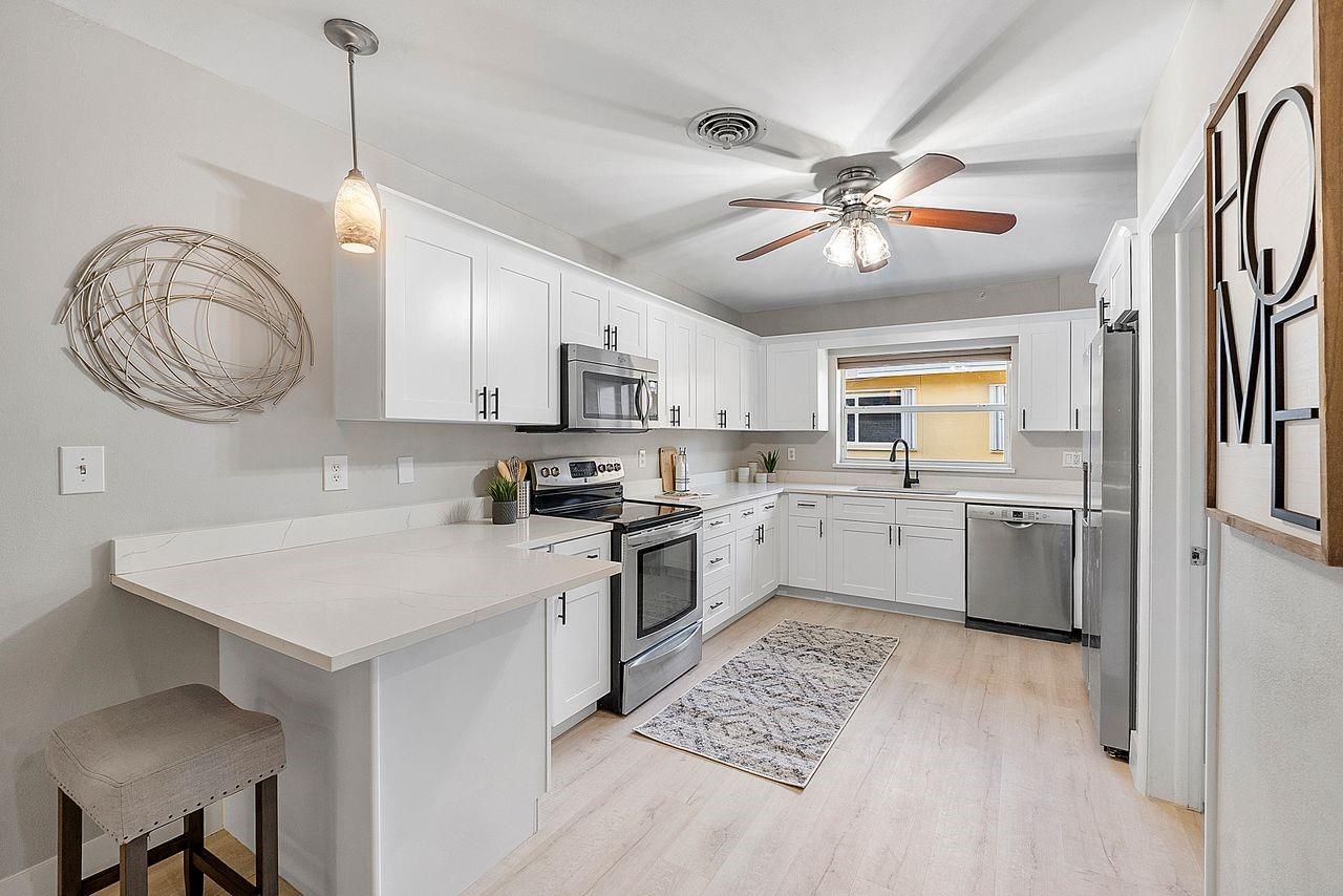 Welcome to this turnkey Coral Ridge Isles Oasis. This remodeled 4-bed, 2-bath pool home with a 2024 NEW ROOF features new luxury vinyl flooring throughout, recessed lighting, new paint and a skylight. The remodeled kitchen (2023) features sleek white shaker cabinets, quartz countertops, and a spacious walk-in pantry. Lots of storage with extra closets and an expansive two-car garage with an automatic hurricane-proof door. Stay comfortable year-round with dual air conditioners (new in 2021 and 2023) and full hurricane protection. This home offers additional upgrades including an upgraded sprinkler system (2023), replaced attic insulation (2023), and pool resurfaced with gemstone and adorned with new tile, filter, and skimmer (2024). Your relaxation awaits in the sprawling backyard.