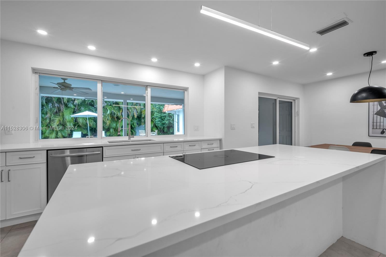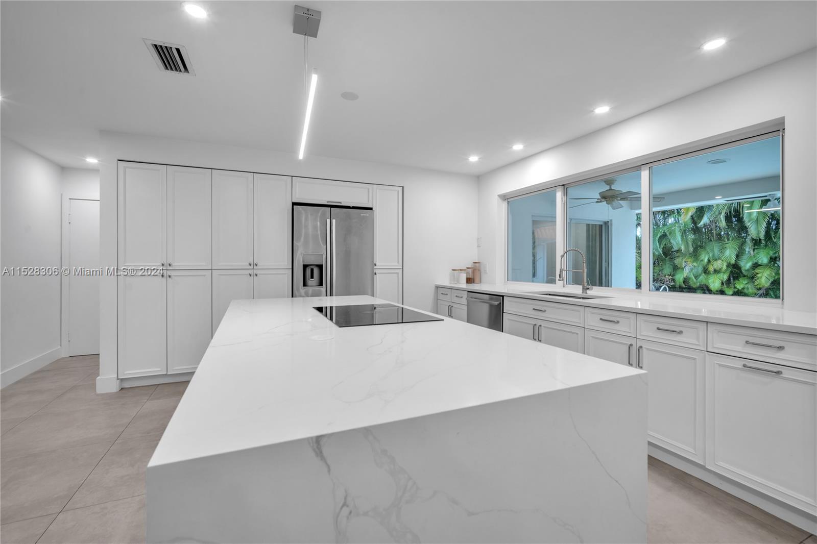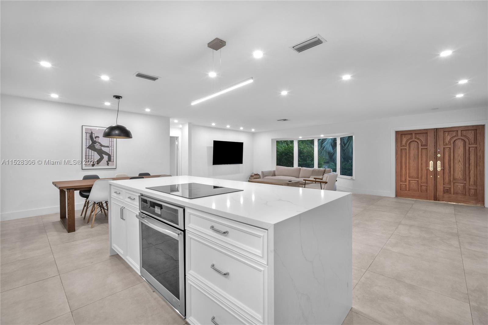 Beautiful location in Hollywood Lakes surrounded by waterfront homes. A few houses from intracostal this pool home with 2-car garage is situated on an oversized lot. As you approach the home, you are greeted by lush landscaping and a grand circular driveway, providing ample parking spaces. Step inside to discover a beautifully renovated kitchen, featuring a center island with quartz countertops/waterfall. The home provides an open concept with the kitchen/living/dining area. The Master Suite has access to the pool/patio area with a renovated glass-enclosed shower. Split floorplan with tile throughout & renovated bathrooms. Oversized pool with a covered terrace and Travertine marble pool deck. Impact windows, sprinkler system, and laundry room! A must-see home close to the famous Broadwalk.